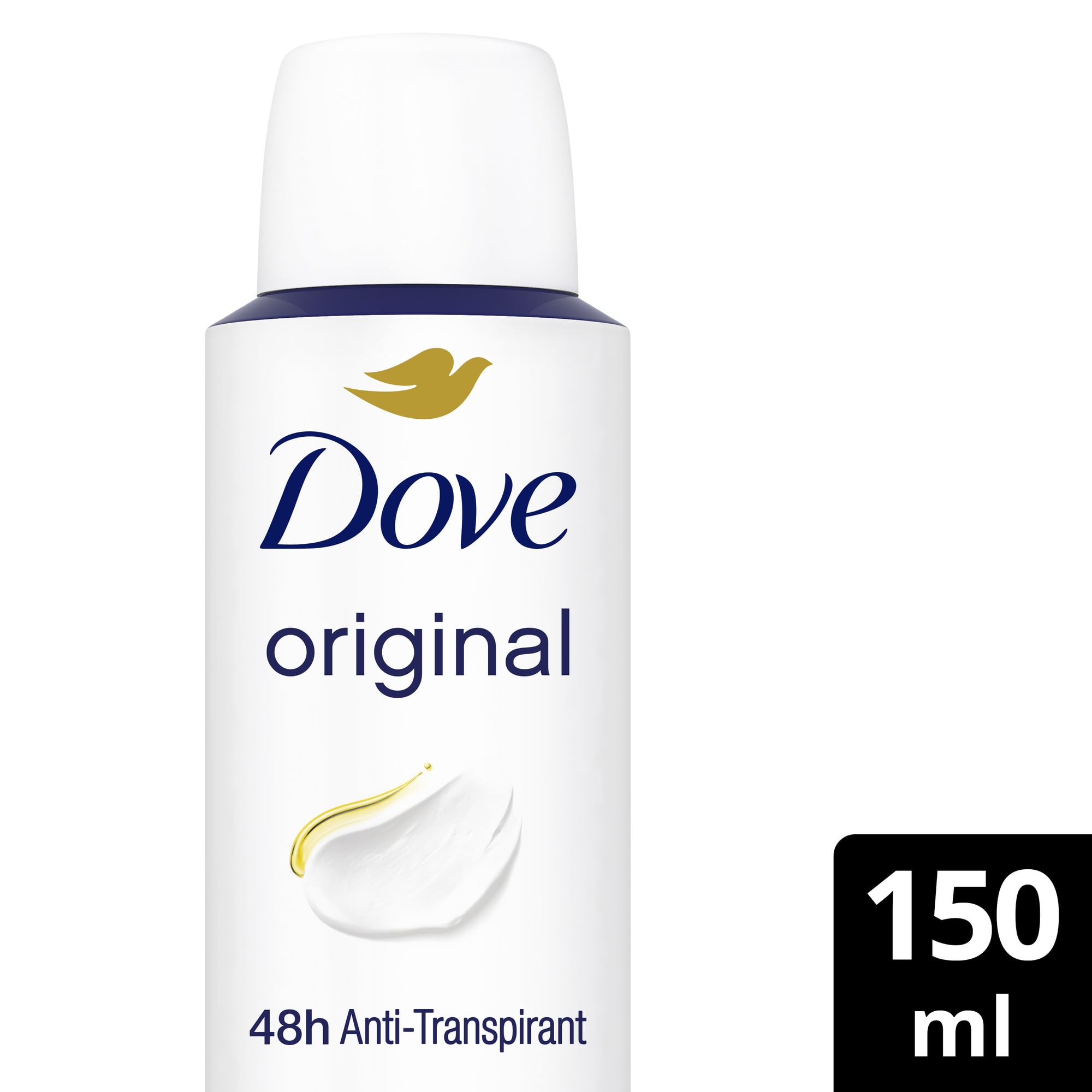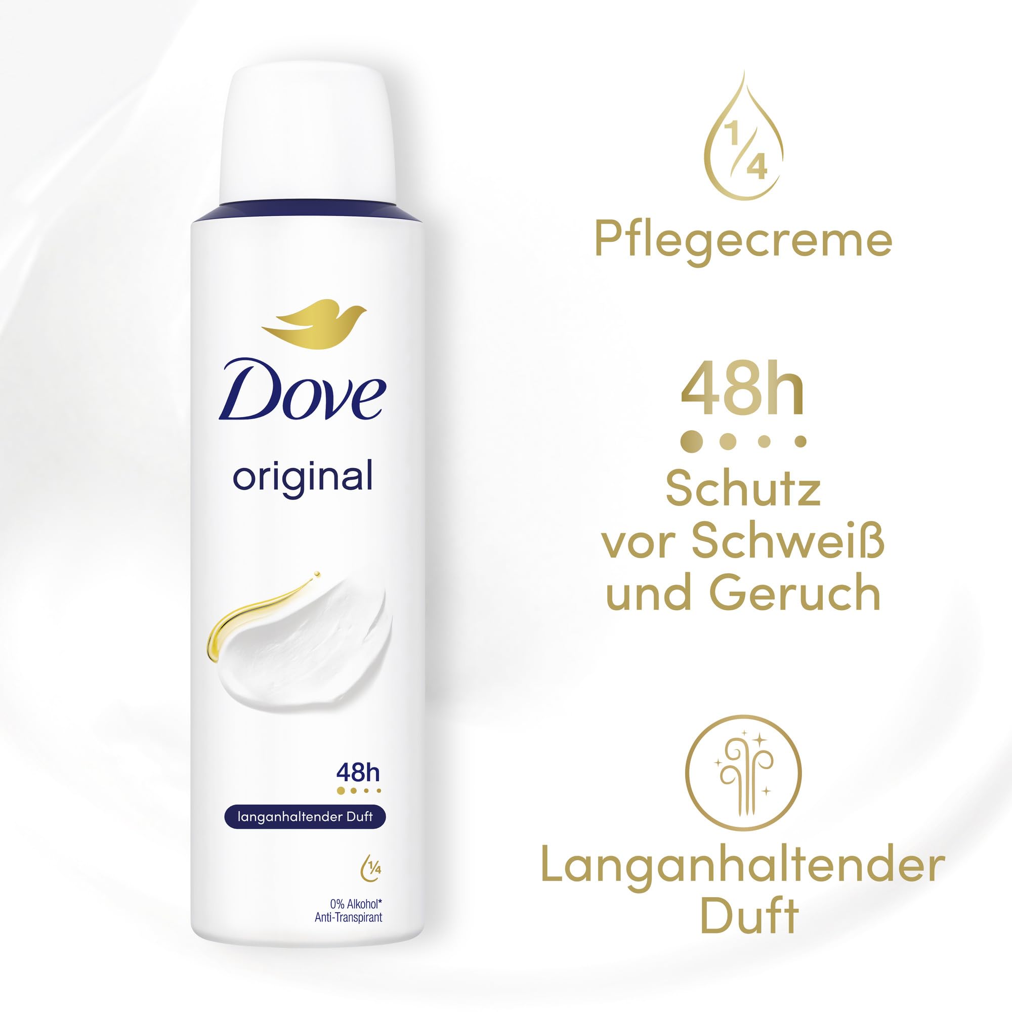 Dove Anti Transpirant Deo Spray Original, 48h Schutz, 0% Alkohol, mit 1/4 Pflegecreme, PETA-vegan, 150 ml