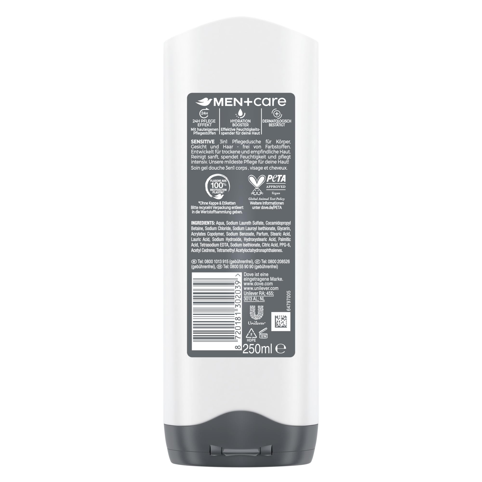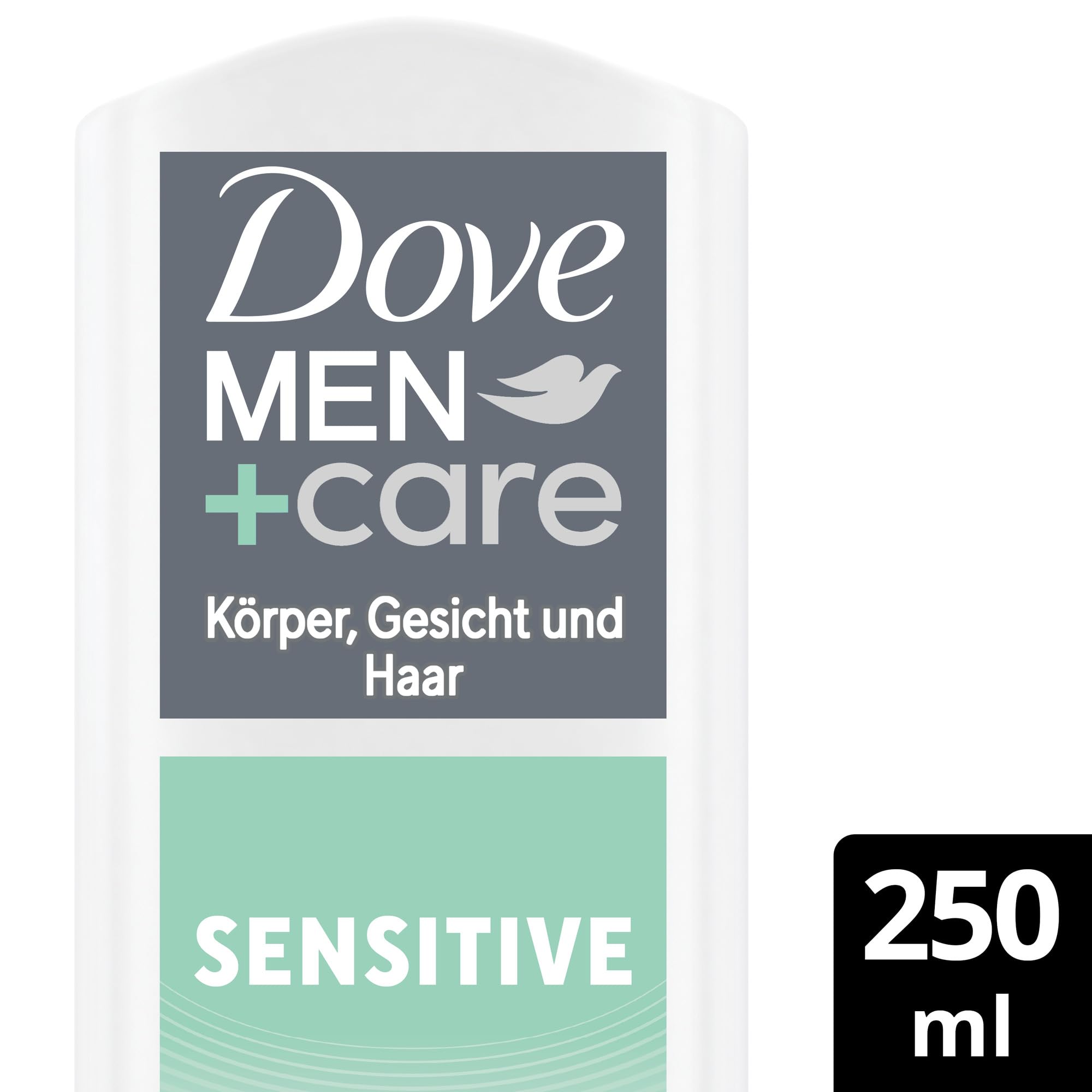 Dove Men+Care 3-in-1 Duschgel Sensitive – Pflegedusche für Körper, Gesicht und Haar, Empfindliche Haut, 250 ml