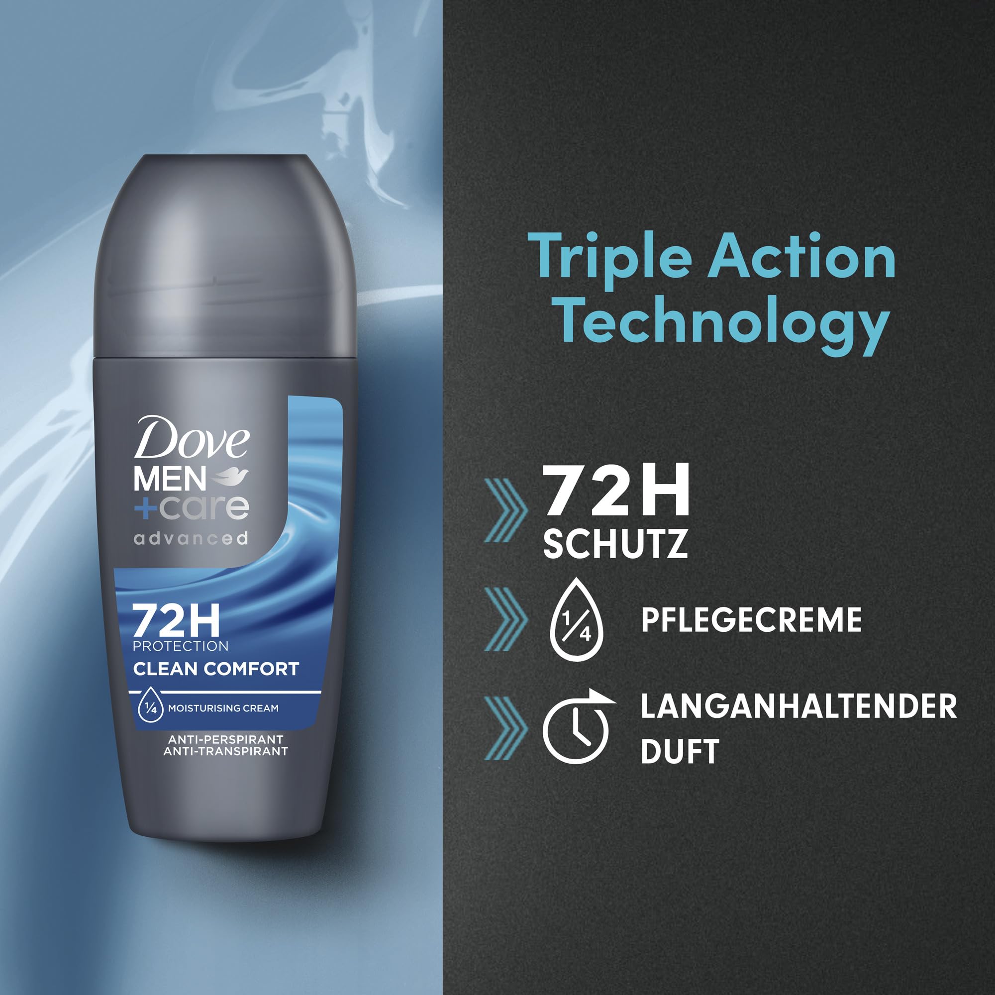 Dove Men+Care Advanced Anti Transpirant Roll-On Clean Comfort, 72h Schutz, Triple Action Technology, mit 1/4 Pflegecreme, Duft Zitrone und Zedernholz, 6 x 50 ml