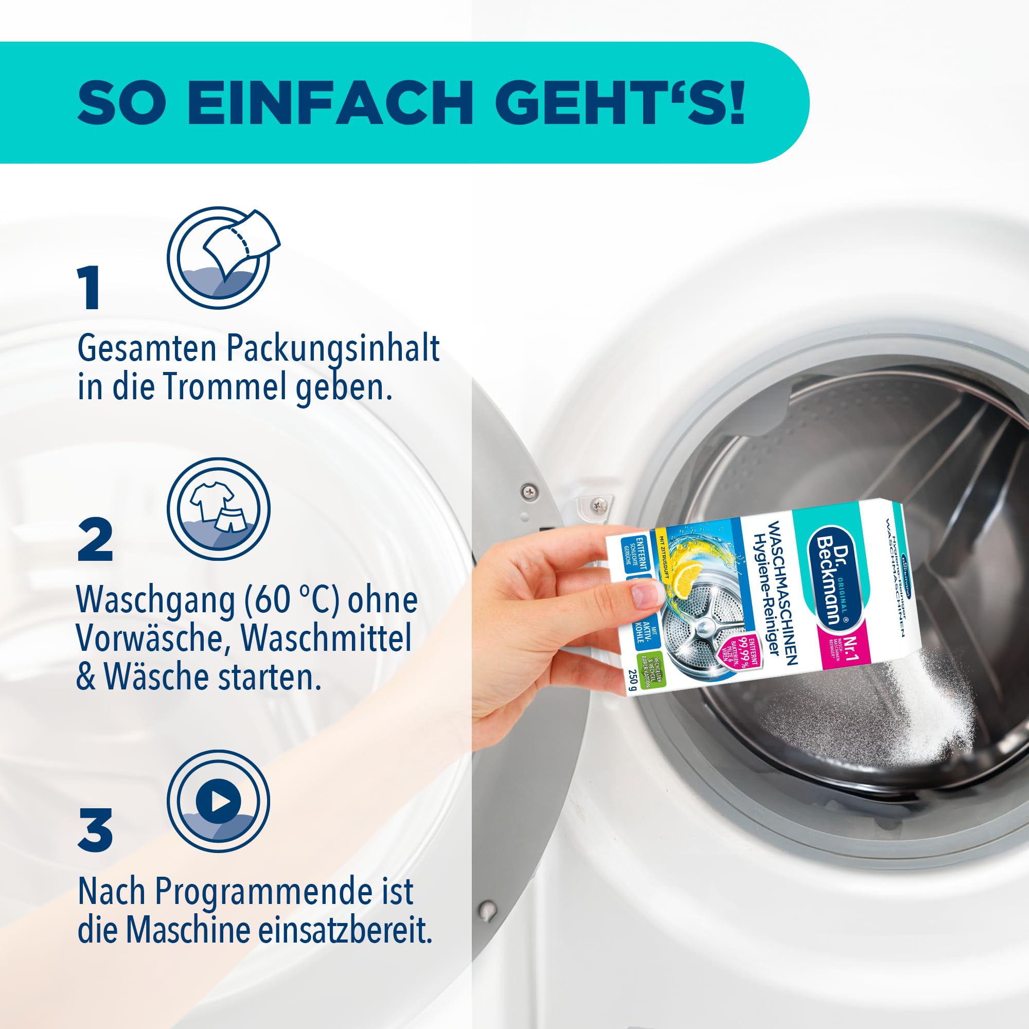 Was kann die Ursache für stinkende oder schimmlig riechende Waschmaschinen oder muffige, modrig riechende Wäsche sein? Und wie befreit der Dr. Beckmann Waschmaschinen Hygiene-Reiniger Ihre Waschmaschine von üblen Gerüchen? Viele Textilien vertragen keine hohen Waschtemperaturen. Doch gerade durch häufiges Waschen bei niedrigen Temperaturen und falscher Dosierung von Waschmitteln, Weichspülern, etc. bauen sich nach und nach unterschiedlichste Rückstände auf. Ein sogenannter Biofilm entsteht, der sich gut sichtbar oft auch im Dichtungsgummi absetzt. Dieser kann mit der Zeit unangenehme Gerüche verursachen. Durch eine andauernde Feuchtigkeit in der Waschtrommel und dem umgebenden Laugenbehälter wird die Entstehung von Mikroorganismen in Form von Pilzen und Bakterien begünstigt, die bei Niedrigtemperaturen nicht vollständig beseitigt werden können. Der Dr. Beckmann Waschmaschinen Hygiene-Reiniger mit Aktivkohle reinigt gründlich das innere Ihrer Waschmaschine und erreicht selbst schwer zugängliche Teile der Waschmaschine. 99,9% der Bakterien und Pilze werden entfernt und durch eine spezielle Hygiene-Frische-Formel werden unangenehme Gerüche vollständig eliminiert. Bei einer regelmässigen Anwendung des Hygiene-Reinigers bleibt die Waschmaschine hygienisch sauber und die Wäsche behält ihren frischen Duft. Anwendung: 1. Den gesamten Packungsinhalt direkt in die Waschtrommel geben 2. Hauptwaschgang (mind. 60 °C) ohne Vorwäsche, ohne Waschmittel und ohne Wäsche starten. 3. Nach der Reinigung der Maschine ist diese sofort wieder einsetzbar. Wichtige Hinweise: Biozidprodukte vorsichtig verwenden. Vor Gebrauch stets Etikett und Produktinformationen lesen.