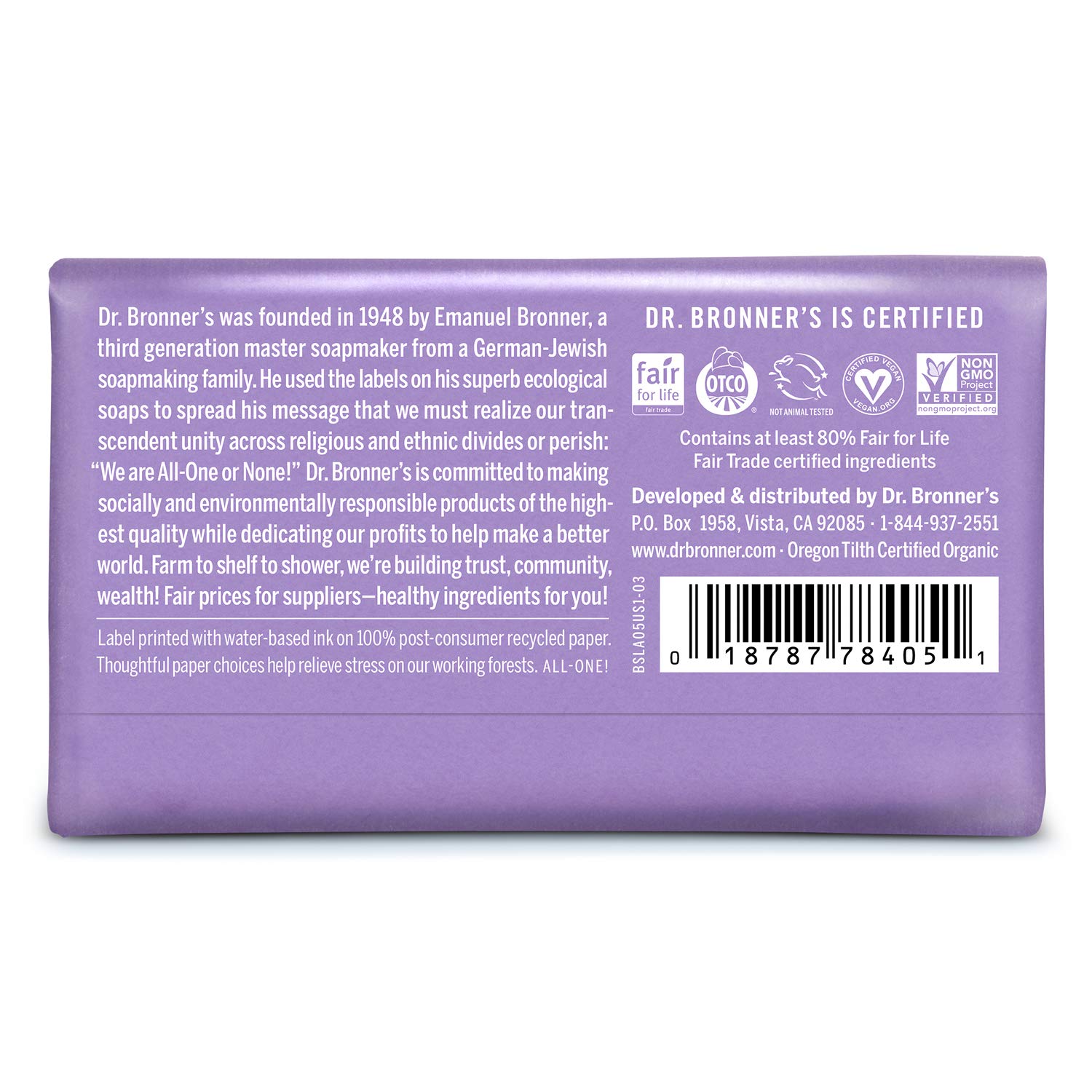 Dr. Bronner's Pure-Castile Bar Soap - Lavender, 5oz. (Pack of 6) by Dr. Bronner's