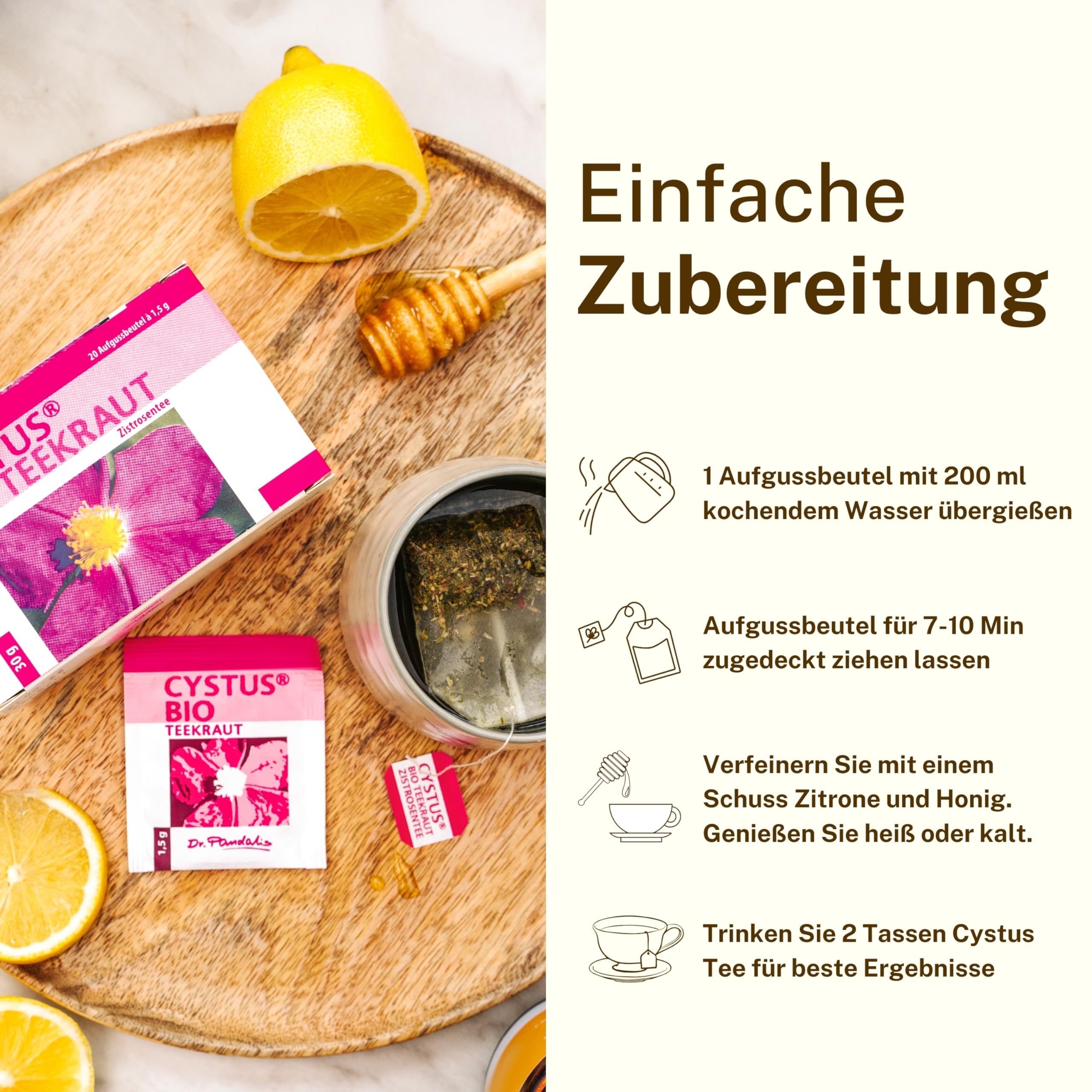 Dr. Pandalis - Zistrosentee - 20x 30g Cistus Tee Aufgussbeutel - Cistus Incanus Tee in Premium BIO-Qualität - Cystus Bio Tee - Das Original aus der Apotheke - Cystrosentee nach althergebrachter Weise 100% Cistus x incanus L. Pandalis (Kraut) aus kontrolliert biologischem Anbau Unser Cystus Bio Tee (Zistrose Bio Tee und Cistus bio Tee) ist auch für Kinder, Schwangere und Stillende geeignet. Gebrauchsanweisung: Pro Tasse einen Aufgussbeutel / einen Teelöffel (ca. 1,5 g) Cystus Bio Teekraut mit kochendem Wasser übergiessen und - je nach Geschmack – 7 bis 10 Minuten ziehen lassen. Unser Tip: - mit Zitrone und Honig verfeinern. - Kalt gemischt mit Fruchtsäften oder als Eistee zubereitet ist der Cystus Bio Tee ein ideales Erfrischungsgetränk - Variation: Für einen besonders intensiven herb-aromatischen Geschmack gibt man das Teekraut mit kaltem Wasser in einen Kochtopf, bringt den Tee zum Sieden und lässt ihn ca. 5 Minuten mit aufgelegtem Deckel weiter köcheln Einzig die Sorte „Cistus x incanus L. Pandalis“ ist gemäss der Durchführungsverordnung (EU) 2017/2470 zugelassen und darf somit als einzige Sorte der Pflanzenart „Cistus Incanus“ in der EU auch als Teekraut in den Verkehr gebracht werden. Alle anderen Cistus Incanus Tees, die sich mit behördlicher Duldung im Handel befinden, sind somit nicht zugelassenes Novel Food. Aktuell warnt sogar die Verbrauchzentrale vor falsch deklarierten Cistus incanus Tees. All unsere Zistrosen-Tees enthalten ausschliesslich die von Dr. Pandalis entdeckte Zistrosenvarietät Cistus x incanus L. Pandalis. Die vier unterschiedlichen Produktnamen ergeben sich aus der Geschichte: Früher wurde z. T. nach Erntezeitpunkt und –region unterschieden.