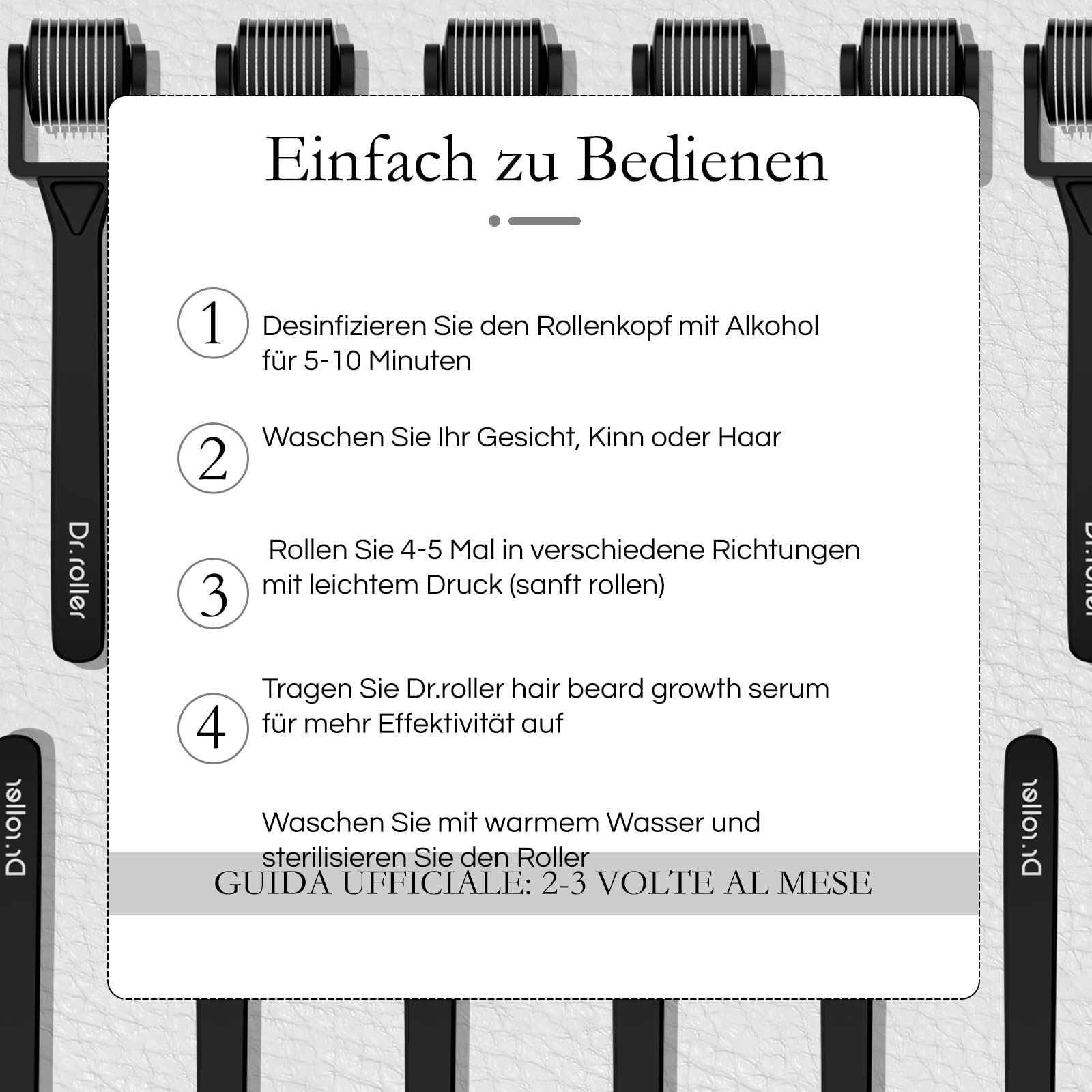 Der Dr. Roller Derma Roller 1 mm ist ein hochwertiger Microneedling Roller, der speziell zur Förderung des Bartwuchses, zur Haarwuchsstimulation und der Behandlung von Hautunregelmässigkeiten entwickelt wurde. Mit 540 Titan Nadeln eignet sich dieser Derma Roller ideal für die Anwendung an Gesicht, Kopfhaut und Körper, um Haare zu stimulieren, Narben zu reduzieren und das Hautbild zu verbessern.