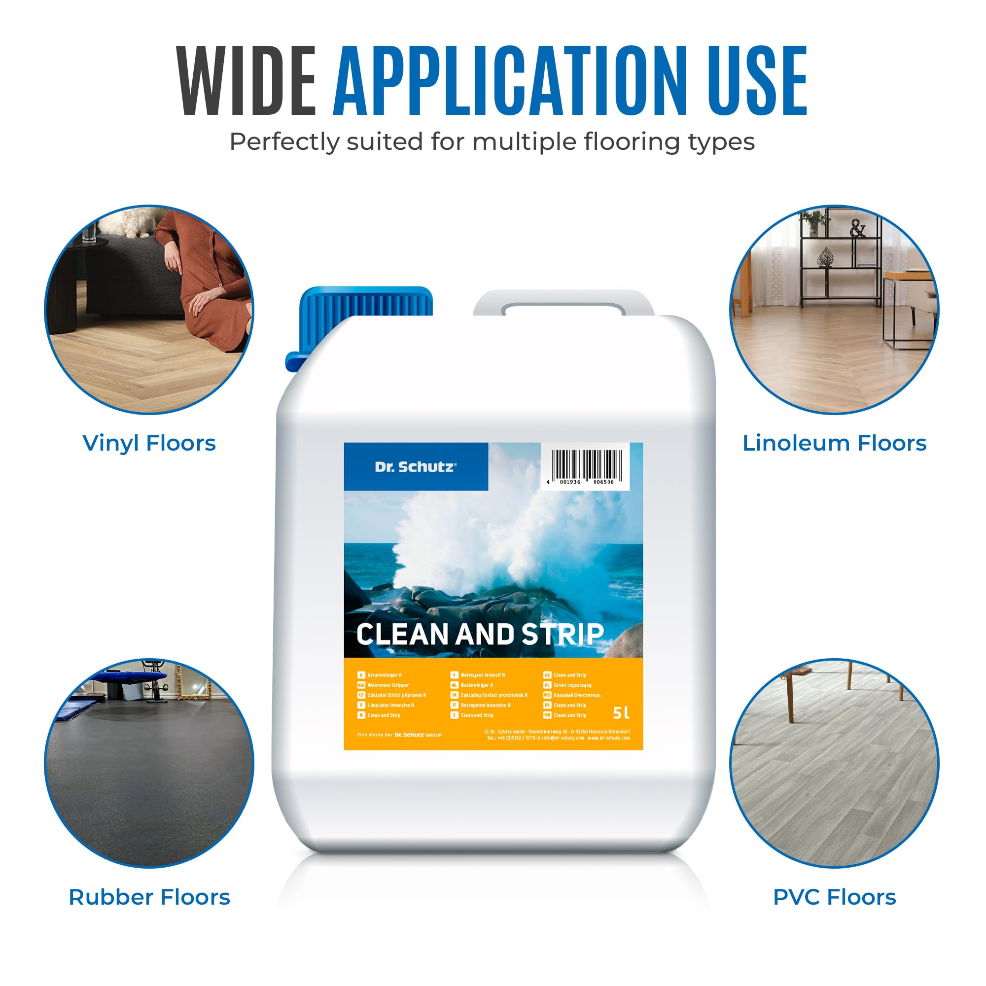 Der Dr. Schutz Grundreiniger R im 5 Liter Kanister ist geeignet für die intensive Reinigung von Kunststoffböden wie PVC-Böden, CV-Böden, Polyolefin-Böden und Linoleum-Böden sowie Natursteinböden, Kunststeinböden und Kautschuk-Böden. Der in Deutschland hergestellte Grundreiniger entfernt hartnäckige Flecken, Klebereste, Pflegefilme und Wachsschichten zuverlässig. Ideal für die Bauendreinigung oder nach einem Umzug. Dr. Schutz Produkte werden von den führenden Bodenherstellern in Deutschland und weltweit ausdrücklich empfohlen.