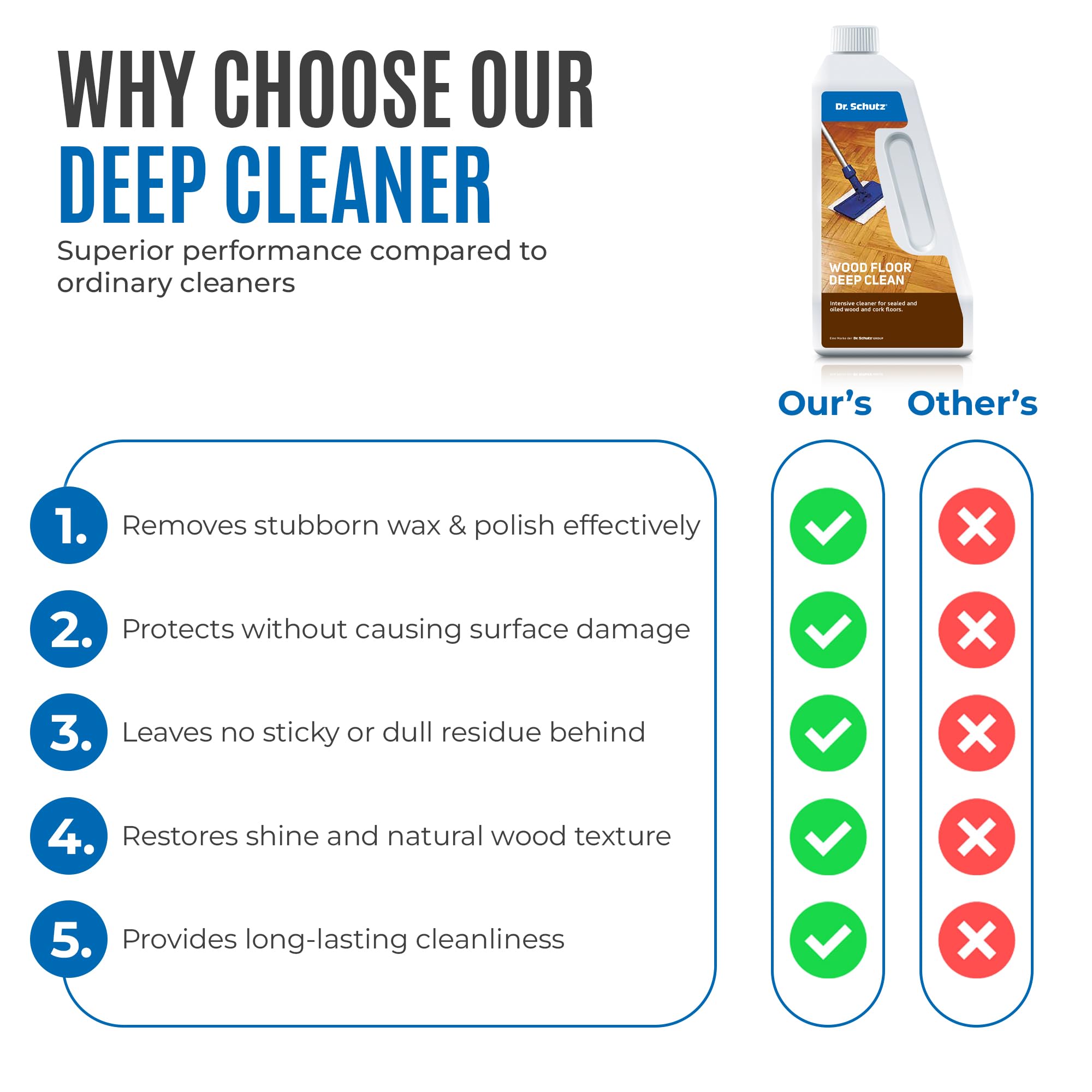 Der Dr. Schutz Intensivreiniger für den Parkettboden und Korkboden im 750 ml Gebinde ist ein Spezial-Reiniger zur Entfernung alter Rückstände von Wischpflegemitteln und Polymerdispersionsfilmen. Für eine optimale Grundreinigung bei wasserfest versiegelten Parkettböden und Korkböden. Auch geeignet als Intensivreiniger für geölte und gewachste Böden. Das in Deutschland hergestellte Reinigungskonzentrat lässt Ihren Boden wie neu aussehen und in neuem Glanz erstrahlen. Dr. Schutz Produkte werden von den führenden Bodenherstellern in Deutschland und weltweit ausdrücklich empfohlen.