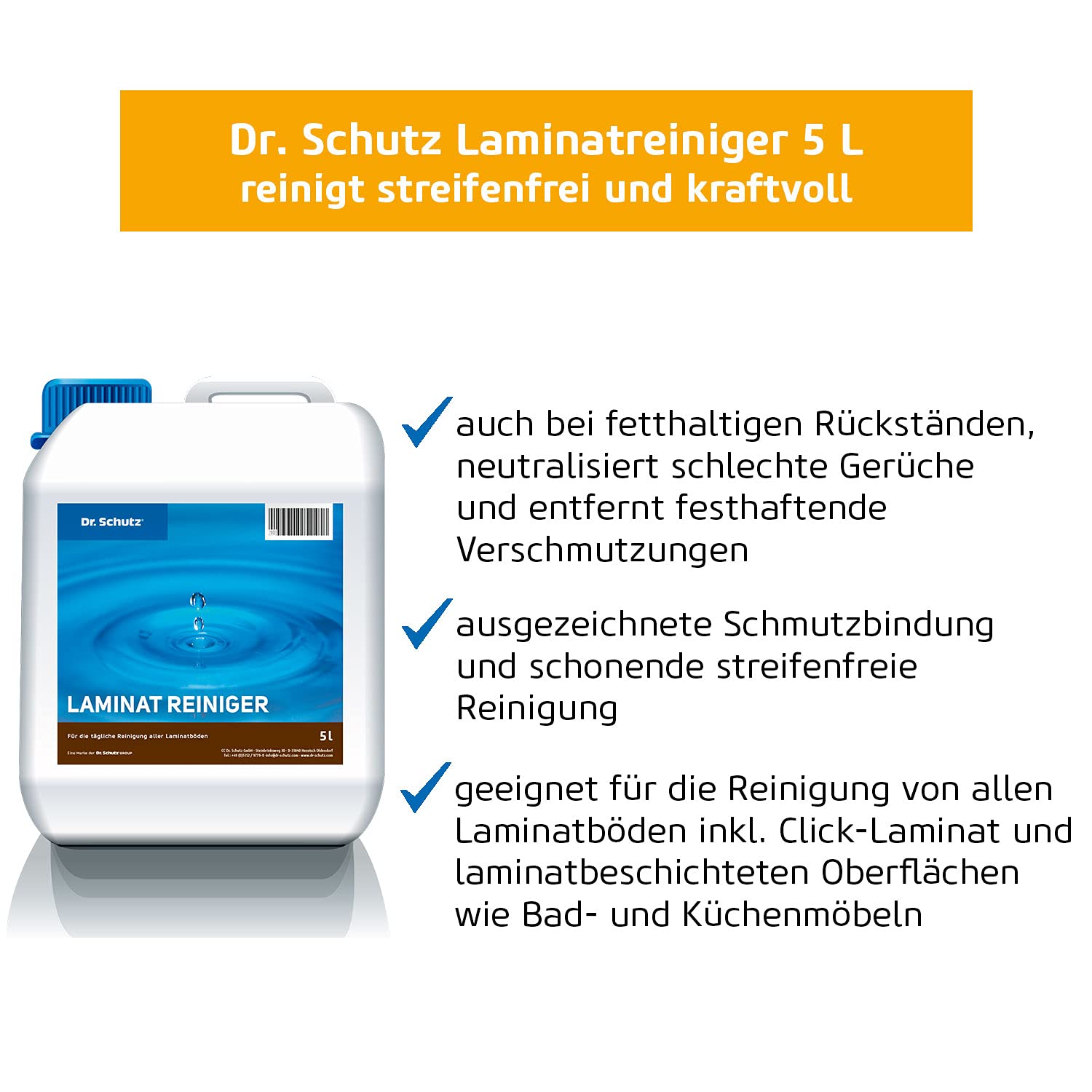 Mit dem Dr. Schutz Laminatreiniger 5 L wird die Reinigung empfindlicher Laminatböden ein Leichtes. Das in Deutschland hergestellte, ergiebige Reinigungskonzentrat reinigt streifenfrei und neutralisiert schlechte Gerüche für eine bessere Raumluft. Der Laminatbodenreiniger entfernt selbst fettige Rückstände und hartnäckige Verschmutzungen. Dr. Schutz Produkte werden von den führenden Bodenherstellern in Deutschland und weltweit ausdrücklich empfohlen. Laminatboden reinigen wie die Profis!