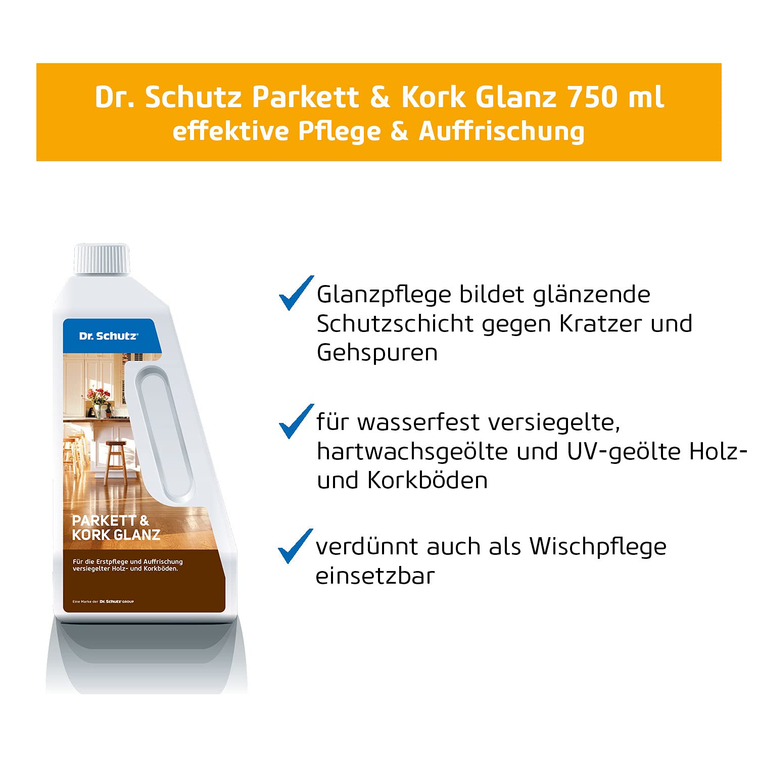 Dr. Schutz Parkett und Kork Glanz im 750 ml Gebinde ist eine metallfreie, wachshaltige Polymerdispersion für die Pflege und Auffrischung aller wasserfest versiegelten, hartwachsgeölten und UV-geölten Holz- und Korkfussböden. Er bildet einen glänzenden Pflegefilm auf allen wasserfest versiegelten Holz- und Parkettfussböden und bietet maximalen Schutz vor Kratzern und Gehspuren. Das Dr. Schutz Pflegemittel ist wasserbasiert und wischfest nach der Trocknung. Mithilfe dieser Dr. Schutz Holzboden Pflege erstrahlt Ihr Parkettboden und Korkboden in neuem Glanz. Dr. Schutz Produkte werden von den führenden Bodenherstellern in Deutschland und weltweit ausdrücklich empfohlen. Auch für Ihren Korkfussboden geeignet.