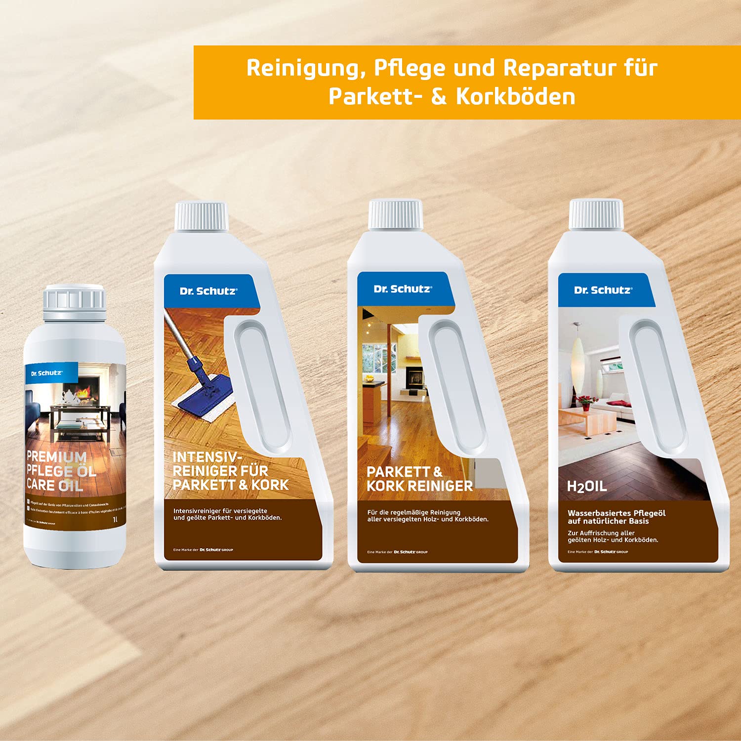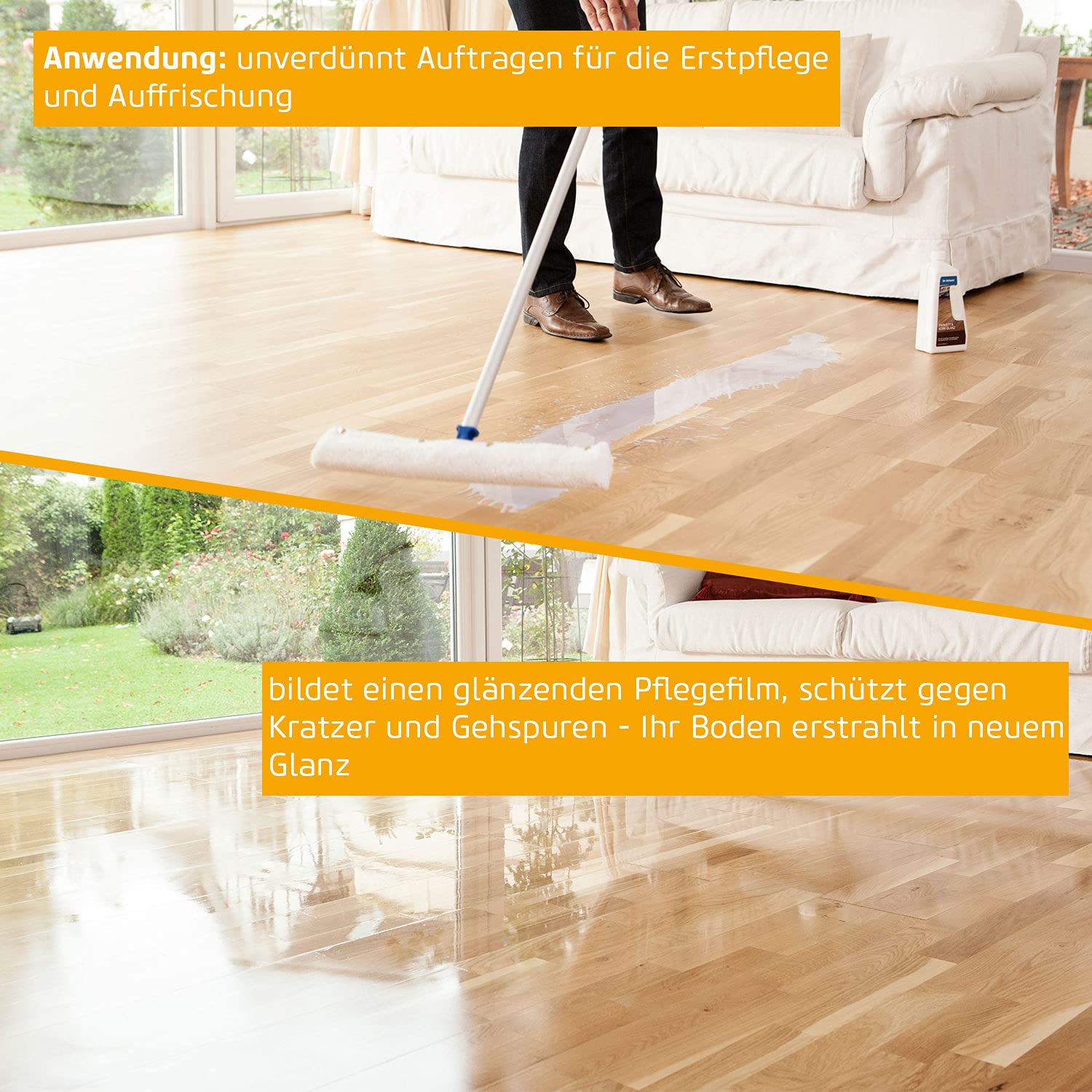 Zunächst den Fussboden grundreinigen. Idealerweise mit dem Dr. Schutz Parkett und Kork Reiniger bei neu verlegtem Boden. Bei älteren Böden die Pflegefilme vorher mit dem Dr. Schutz Parkett und Kork Intensivreiniger entfernen. Parkett und Kork Glanz vor Gebrauch sorgfältig aufschütteln, dann unverdünnt mit dem Dr. Schutz Wischwiesel oder einem flusenfreien Breitwischmopp in dünnem Film auf den gründlich gereinigten Boden in Verlegerichtung auftragen. Für erhöhten Schutz Auftrag wiederholen, wenn der Pflegefilm trittfest ist. Dr. Schutz Parkett und Kork Glanz ist selbsthärtend und muss nicht poliert werden. Fläche vor Benutzung mindestens 12 Stunden trocknen lassen und erst danach mit dem Parkett Pflegemittel behandeln.