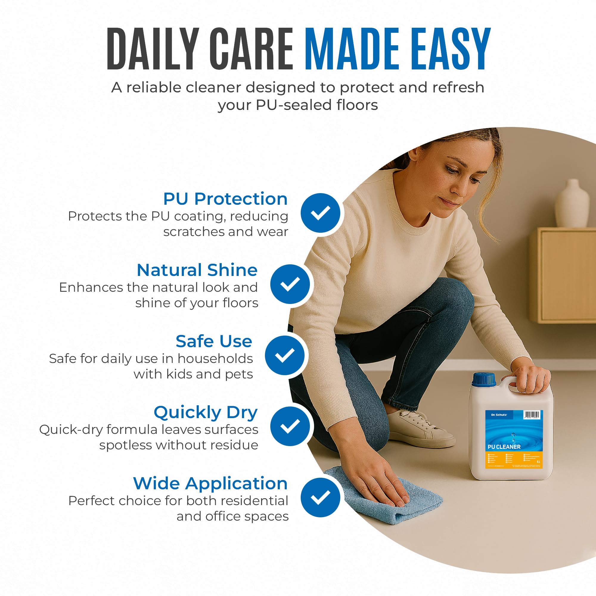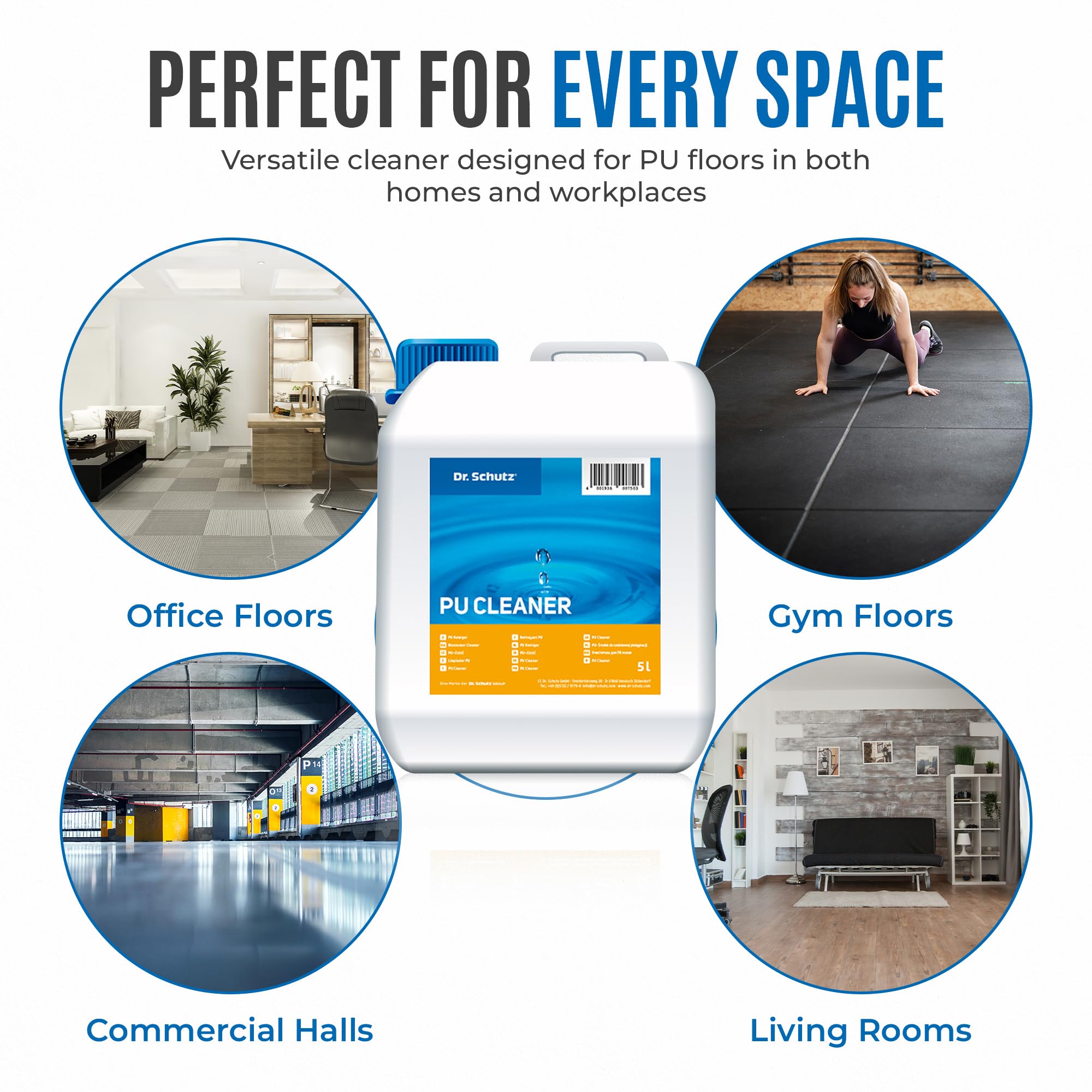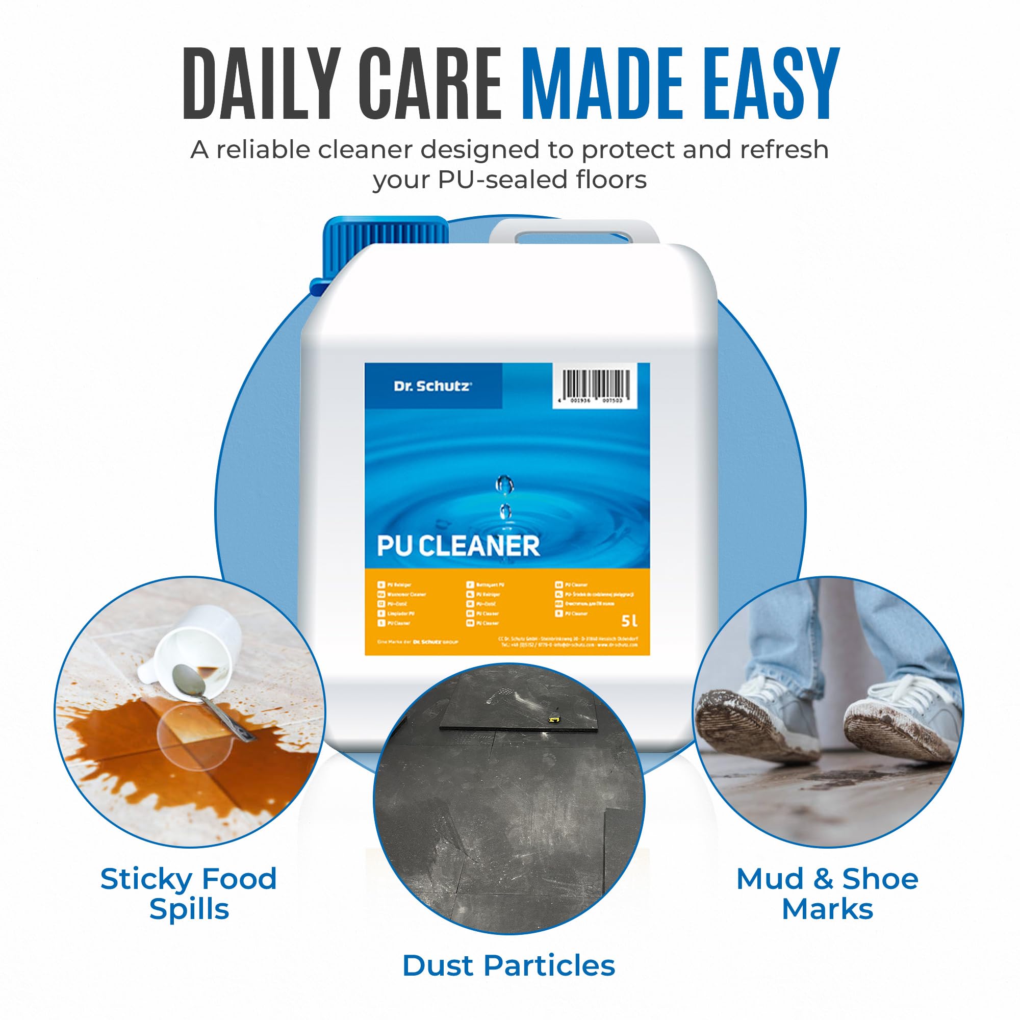 Mit dem Dr. Schutz PU-Reiniger 5 L wird die Reinigung hochwertiger Hartböden, Designböden, Vinylböden, Linoleumböden und werksseitig PU/PUR-vergüteter PVC-Böden ein Leichtes. Das in Deutschland hergestellte, ergiebige Reinigungskonzentrat reinigt streifenfrei und verleiht den gereinigten Oberflächen eine frische, strahlende Optik. Dr. Schutz Produkte werden von den führenden Bodenherstellern in Deutschland und weltweit ausdrücklich empfohlen.Auch bei fetthaltigen Rückständen oder Verschmutzungen garantiert der Fussbodenreiniger eine streifenfrei gründliche und schonende Reinigung. Dank hochwertiger Rohstoffe und pH-neutraler Formel werden Grauschleier verhindert.Bitte beachten: Dieser Hartbodenreiniger ist ungeeignet für geölte und gewachste Böden, da der PU Reiniger fettlösliche Komponenten enthält.Egal ob Sie einen Wischmopp, eine Schrubbürste oder ein professionelles Reinigungsgerät für den Boden verwenden, der PU Reiniger von Dr. Schutz liefert ein perfektes Reinigungsergebnis. Bei der täglichen Reinigung mit diesem Bodenreinigungsmittel ist kein Nachwischen notwendig - Ihren Boden reinigen Sie schnell und effektiv in nur einem Arbeitsgang. Hochwertige Böden nutzen sich weniger ab und bleiben dauerhaft erhalten.Für die Unterhaltsreinigung verdünnen Sie das Konzentrat im Verhältnis 1:200 (50 ml auf 10 Liter Wasser), wischen den Boden und lassen ihn trocknen. Zur Anwendung im Reinigungsautomaten kann die Verdünnung auf 1:400 (25 ml auf 10 Liter Wasser) erhöht werden. Für die Bauschlussreinigung / Bauendreinigung verdünnen Sie im Verhältnis 1:10 (1 Liter auf 10 Liter Wasser), kurz einwirken lassen, schrubben und mit klarem Wasser nachwischen.Das Reinigungskonzentrat ist so ergiebig, dass Sie für die Unterhaltsreinigung nur ca. 0,1 Liter für 100 qm Fläche benötigen. Für die Bauschlussreinigung benötigen Sie ca. 2 Liter pro 100 qm. Bitte lesen Sie die Gebrauchsanweisung auf dem Gebinde für bestmögliche Ergebnisse.Inhaltsstoffe: Wasser, nichtionische Tenside (5-15%), anionische Tenside (<5%), Duftstoffe LIMONENE, Konservierungsmittel (2-BROMO-2-NITROPROPANE-1,3-DIOL, OCTYLISOTHIAZOLINONE, GLUTARAL), pH: 9,5 (Konzentrat)Produktsicherheit: Bitte kühl und trocken, so wie ausser Reichweite von Kindern aufbewahren. Weitere Informationen entnehmen Sie bitte dem Produkt- bzw. Sicherheitsdatenblatt.