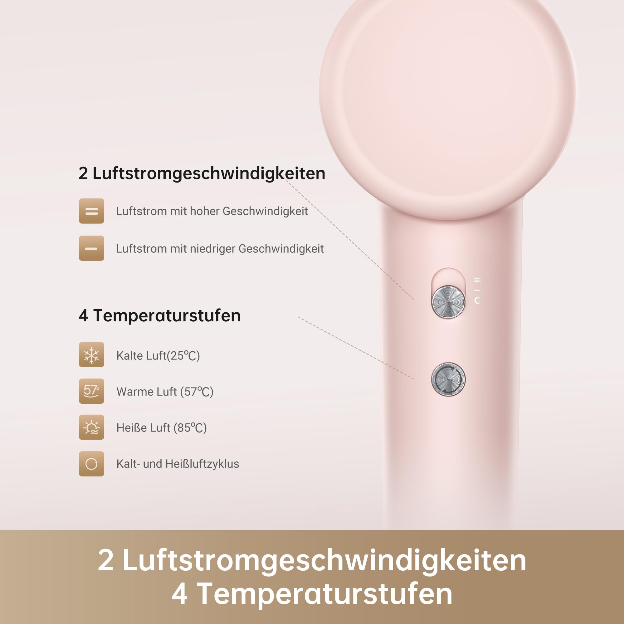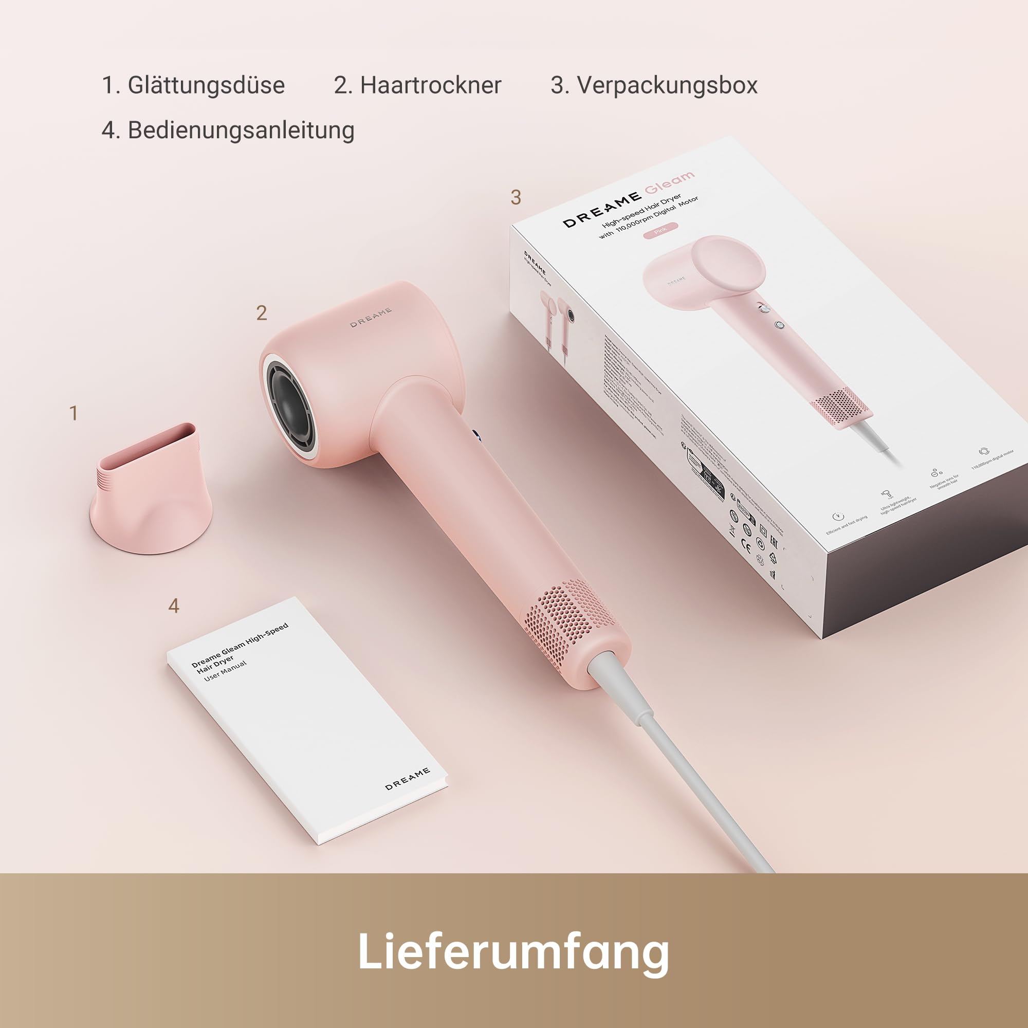 dreame Hair Gleam Haartrockner, Schneller Hochgeschwindigkeitsmotor mit 110.000 U/m, 65m/s Luftstrom, 330g, 200 Millionen Negative Ionen, Temperatur- und Luftstromregelung, Rosa, Stil: Gleam, Farbe: Rosa