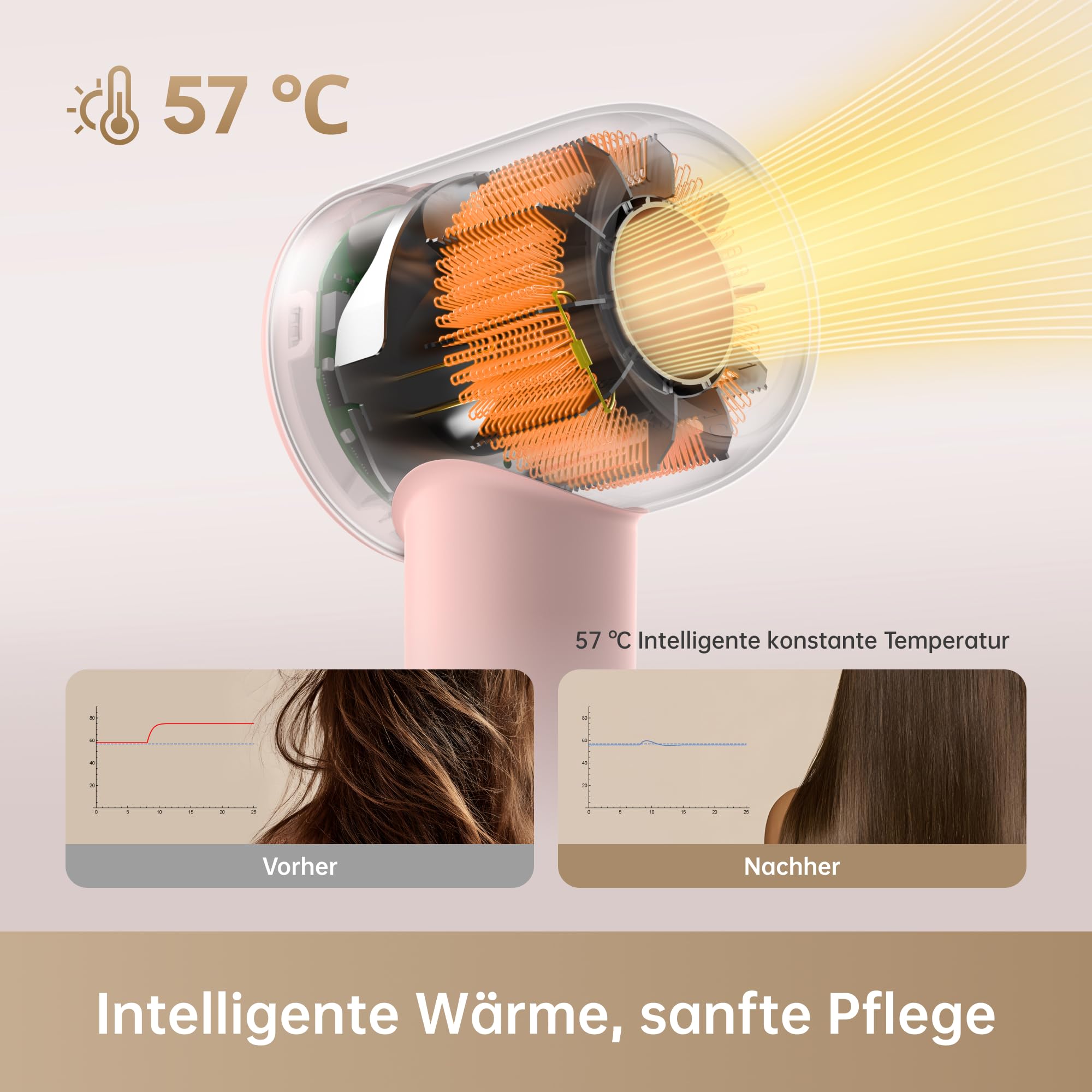 dreame Hair Gleam Haartrockner, Schneller Hochgeschwindigkeitsmotor mit 110.000 U/m, 65m/s Luftstrom, 330g, 200 Millionen Negative Ionen, Temperatur- und Luftstromregelung, Rosa