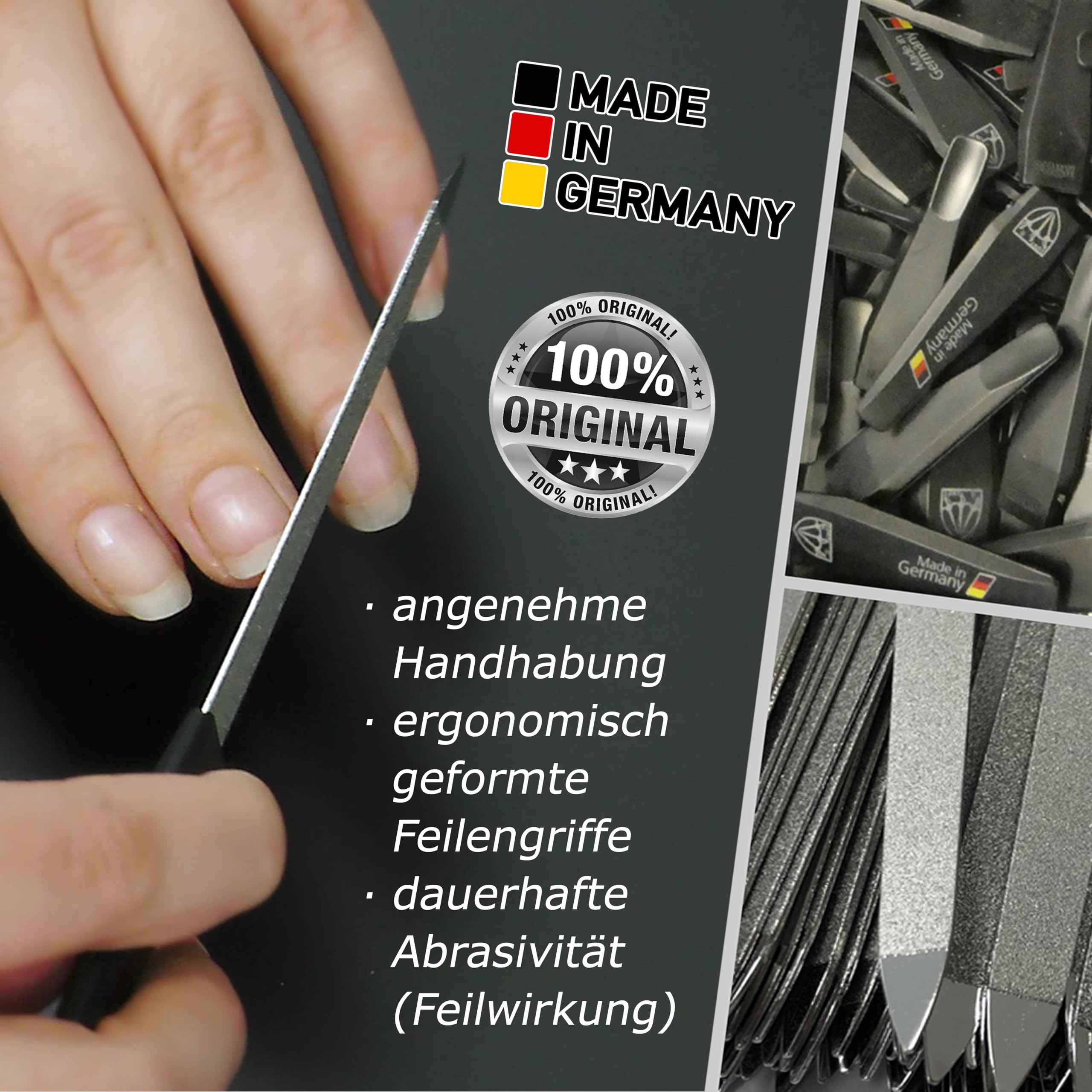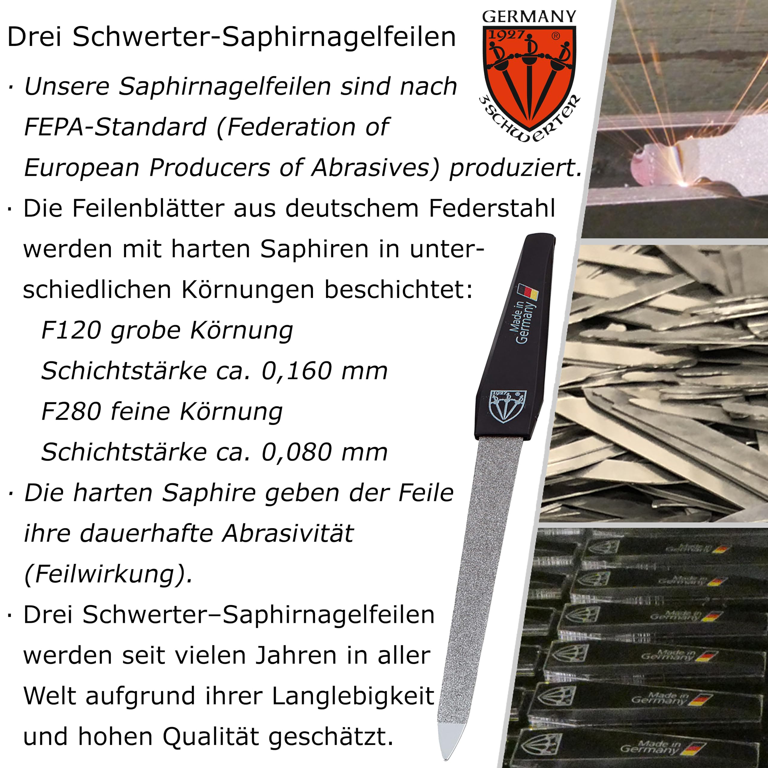 Die Saphir-Nagelfeilen werden aus stabilem, formbestaendigem Federstahl gefertigt und anschliessend mit feinen, echten Saphirkoernern beschichtet. Diese sorgen fuer eine gleichmaessige, langlebige Schleifflaeche. Dank der praezisen Verarbeitung sind die Feilen besonders robust, rostbestaendig und ideal fuer den dauerhaften Einsatz geeignet.