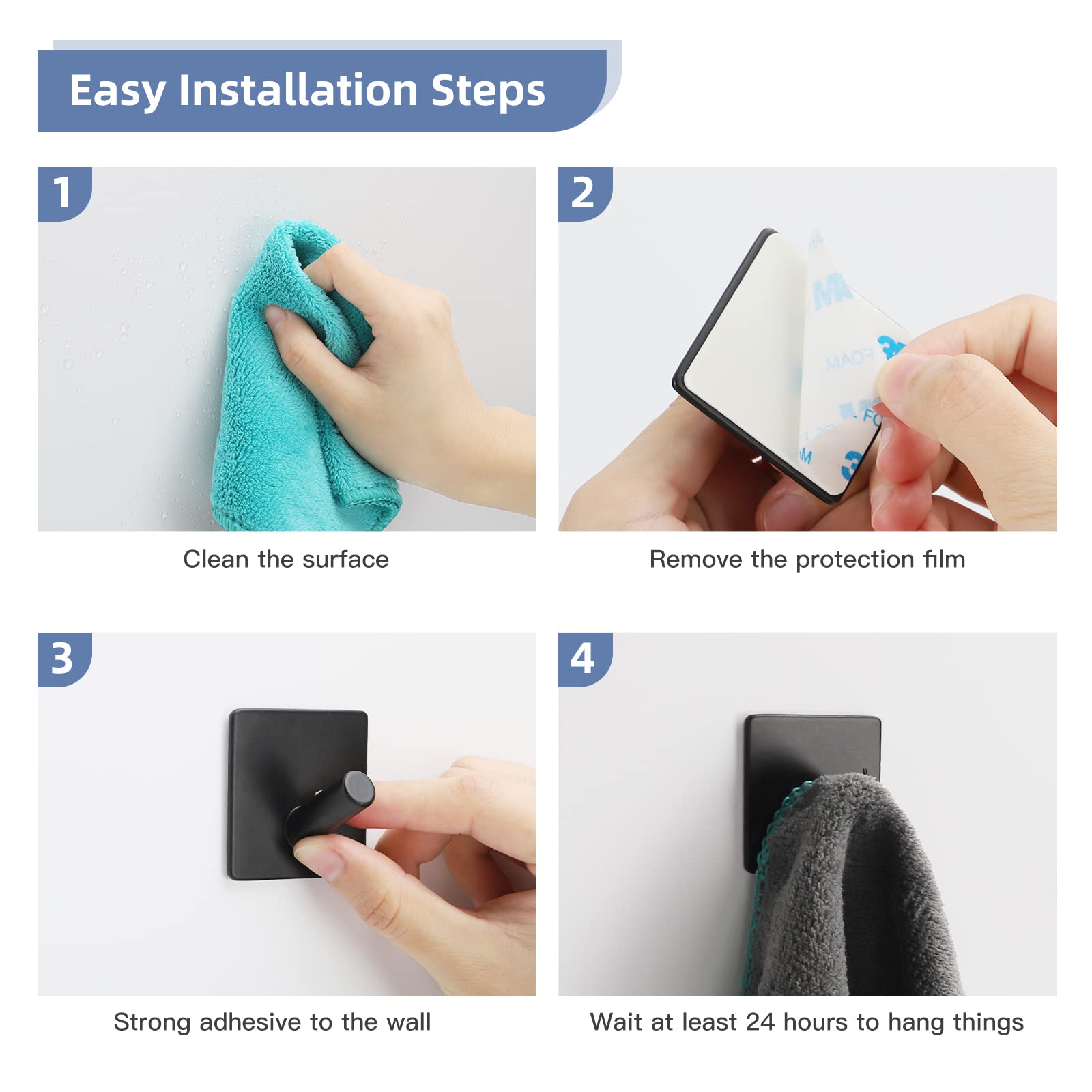 - Befestigung. Für die optimale Haltbarkeit nutzen Sie eine glatte Oberfläche, wie Fliesen oder Glas. Diese muss zuvor gründlich gereinigt werden und anschliessend gut trocknen. Die Schutzfolie an der Rückseite des Wandhaken entfernen und den Haken fest auf die gereinigte und getrocknete Stelle drücken. Nach 24 Stunden können die Haken mit Handtüchern von 1-2kg belastet werden.