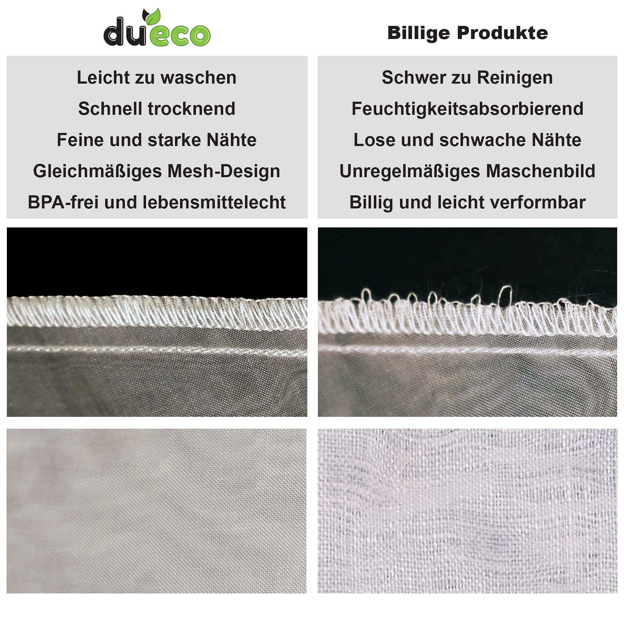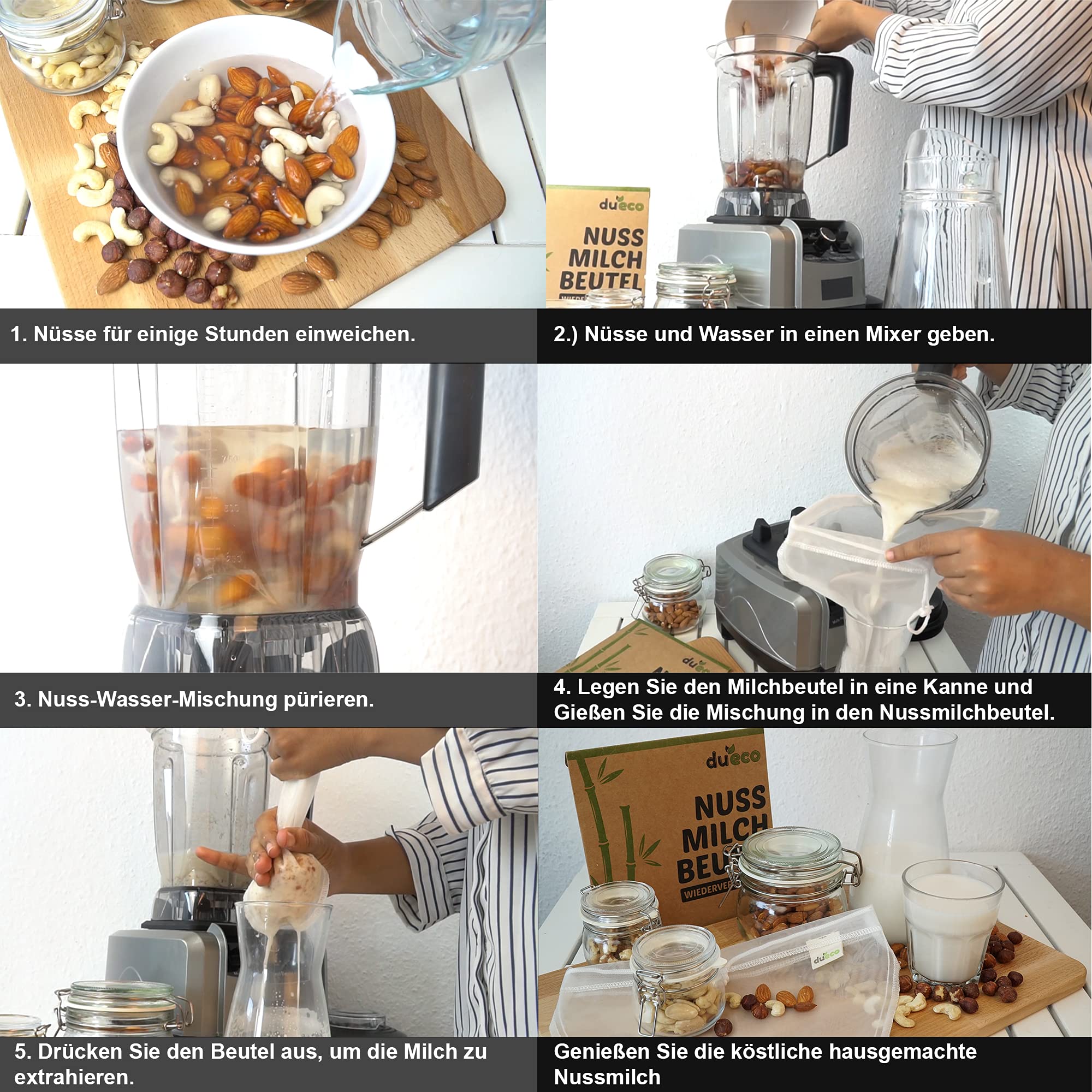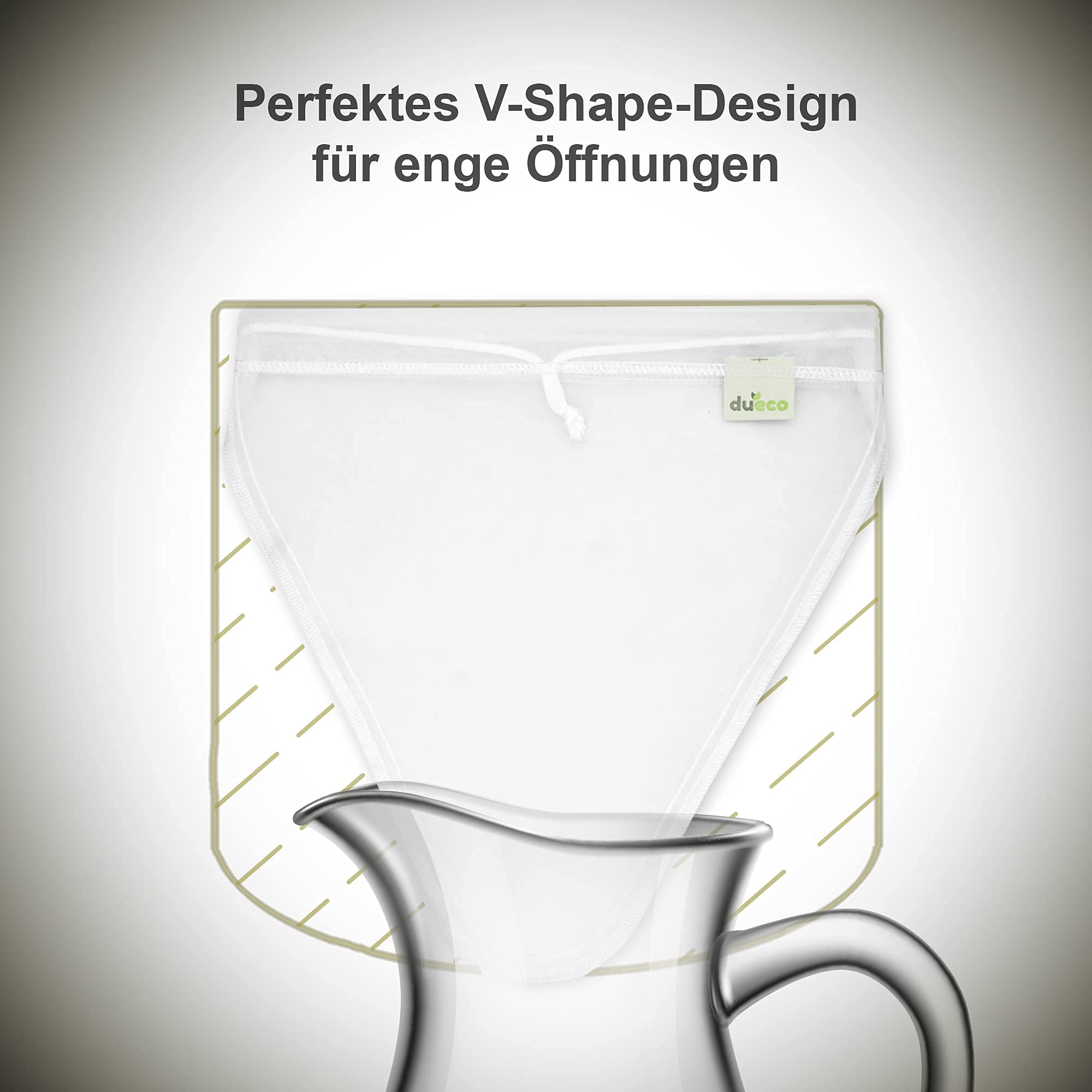 DuEco bringt Premium Quality V-Shape Nussmilchbeutel. Paket enthält:2 Nussmilchbeutel (Material: Nylon, 28x30 cm) leckeres GrundrezeptMehrzweckDer Nussmilchbutel kann für verschiedene Zwecke benutzt werden z.b als Käsetuch, Passiertuch.WiederverwendbarDer Nussbeutel kann sehr schnell und einfach per Hand oder bei 40 °C in der Waschmaschine gereinigt und anschliessend mit dem Trockner getrocknet werden.V-Shape DesignDas V-förmige Filtertuch verhindert ein Auslaufen und passt perfekt in Behälter mit schmaler Öffnung.Feinmaschiges DesignDas feine Maschendesign ist so klein, dass man kaum hindurchsehen kann. Der DuEco Filterbeutel funktioniert perfekt als Sieb und trennt die feinen Partikel gründlich ab.