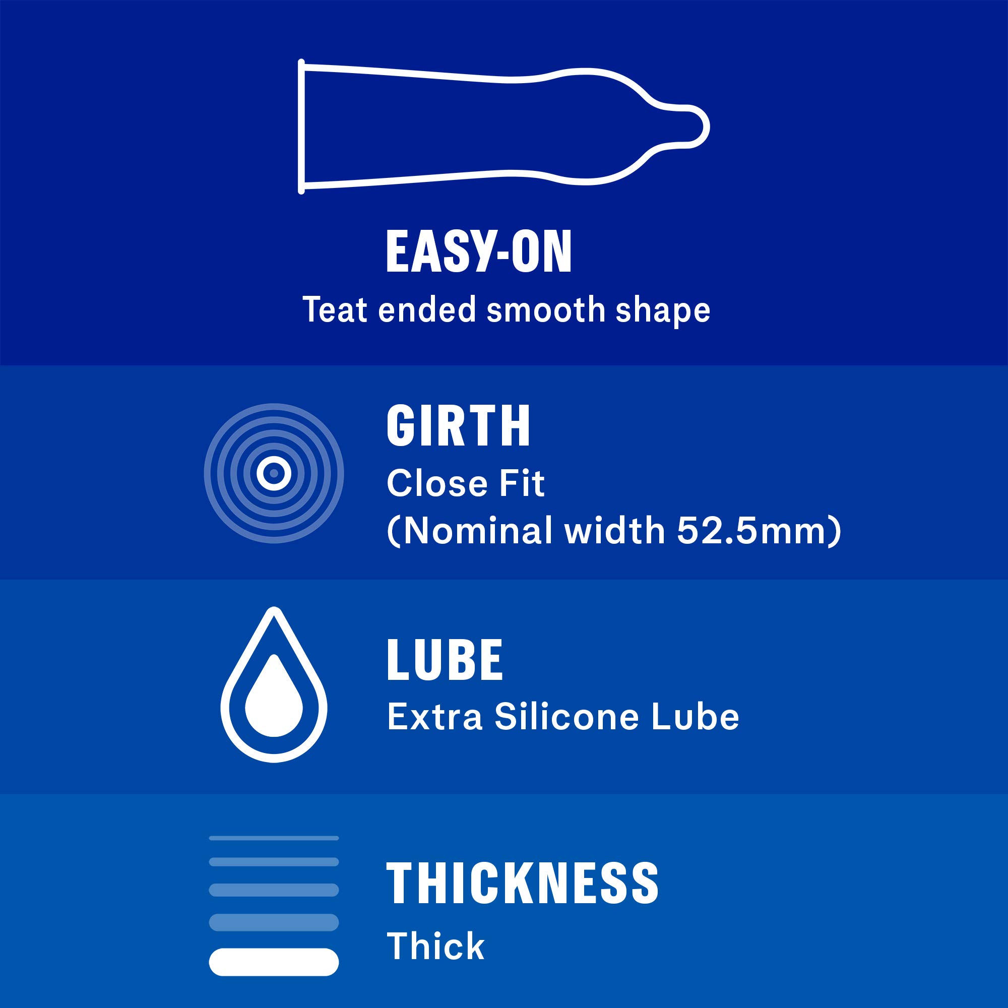 Durex Feel Safe-Kondome enthalten eine zusätzliche Gleitschicht. Sie sind etwas dicker als Standardkondome und anatomisch geformt, um eine einfache Verwendung zu ermöglichen und das Vergnügen zu maximieren.