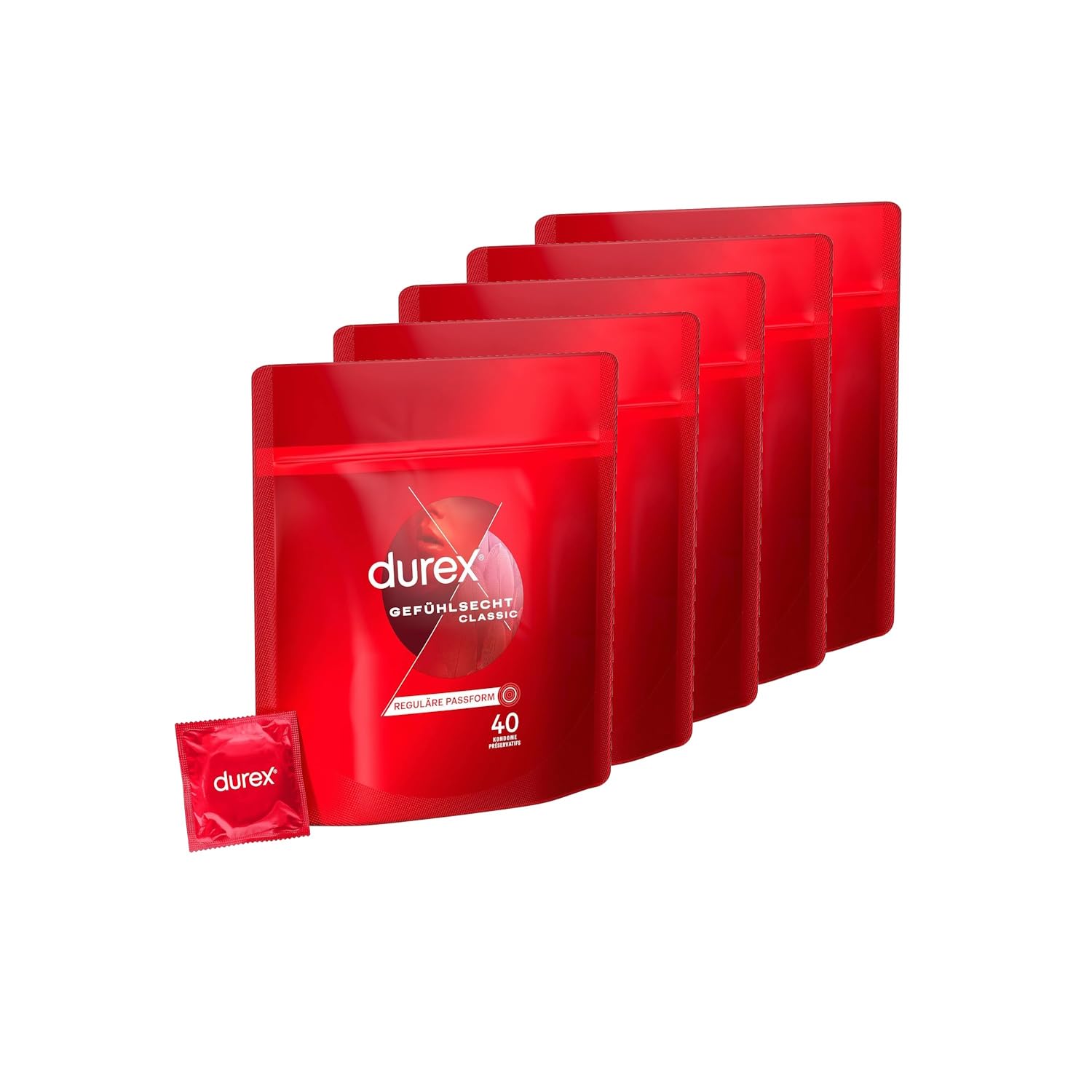 Durex Gefühlsecht Classic Kondome – Perfekter Sitz & leichtes Abrollen – Dünn, befeuchtet, transparent, angenehmer Geruch – 200er Pack (5 x 40 Stück)