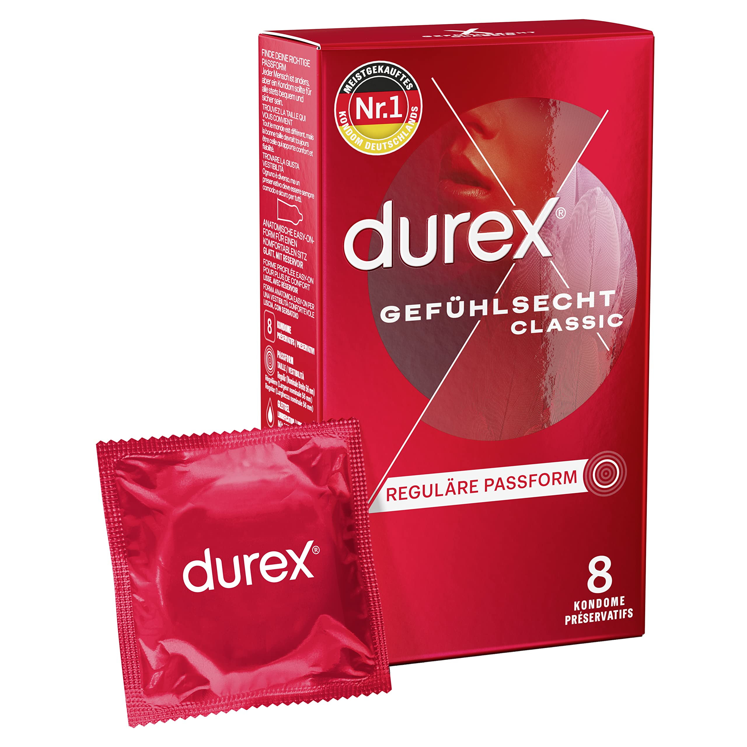 Durex Gefühlsecht Classic Kondome – Perfekter Sitz & leichtes Abrollen mit zuverlässigen Schutz – Hauchzarte, Dünn, befeuchtet, transparent Kondome mit angenehmer Geruch – 8 Stück