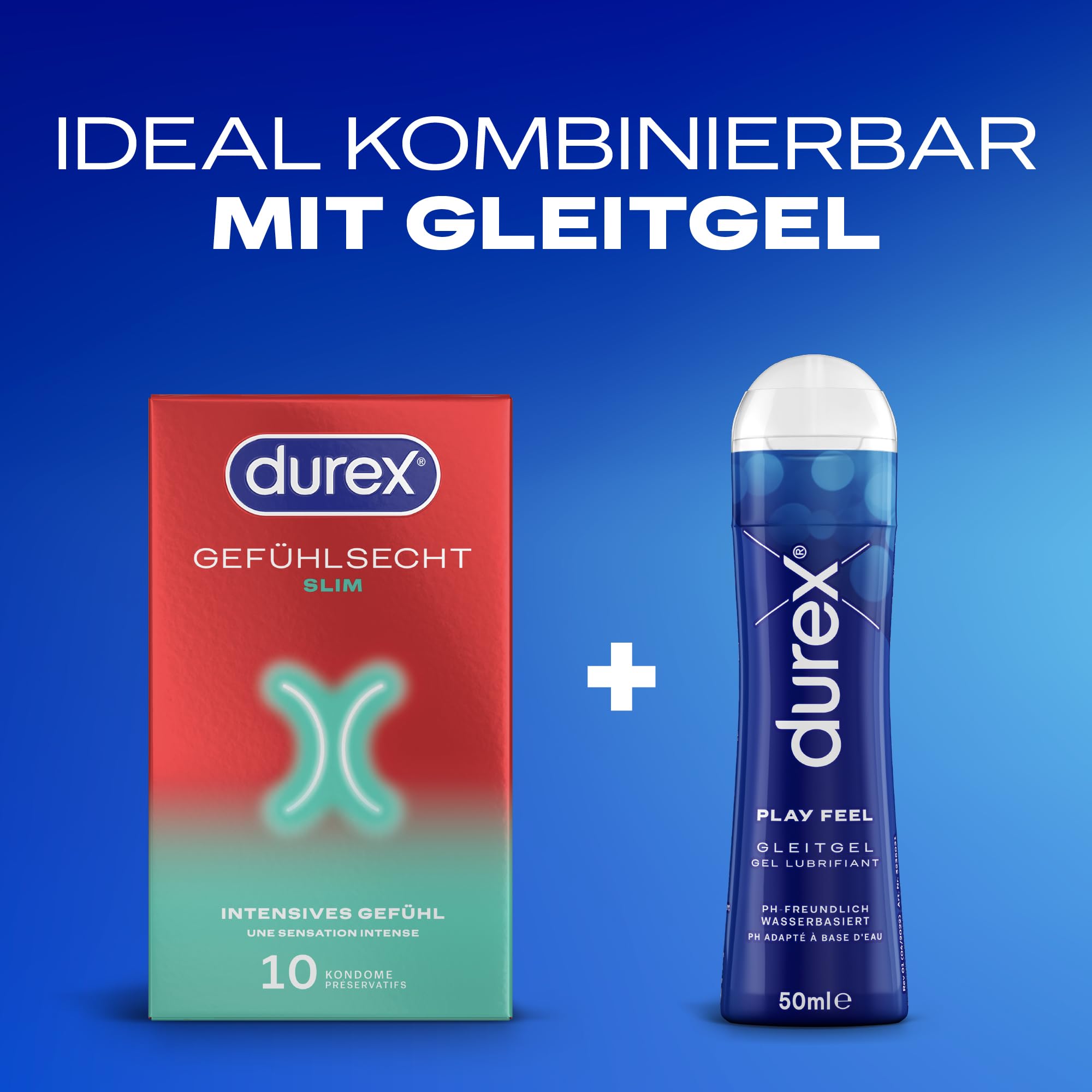 Durex Gefühlsecht Slim Kondome Durex Gefühlsecht Slim sind dünne Kondome für ein intensives Gefühl mit schmaler Passform (52,5 mm nominale Breite). Dank der Easy-On-Form sitzt das Kondom bequem, während die neue Formel für einen angenehmen Geruch sorgt. Für eine angenehme Gleitfähigkeit sind die Gefühlsecht Slim Kondome mit Silikongleitgel befeuchtet. Die richtige Kondomgrösse ist wichtig: Ein zu grosses Kondom kann abrutschen, ein zu kleines kann platzen. Ein Kondom sollte stets bequem und sicher sein. Durex Kondome durchlaufen 5 Qualitätstests und sind dermatologisch getestet. Zudem wird jedes einzelne Kondom zu 100 % elektronisch geprüft. Denke daran, dass keine Verhütungsmethode zu 100 % vor Schwangerschaft, HIV oder sexuell übertragbaren Krankheiten schützt.ProduktinformationenDünne Kondome für ein intensives Gefühl mit schmaler PassformMaterial: NaturkautschuklatexNominale Breite: 52,5 mm (schmale Passform)Transparent und mit Silikongleitgel befeuchtetMit glatter Easy-On-Form und Reservoir10er Packung (1 x 10 St)RICHTIG GUTER SEX FÜR ALLE Wir stehen für echten Sex. Egal, auf was ihr steht – wir möchten, dass ihr euch damit gut fühlt. Wir glauben daran, Probleme zu erkennen und kämpfen dafür, sie zu lösen. Sex, der sich gut anfühlt – und gut tut.