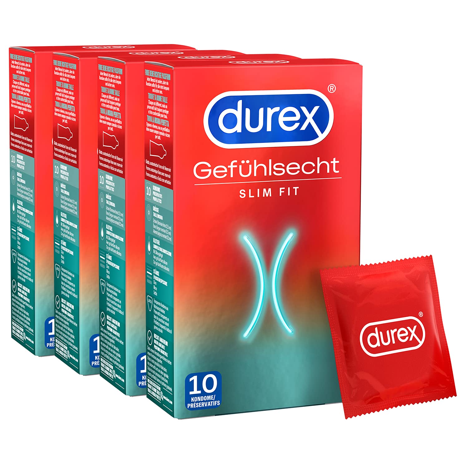 Durex Gefühlsecht Slim Kondome – Dünne Kondome mit schmaler Passform & mit Silikongleitgel befeuchtet– 4er Pack (40 Stück)