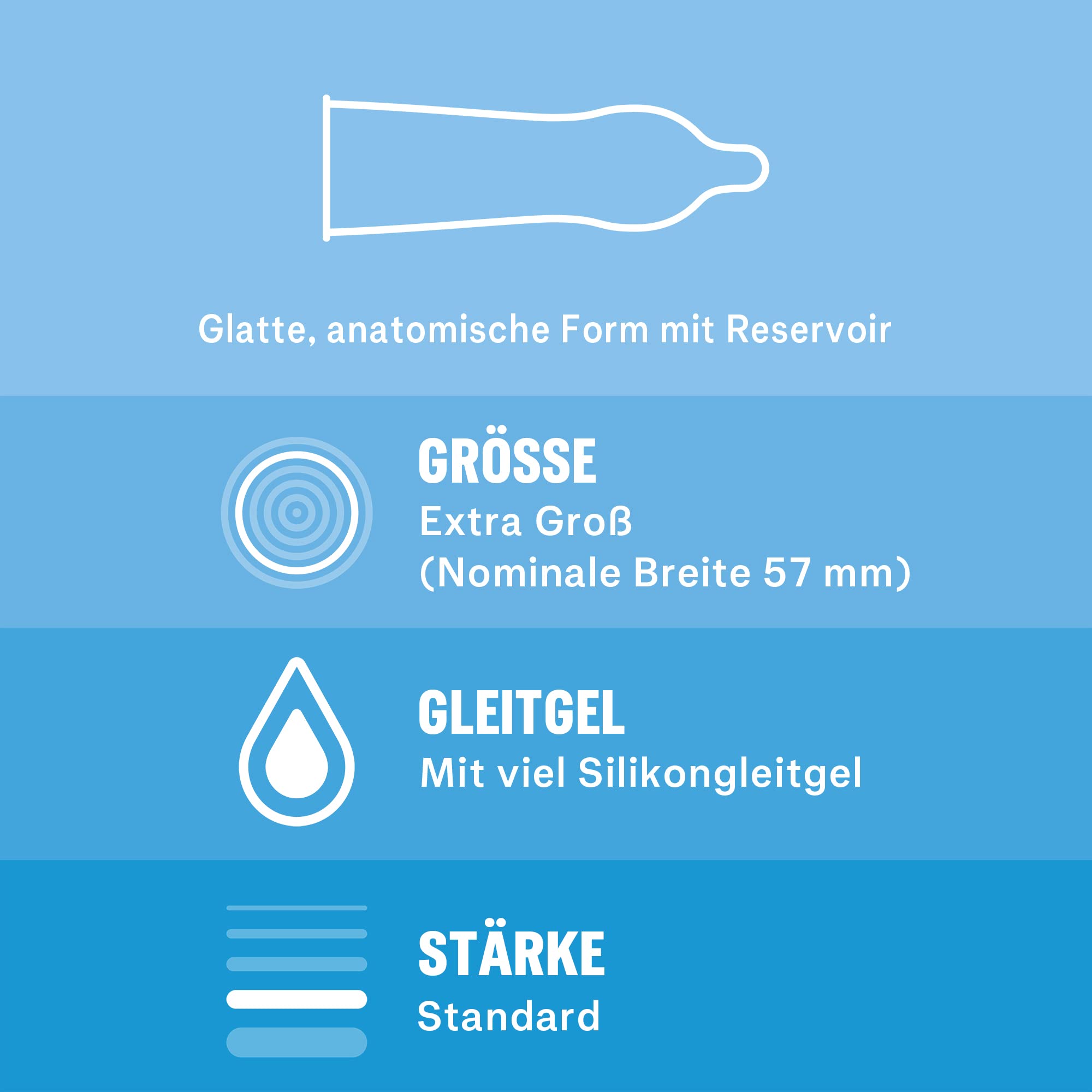 Durex Gefühlsecht XXL Kondome Durex Gefühlsecht XXL sind dünne Kondome für intensives Gefühl und innige Zweisamkeit mit grosser Passform (60 mm nominale Breite). Dank der Easy-On-Form sitzt das Kondom bequem, während die neue Formel für einen angenehmen Geruch sorgt. Für ein gutes Gefühl sind die Kondome mit Silikongleitgel befeuchtet. Die richtige Kondomgrösse ist wichtig, denn ein zu grosses Kondom kann abrutschen und ein zu kleines platzen. Ein Kondom sollte stets bequem und sicher sein. Durex Kondome durchlaufen 5 Qualitätstests und sind dermatologisch getestet. Zudem wird jedes einzelne Kondom zu 100 % elektronisch geprüft. Denke daran, dass keine Verhütungsmethode zu 100 % vor Schwangerschaft, HIV oder sexuell übertragbaren Krankheiten schützt.ProduktinformationenDünne Kondome für ein intensives Gefühl mit grosser PassformMaterial: NaturkautschuklatexNominale Breite: 60 mm (grosse Passform)Transparent und mit Silikongleitgel befeuchtetMit glatter Easy-On-Form und Reservoir30er Packung (3 x 10 St)RICHTIG GUTER SEX FÜR ALLE Wir stehen für echten Sex. Egal, auf was ihr steht – wir möchten, dass ihr euch damit gut fühlt. Wir glauben daran, Probleme zu erkennen und kämpfen dafür, sie zu lösen. Sex, der sich gut anfühlt – und gut tut.