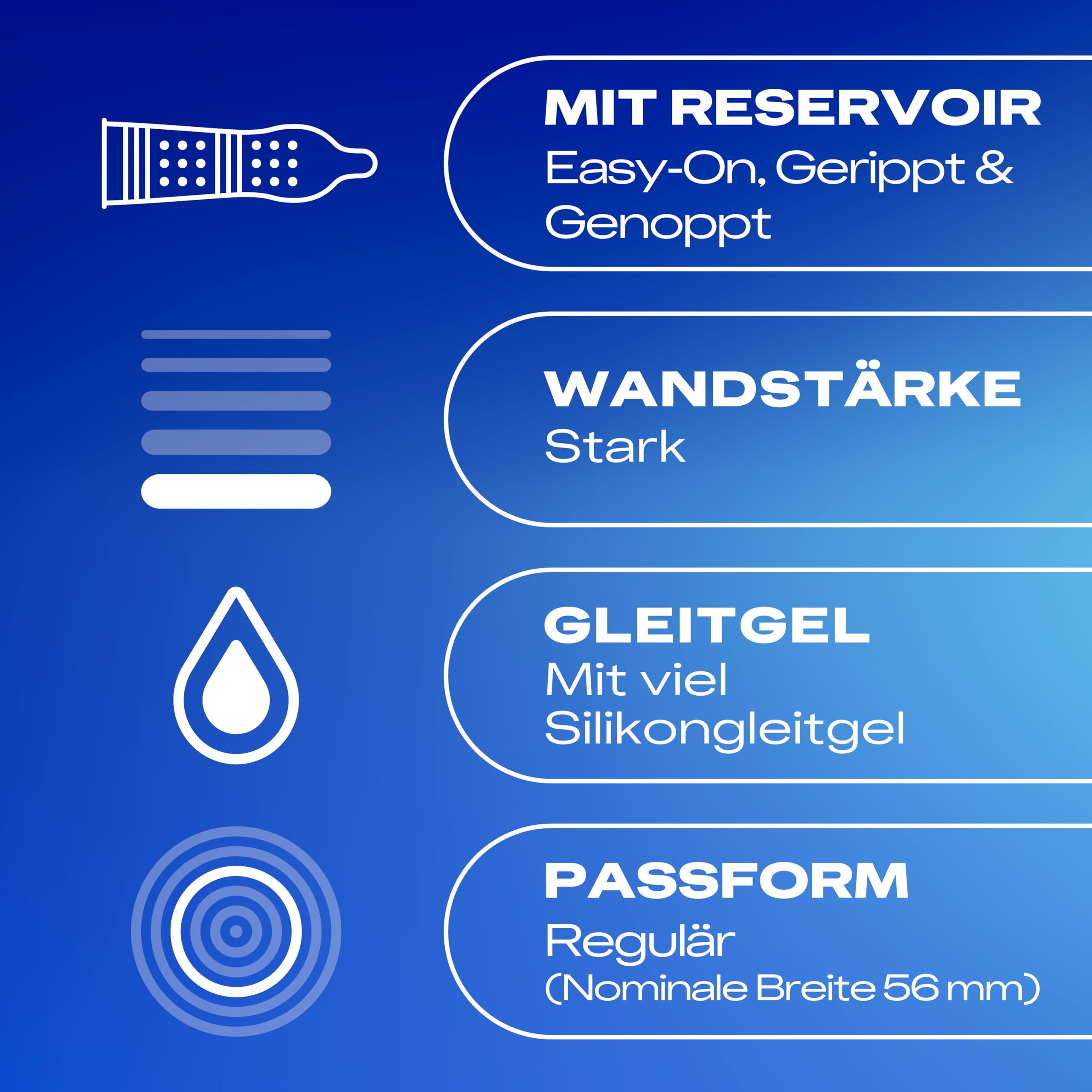 Durex Pleasure Me Kondome Durex Pleasure Me sind Kondome mit Noppen, Rippen und viel Silikongleitgel für intensive Stimulation und langanhaltende Gleitfähigkeit, durch die sich euer Sex noch besser anfühlt. Dank der Easy-On-Form sitzt das Kondom bequem, während die neue Formel für einen angenehmen Geruch sorgt.Die richtige Kondomgrösse ist wichtig: Ein zu grosses Kondom kann abrutschen, während ein zu Kleines platzen kann. Durex Pleasure Me Kondome haben eine reguläre Grösse mit 56 mm nominaler Breite.Durex Kondome durchlaufen 5 Qualitätstests und sind dermatologisch getestet. Zudem wird jedes einzelne Kondom zu 100 % elektronisch geprüft. Denke daran, dass keine Verhütungsmethode zu 100 % vor Schwangerschaft, HIV oder sexuell übertragbaren Krankheiten schützt.ProduktinformationenGenoppte & gerippte Kondome für extra StimulationMaterial: NaturkautschuklatexNominale Breite: 56 mm (reguläre Passform)Transparent und mit viel Silikongleitgel befeuchtetMit glatter Easy-On-Form und Reservoir40er Grosspackung (1 x 40 St)RICHTIG GUTER SEX FÜR ALLE Wir stehen für echten Sex. Egal, auf was ihr steht – wir möchten, dass ihr euch damit gut fühlt. Wir glauben daran, Probleme zu erkennen und kämpfen dafür, sie zu lösen. Sex, der sich gut anfühlt – und gut tut.