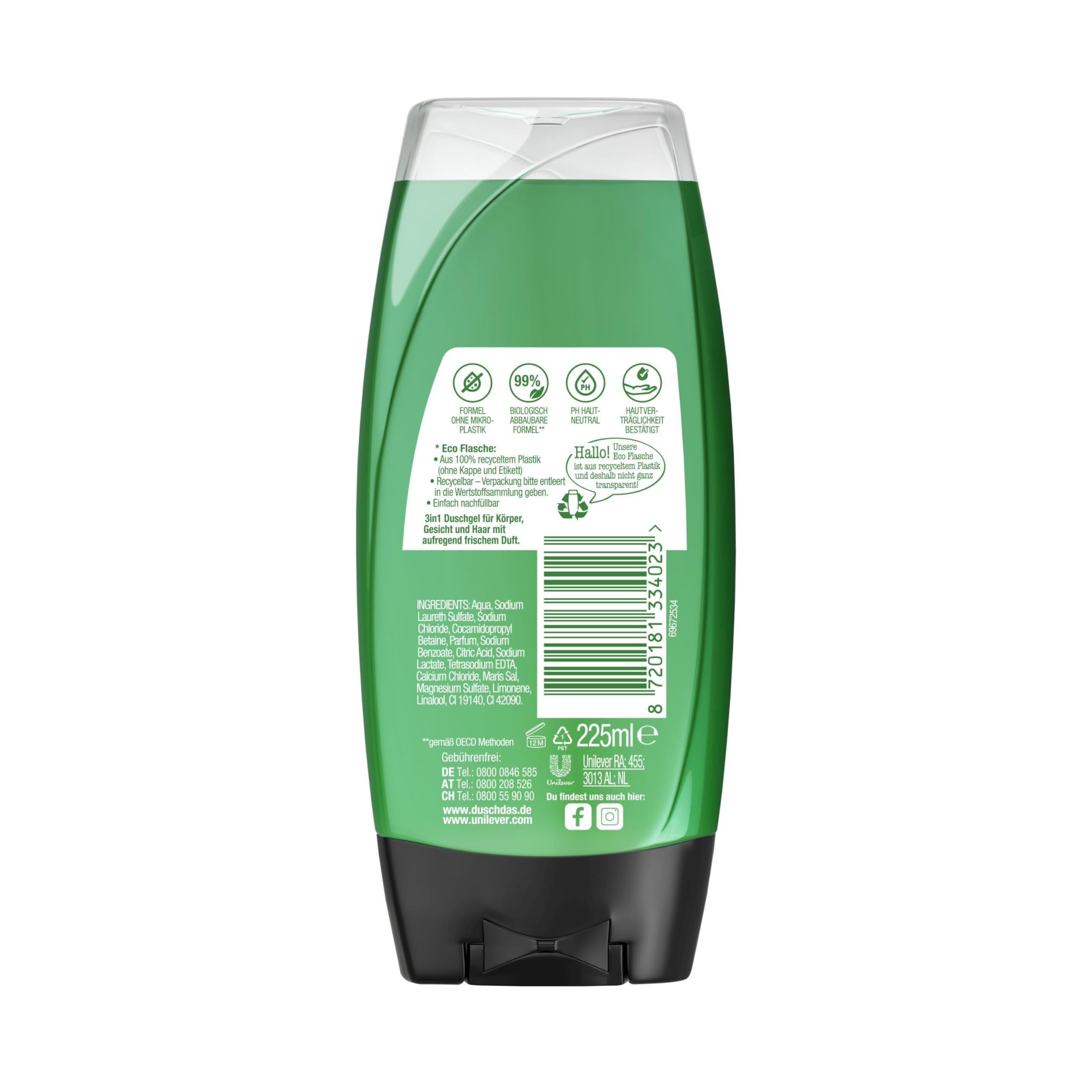 Nachhaltige Eco-Flasche: Die 225 ml Flasche besteht aus 100% recyceltem Plastik (rPET) und ist vollständig recycelbar. Das Kopfsteher-Design ermöglicht einfaches Dosieren und mehrfaches Nachfüllen.