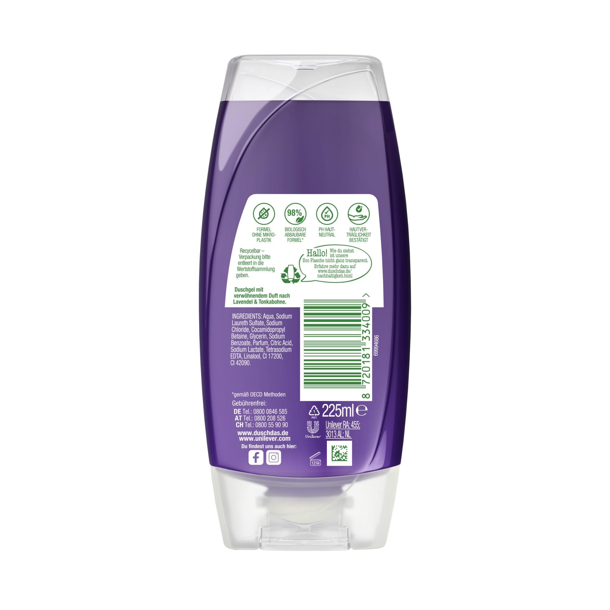 - Sinnlich-frischer Start in den Tag: Das Duschdas Duschgel Lavendel Tonka verbindet einen warmen, umhüllenden Duft nach Lavendel und Tonkabohne mit leichten Zitrus- und Gewürznoten – für ein modernes, belebendes Duscherlebnis.