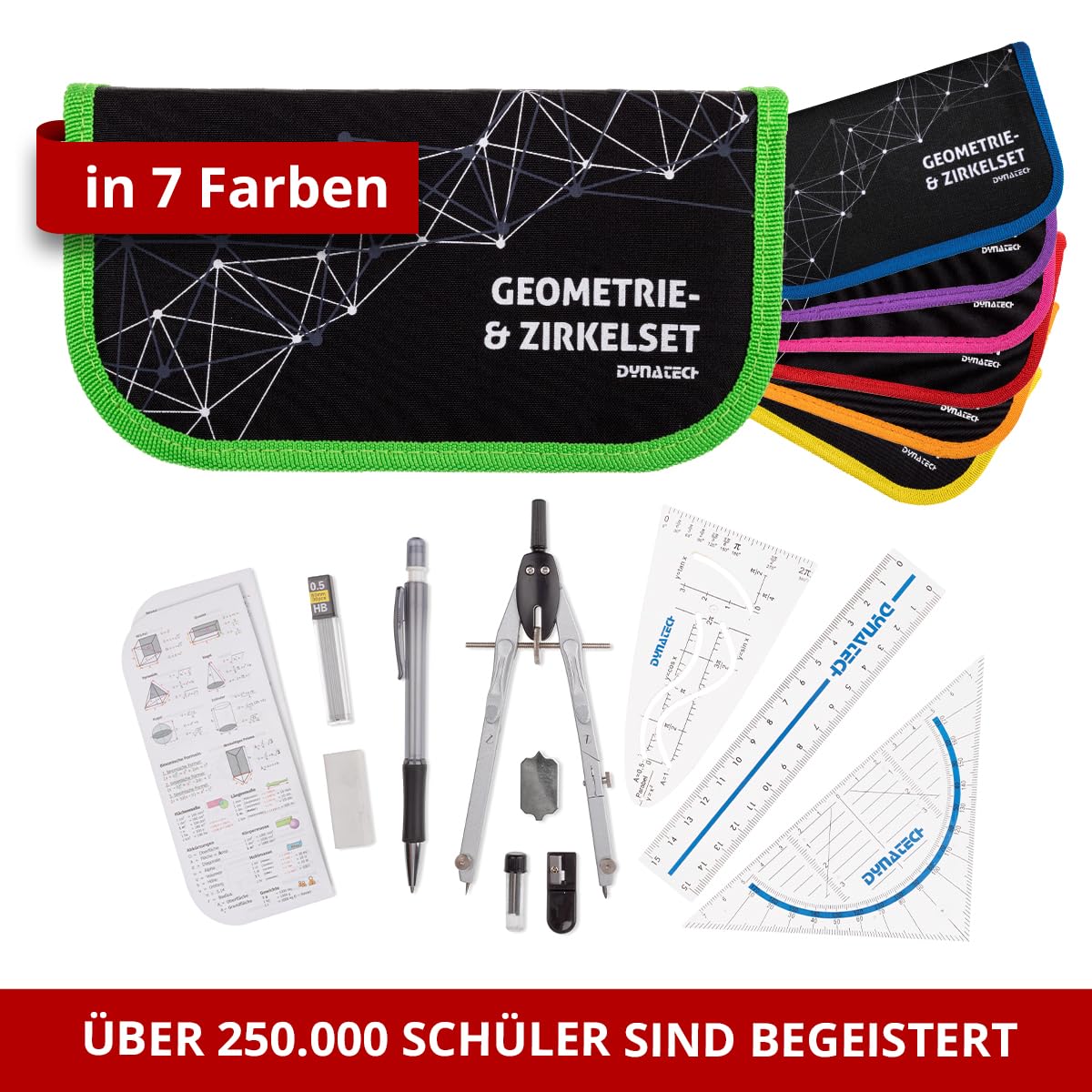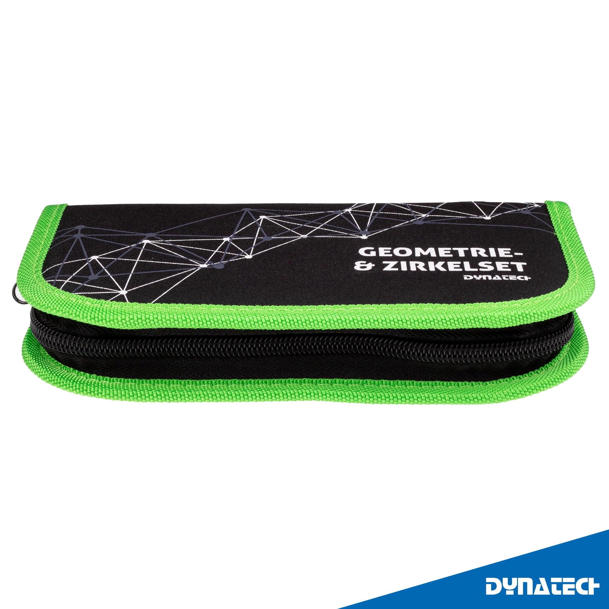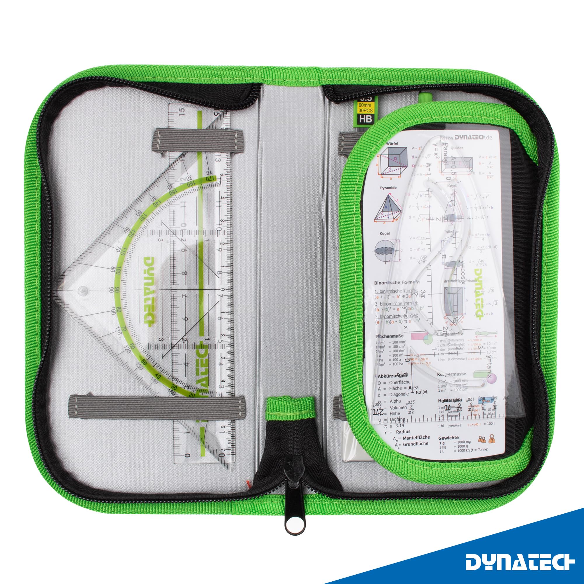 DynaTech Zirkel Set Geometrieset 13-Teilig mit Schnellverstellzirkel, Geodreieck, Parabel, Bleistift, Lineal, Spitzer und Ersatzminen im Etui grün - praktisches Mathematik-Set inkl. Federmappe