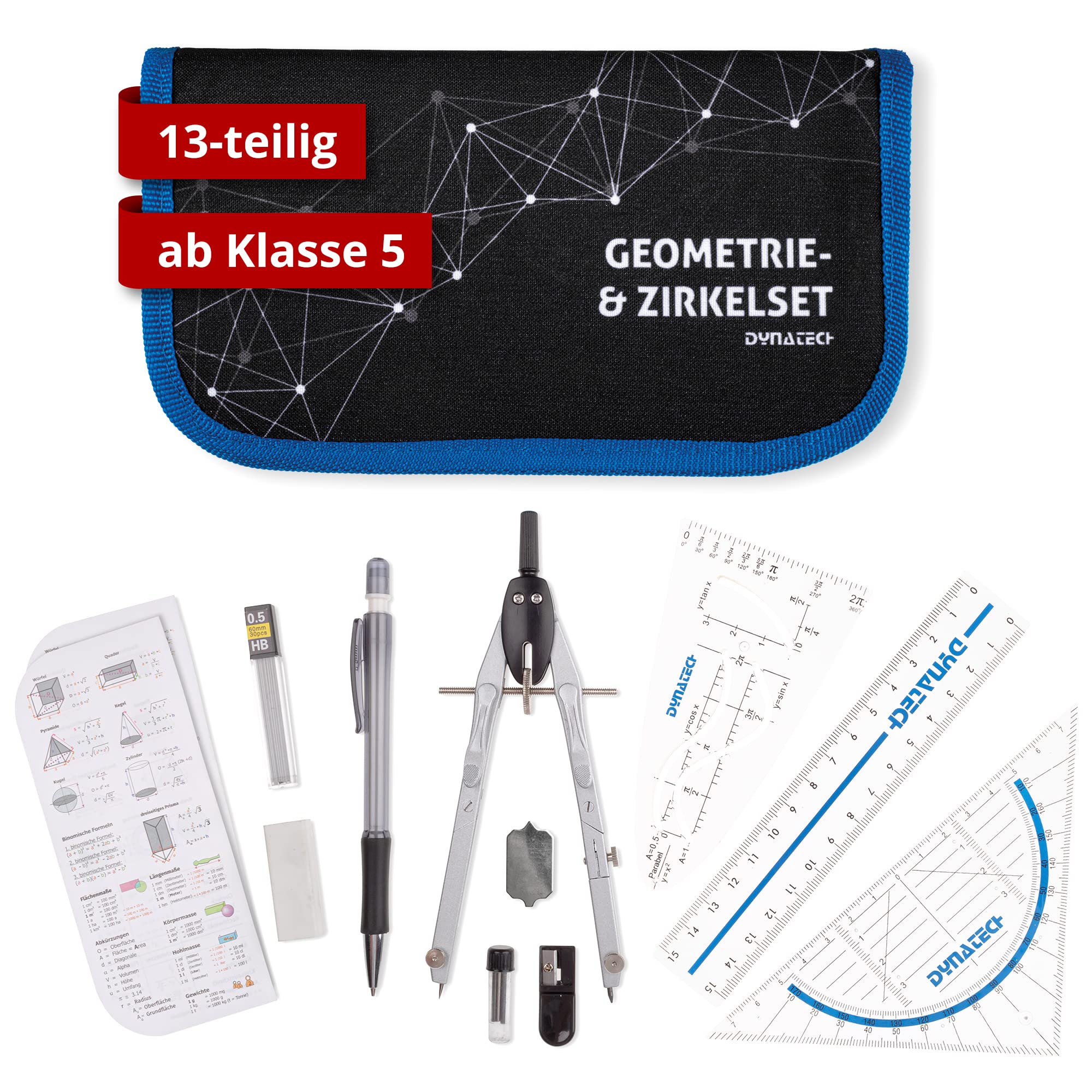 DynaTech Zirkel Set Geometrieset 13-Teilig mit Zirkel, Geodreieck, Parabel, Bleistift, Lineal, Spitzer und Ersatzminen im Etui mit Reissverschluss blau - praktisches Mathematik-Set inkl. Federmappe