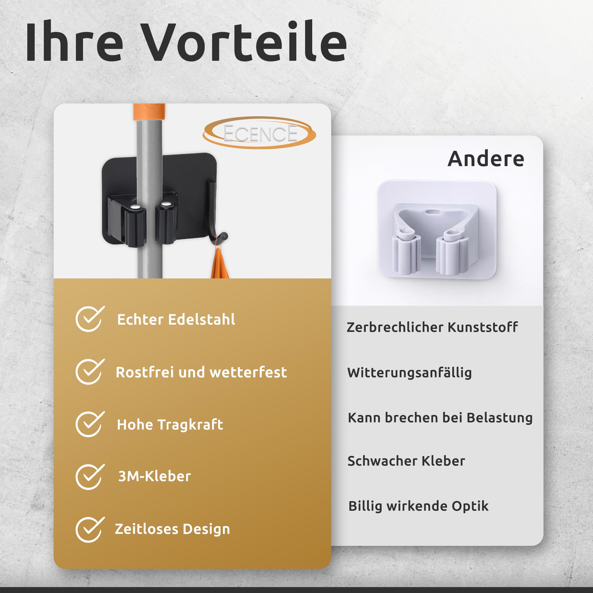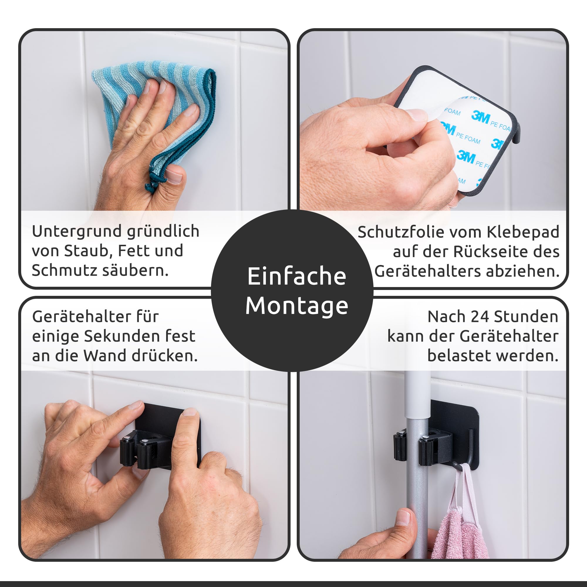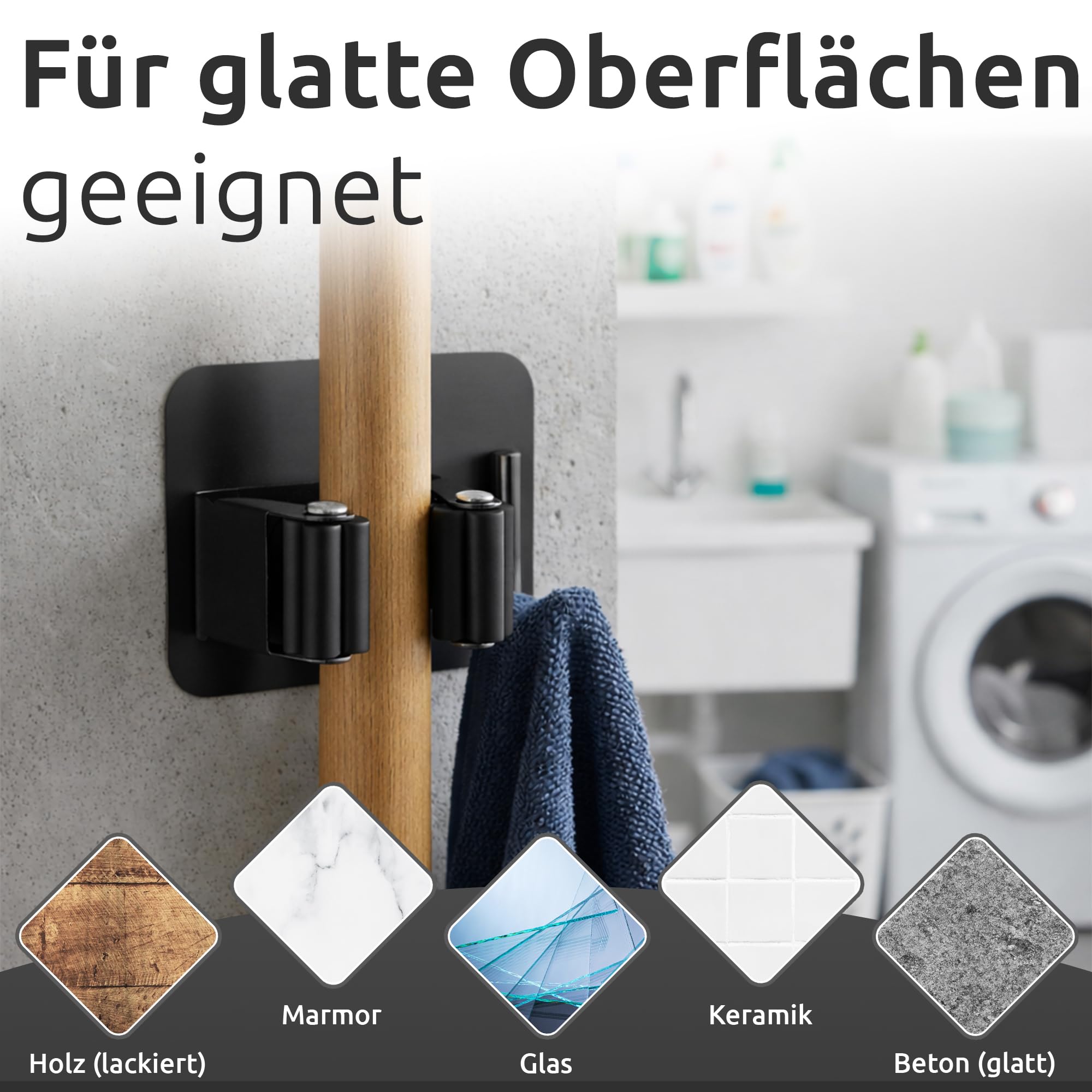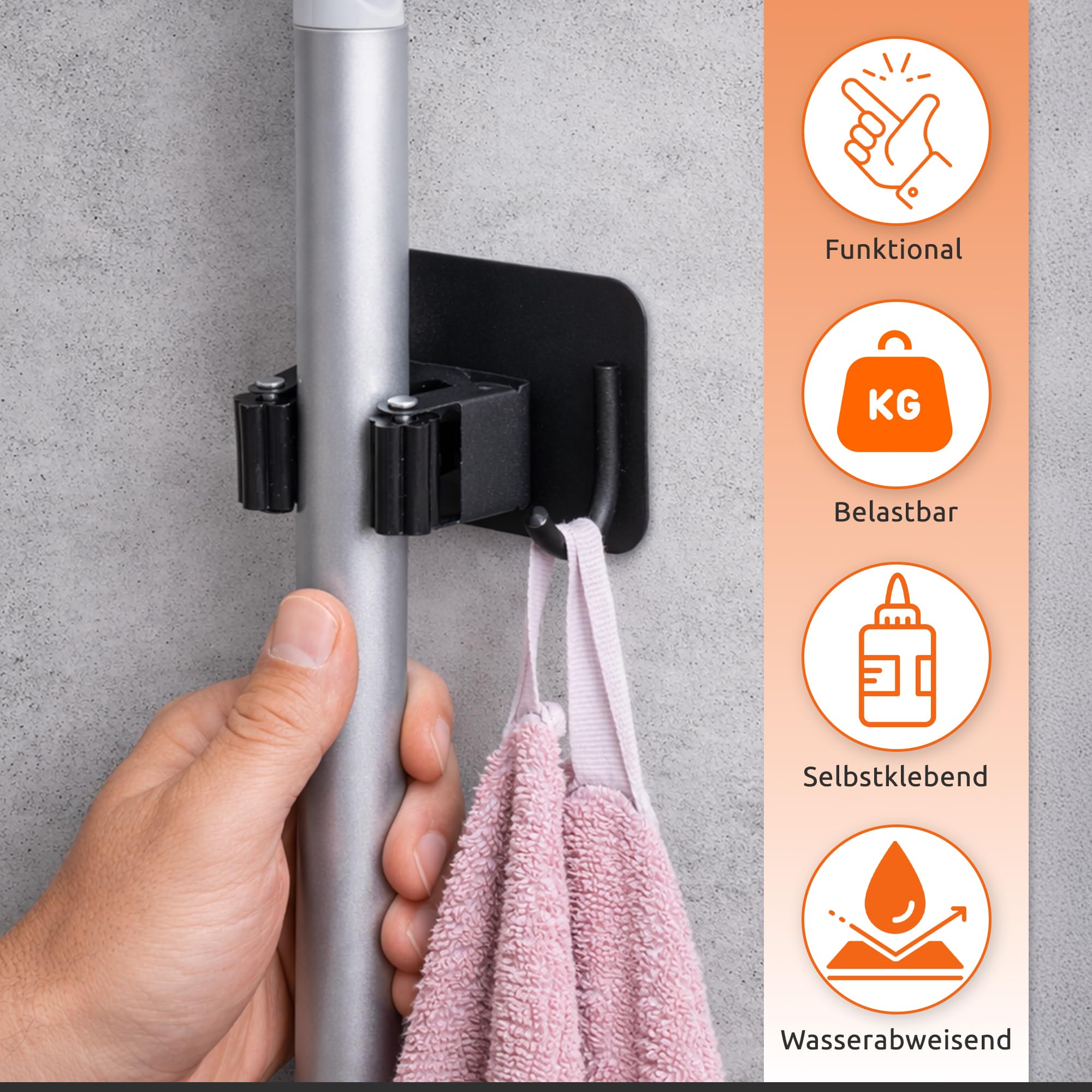- Sie wissen was es ist: Während der Reinigung ist nie der richtige Platz für den Besen oder den Mopp. Meistens wird es irgendwo in einer Ecke platziert, ist ein Hindernis und fällt Ihnen buchstäblich auf die Füsse. Mit dieser Universalhalterung haben Sie endlich einen festen Platz für all die Dinge gefunden, die überall herumliegen. Die Haken sind mit einer selbstklebenden Rückseite ausgestattet und können auf jede glatte Oberfläche gedrückt werden.