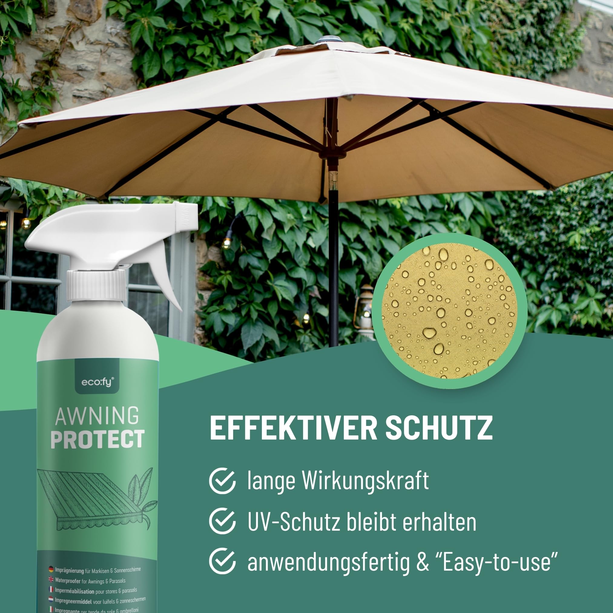 Die eco:fy Markisen Imprägnierung ist ideal geeigent für alle natürlichen und synthetischen Stoffe wie Leinen, Baumwolle, Acryl etc. Für Markisen, Sonnenschirme, Fenster- und Wintergartenbeschattungen. Die Markisen Imprägnierung – wirkt schmutz- und wasserabweisend mit Abperleffekt. Verhindert die Bildung von Stockflecken und Grünbelag.
