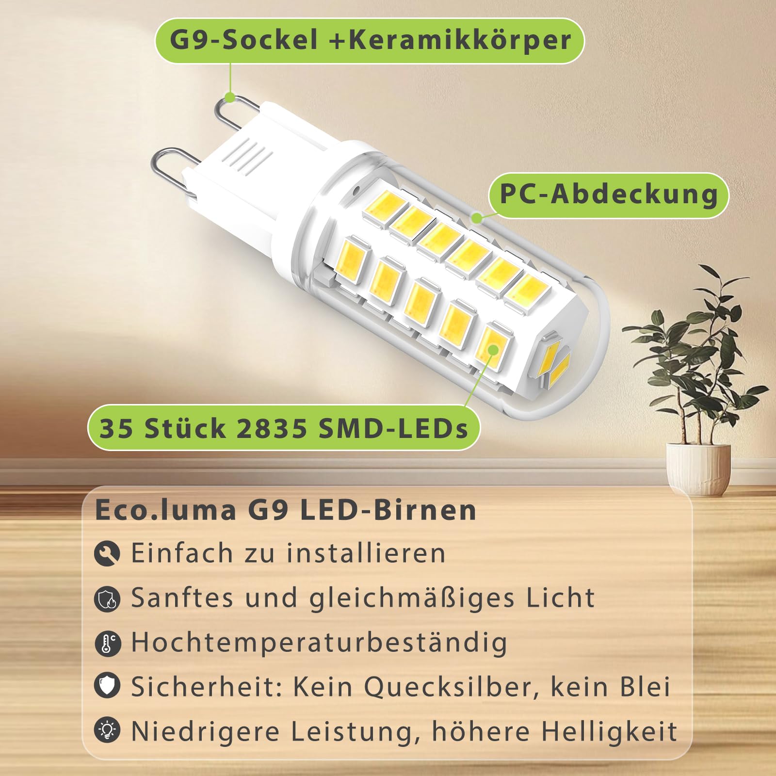 Eco.Luma G9 LED Lampen Kaltweiss 6000K, LED Leuchtmittel 3W Entspricht 40W-50W Halogenlampe, G9 Glühbirne 500 Lumen, Nicht Dimmbar, Kein Flackern, Enegiesparende kleine Birne, 10er Pack