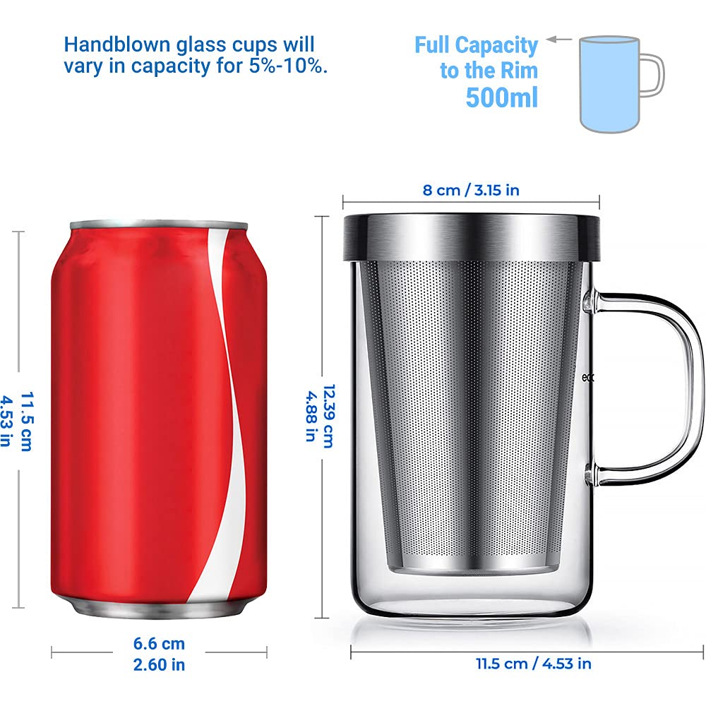 ecooe 500 ml(volle Kapazität) Glas Tasse mit Silberne Edelstahl Sieb und Deckel Teeglas Teebecher aus Borosilikat Teetasse