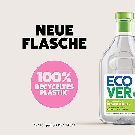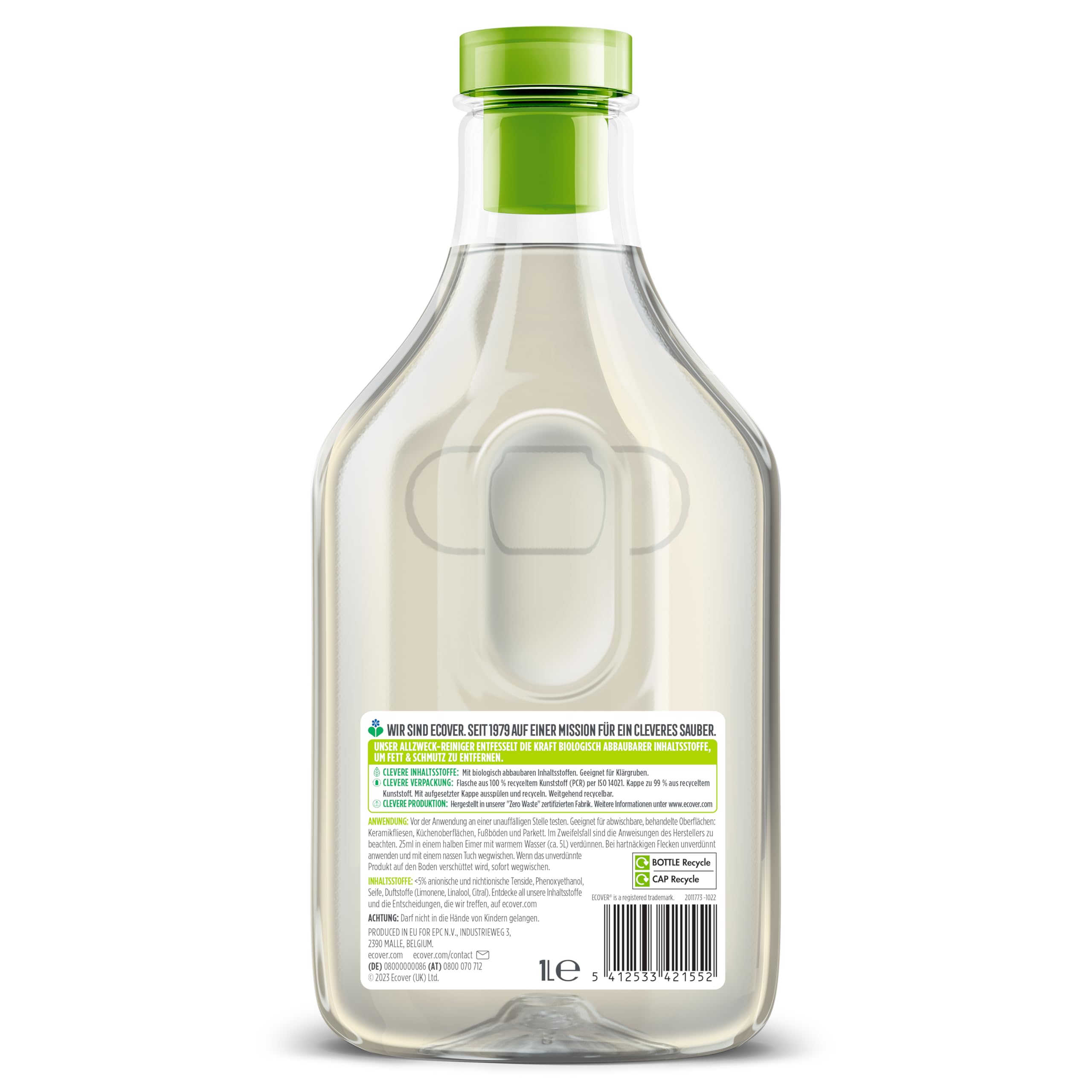 Ecover Allzweckreiniger (1 L) – Mit Bio-Tensiden gegen Schmutz und Fett Mit seiner kraftvollen Formel entfernt der vielseitige Reiniger Schmutz und Fett auf allen abwischbaren Oberflächen. Ob als Boden- oder Küchenreiniger glänzt er nicht nur mit strahlender Sauberkeit, sondern auch mit seiner nachhaltigen Formel, die vegan friendly, da pflanzenbasiert, ist. Alle Inhaltsstoffe sind auf pflanzlicher Basis und biologisch abbaubar.* Hergestellt wird der Reiniger in der Ecover Öko-Fabrik. Die Flasche besteht zu 100 %, der Verschluss zu 50 % aus recyceltem Plastik (PCR), alle Bestandteile sind zu 100 % recycelbar. Ecover ist einer der grössten Hersteller ökologischer Wasch- und Reinigungsmittel in Europa. Vor über 40 Jahren gegründet, war Ecover eines der ersten Unternehmen, das ein phosphatfreies Waschmittel vertrieb. Mit Innovationsgeist, Erfahrung und intelligenter Forschung hat Ecover Wasch- und Reinigungsmittel auf Pflanzenbasis und mit biologisch abbaubaren Inhaltsstoffen entwickelt, die Verbrauchern helfen, ihr Zuhause effektiv sauber zu halten. Die Ecover Fabrik in Malle, Belgien ist TRUE Zero Waste zertifiziert und nutzt erneuerbare Energien. Heute sind Ecover-Produkte in rund 40 Ländern erhältlich. Ecover - #letsliveclean Die Produktvorteile im Detail: Pflanzenbasierte Formel Alle Inhaltsstoffe sind biologisch abbaubar* Verpackung aus recycelten und recycelbaren Materialien Vegan friendly, da pflanzenbasiert Frischer Duft nach Zitronengras & Ingwer Inhalt: 1 L *Alle Inhaltsstoffe sind biologisch abbaubar (DID-Liste/OECD-Tests), ausser Mineralien.
