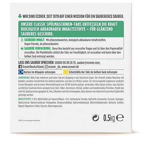 Ecover Classic Spülmaschinen-Tabs Zitrone & Limette (25 Stück/500 g) - Kraftvolle Reinigung mit veganer FormelDie Ecover Classic Spülmaschinen-Tabs mit Zitronenduft reinigen Geschirr gründlich mit ihrer starken, veganer freundlichen Formel. Die Geschirrspüler Tabs entfetten Teller und Besteck – mit ihrer Einweichfunktion lösen sie selbst eingetrocknete Speisereste. Das Spülmittel in Tabs basiert auf pflanzlichen, biologisch abbaubaren Inhaltsstoffen und Mineralien. Es ist vegan friendly, da pflanzenbasiert. Ausserdem besteht der Karton der Spülmaschinentabs zu 90 Prozent aus recyceltem Papier. Die Tabs selber sind von einer Folie aus recycelbarem Polypropylen umgeben, die sie vor Feuchtigkeit schützt. Ein Karton enthält 500 g Spülmittel, also 25 Tabs.Ecover ist einer der grössten Hersteller ökologischer Wasch- und Reinigungsmittel in Europa. Vor über 40 Jahren gegründet, war Ecover eines der ersten Unternehmen, das Waschmittel und andere Reinigungsmittel ohne Phosphate vertrieb. Mit Innovationsgeist, Erfahrung und intelligenter Forschung hat Ecover Wasch- und Reinigungsmittel auf Pflanzenbasis und mit biologisch abbaubaren Inhaltsstoffen entwickelt, die Verbrauchern helfen, ihr Zuhause effektiv sauber zu halten. Die Ecover Fabrik in Malle, Belgien ist TRUE Zero Waste zertifiziert und nutzt erneuerbare Energien. Heute sind Ecover-Produkte in rund 40 Ländern erhältlich.Ecover – #letslivecleanDie Produktvorteile im Detail:Pflanzenbasierte FormelReinigt kraftvoll und entfettetEntfernt auch eingetrocknete SpeiseresteAlle Inhaltsstoffe sind biologisch abbaubar*Karton aus 90 Prozent recyceltem PapierVegan friendly, da pflanzenbasiertDuft: Zitrone & LimetteInhalt: 25 Tabs / 500 g*alle Inhaltsstoffe sind biologisch abbaubar (DID-List/OECD-Tests) ausser Mineralien