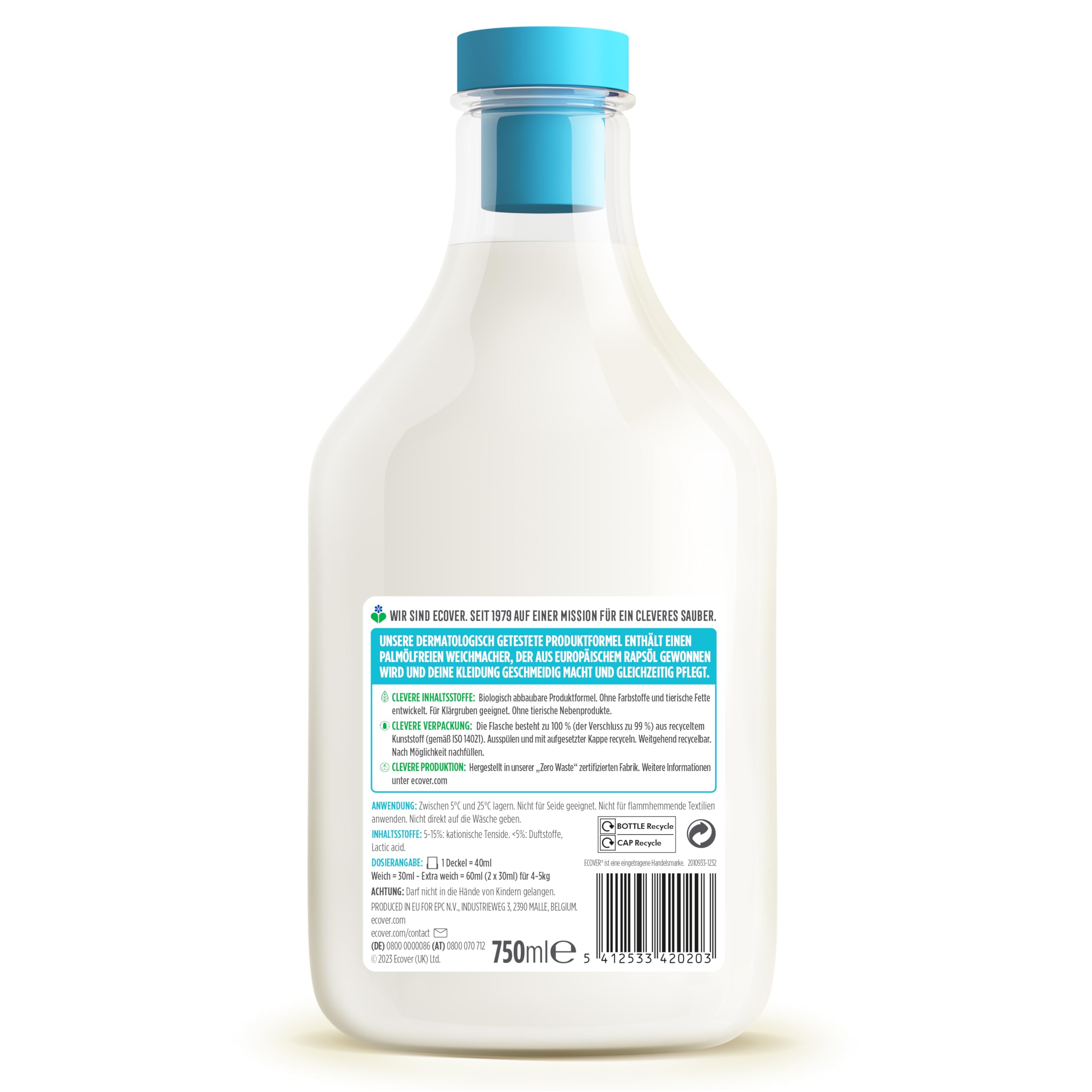 Ecover Weichspüler Apfelblüte & Mandel 5 L - Für wunderbar weiche Wäsche mit frischem DuftDer Ecover Weichspüler Apfelblüte & Mandel im 5 L Refill Kanister pflegt Wäsche sanft und erfrischt. Dabei ist er gut hautverträglich: Er ist erfolgreich dermatologisch getestet auf empfindlicher Haut. Die Aktivstoffe im ökologischen Weichspüler basieren auf europäischem Rapsöl und sind palmölfrei. Die Rezeptur ist vegan friendly, da pflanzenbasiert und alle Inhaltsstoffe ausser Mineralien sind biologisch abbaubar**. Auch die Verpackung ist nachhaltig, denn sie spart bei vergleichbarem Volumen 27 % Plastik gegenüber unseren 1,5 L Flaschen. Das 5 L Nachfüllpack des konzentrierten Flüssigwaschmittels reicht für 166 Waschladungen.Ecover ist einer der grössten Hersteller ökologischer Wasch- und Reinigungsmittel in Europa. Vor über 40 Jahren gegründet, war Ecover eines der ersten Unternehmen, das ein phosphatfreies Waschmittel vertrieb. Mit Innovationsgeist, Erfahrung und intelligenter Forschung hat Ecover Wasch- und Reinigungsmittel auf Pflanzenbasis und mit biologisch abbaubaren Inhaltsstoffen entwickelt, die Verbrauchern helfen, ihr Zuhause effektiv sauber zu halten. Die Ecover Fabrik in Malle, Belgien ist TRUE Zero Waste zertifiziert und nutzt erneuerbare Energien. Heute sind Ecover-Produkte in rund 40 Ländern erhältlich.Ecover - #letslivecleanDie Produktvorteile im Detail:Mit Duft nach Apfelblüte & MandelPflanzenbasierte FormelSorgt für frische, weiche Wäsche100 % Kanister (ausser Verschluss)100 % recycelbare VerpackungVegan Friendly, da pflanzenbasiertInhalt: 5 L / 166 Waschladungen*der Kanister besteht zu 100 % aus recyceltem Kunststoff (PCR). Die Kappe besteht zu 50 % aus recyceltem Kunststoff (PCR).**alle Inhaltsstoffe sind biologisch abbaubar (DID-List/OECD-Tests) ausser Mineralien