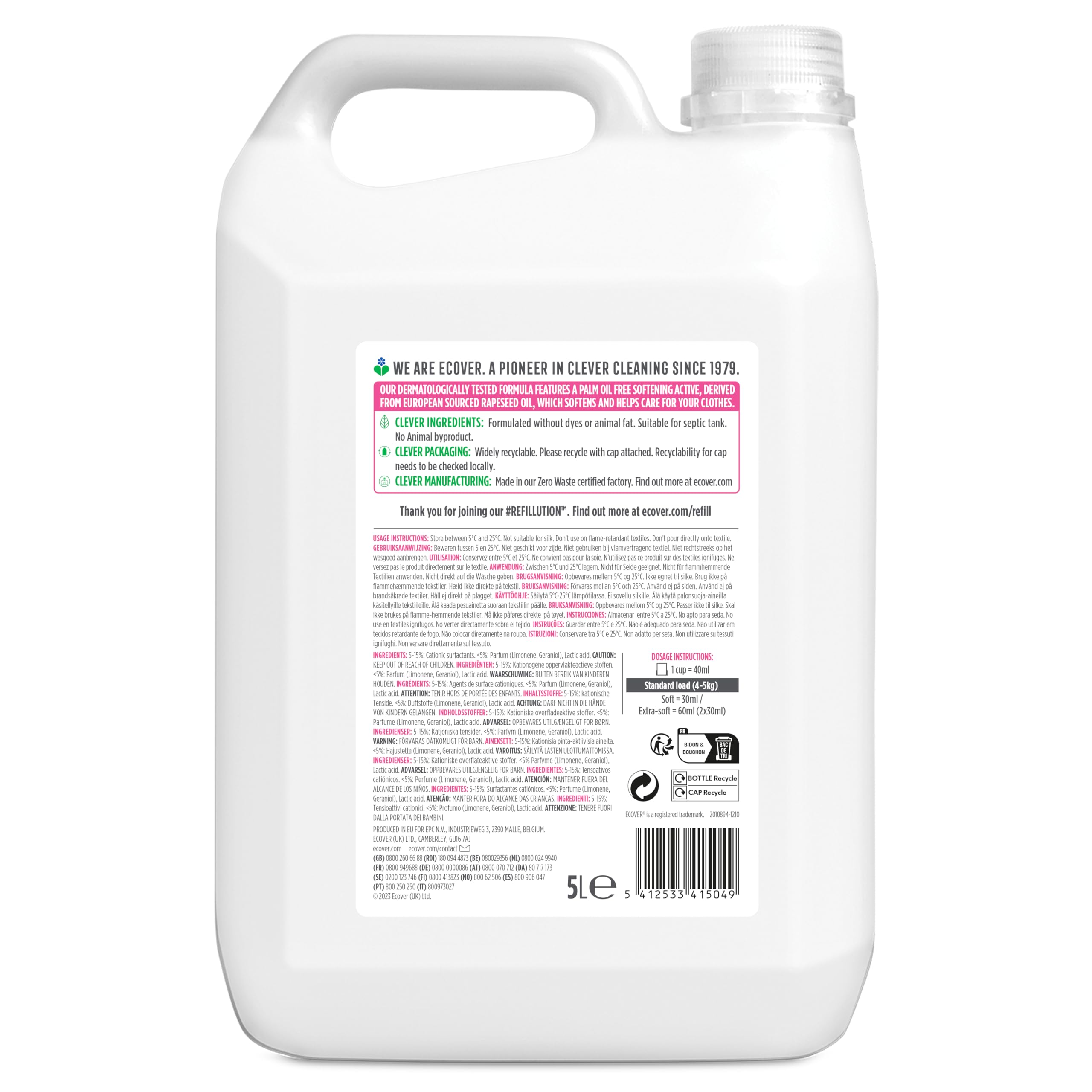 Ecover Weichspüler Nachfüllpack, sorgt für weiche und geschmeidige Wäsche, Apfelblüten- und Mandelduft, 166 Wäschen, 1 x 5L