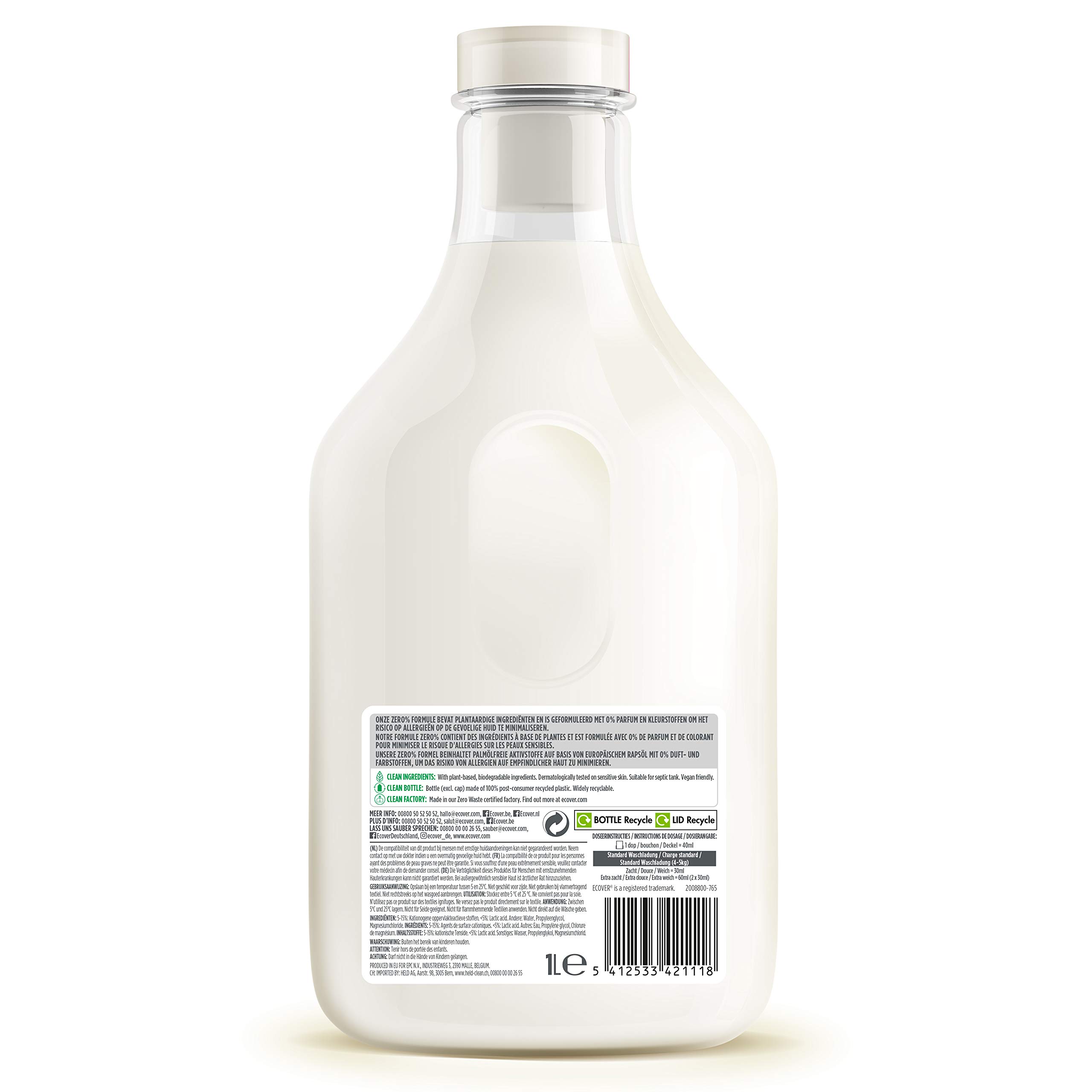 Ecover Zero Sensitive Weichspüler 1 L - Für natürlich weiche WäscheDer Ecover Zero Sensitive Weichspüler in der 1L Flasche macht Kleidung natürlich weich und sorgt für leichtes Bügeln. Der Weichspüler enthält weder Duftstoffe noch Farbstoffe und ist für Allergiker gut geeignet - dafür wurde er von Allergy UK erfolgreich getestet und zertifiziert. Ausserdem wurde der Weichspüler dermatologisch getestet auf empfindlicher Haut. Seine Formel basiert auf pflanzlichen, biologisch abbaubaren Inhaltsstoffen und Mineralien. Der Weichspüler ist vegan friendly, da pflanzenbasiert. Die 1 L Flasche der konzentrierten Formel reicht für 33 Waschladungen bei empfohlener Dosierung. Dafür ist die Flasche mit einer Dosierkappe ausgestattet.Ecover ist einer der grössten Hersteller ökologischer Wasch- und Reinigungsmittel in Europa. Vor über 40 Jahren gegründet, war Ecover eines der ersten Unternehmen, das ein phosphatfreies Waschmittel vertrieb. Mit Innovationsgeist, Erfahrung und intelligenter Forschung hat Ecover Wasch- und Reinigungsmittel auf Pflanzenbasis und mit biologisch abbaubaren Inhaltsstoffen entwickelt, die Verbrauchern helfen, ihr Zuhause effektiv sauber zu halten. Die Ecover Fabrik in Malle, Belgien ist TRUE Zero Waste zertifiziert und nutzt erneuerbare Energien. Heute sind Ecover-Produkte in rund 40 Ländern erhältlich.Ecover - #letslivecleanDie Produktvorteile im Detail:Pflanzenbasierte FormelSorgt für weiche Wäsche und leichtes BügelnOhne Duftstoffe, ohne FarbstoffeMindestens 50 % recycelte Flasche (ausser Kappe)Leicht recycelbare VerpackungVegan Friendly, da pflanzenbasiertInhalt: 1 L / 33 Waschladungen
