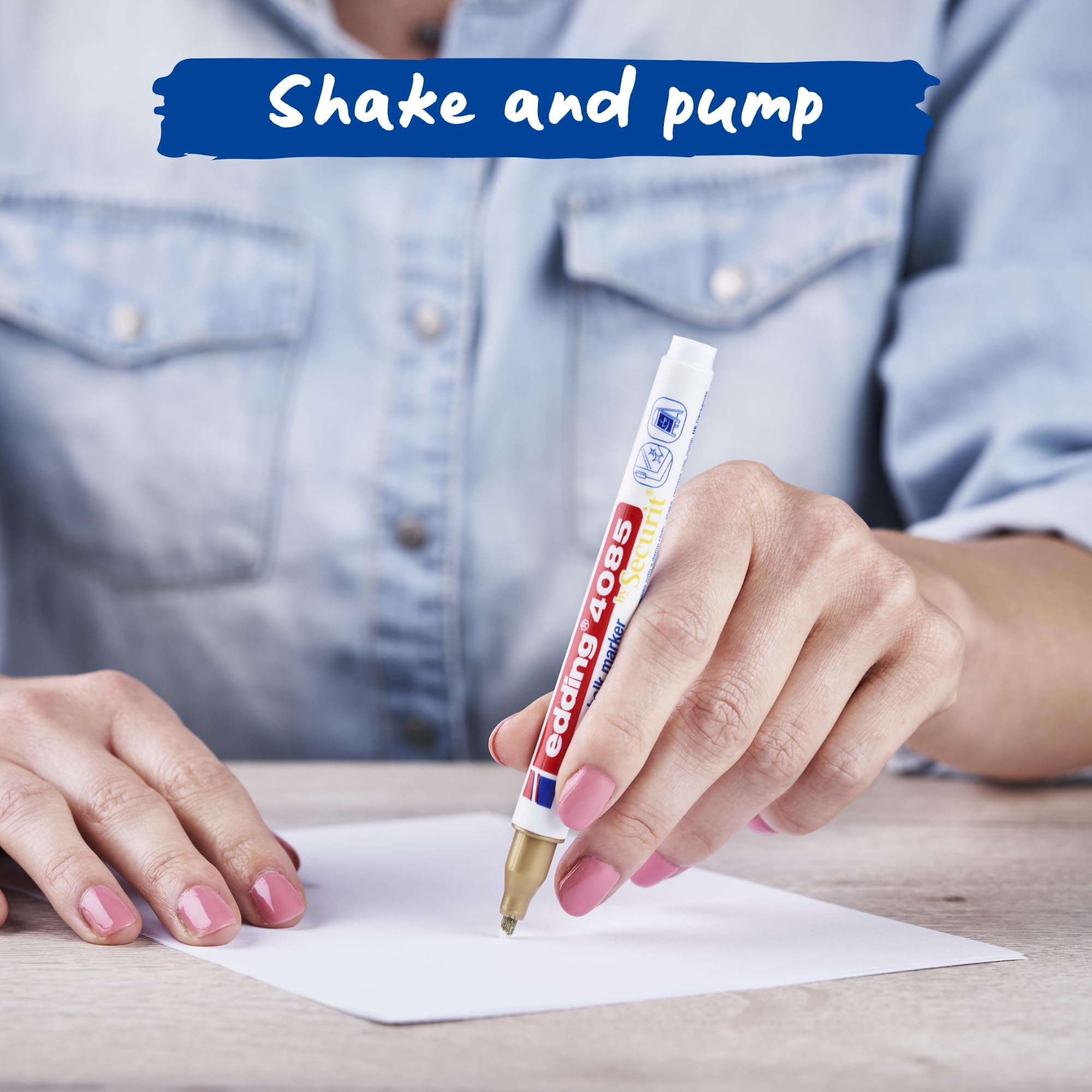 Die Flüssigkreide im Markerformat ermöglicht eine einfachere Handhabung als herkömmliche Kreide. Professionelle und elegante Schriftbilder sind mit dem edding Kreidemarker sehr leicht zu gestalten. Die Hände bleiben sauber. Es stehen 20 brillante Farben zur Auswahl. Neon-orange und neon-pink leuchten unter UV-Licht. Mit der dünnen Schriftbreite können Akzente gesetzt und kleine Flächen beschriftet werden. Der edding Kreidemarker ist ein beliebtes Werkzeug in Restaurants, Einzelhandel oder Automobilverkauf. Überall da wo gut eine präzise Gestaltung benötigt wird. Zu Hause können auch zu jeder Jahreszeit und für jeden Anlass bspw. Fenster verziert werden. Die Fläche kann entweder frei oder mit Hilfe einer Vorlage gestaltet werden. Dafür die Vorlage hinter das Fenster kleben und anschliessend die Motive in der gewünschte Farbe nachzeichnen. Auf der edding Website können dafür eine Vielzahl an Schablonen heruntergeladen werden. Vor der ersten Nutzung bitte den Marker wie folgt aktivieren: Marker mit geschlossener Kappe und der Spitze nach oben schütteln, anschliessend die Kappe abnehmen. Marker mit der Spitze nach unten, beispielsweise auf einem Stück Testpapier, anpumpen. Vorsichtig auf- und abpumpen, bis die Farbe die Spitze füllt. Der Marker ist jetzt anwendungsbereit. Die Spitze sollte nicht überpumpt werden, um Nasen im Schriftbild zu vermeiden. Sollte doch eine Korrektur notwendig sein, einfach mit einem feuchten Tuch die Tinte abwischen. Bei empfindlichen Materialien (z. B. plexiglas®) empfehlen wir, vorher einen Test an einer unauffälligen Stelle durchzuführen. Waagerecht lagern. Hochwertiges Markenprodukt.