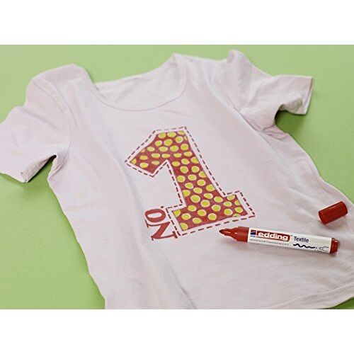 Kreieren Sie ihre eigenen Styles mit den edding 4500 Textilmarkern und edding 4600 Textilstiften. Schreiben, Logos kreieren, Muster und Dekorationen zeichnen oder Kinder-T-Shirts bemalen – mit den edding Textilmarkern sind Textildesigns kinderleicht möglich. Die leuchtenden Farben machen aus all dem einzigartige kleine Kunstwerke ohne zu verblassen. Vor dem Bemalen ein Stück Karton unter den Stoff legen, um sicherzustellen, dass die Tinte nicht durch das Material schlägt. Den Stoff mit doppelseitigem Klebeband befestigen, um auf einer rutschfesten und festen Oberfläche arbeiten zu können. Zuerst die Konturen zeichnent und nach dem Trocknen ausmalen. Nach der Gestaltung kann die aufgetragene Textilfarbe durch einmaliges Bügeln dauerhaft haltbar gemacht werden (ohne Dampf). Dann ist das Ergebnis waschfest bis 60 °C. Die Kappe kann am Ende des Schafts aufgesteckt werden. Marker waagerecht lagern. Hochwertiges Markenprodukt. Made in Germany.