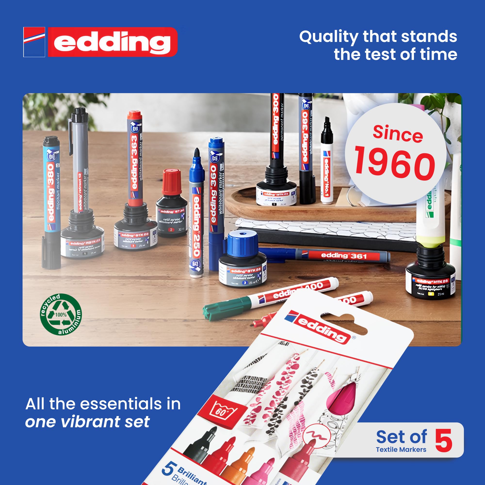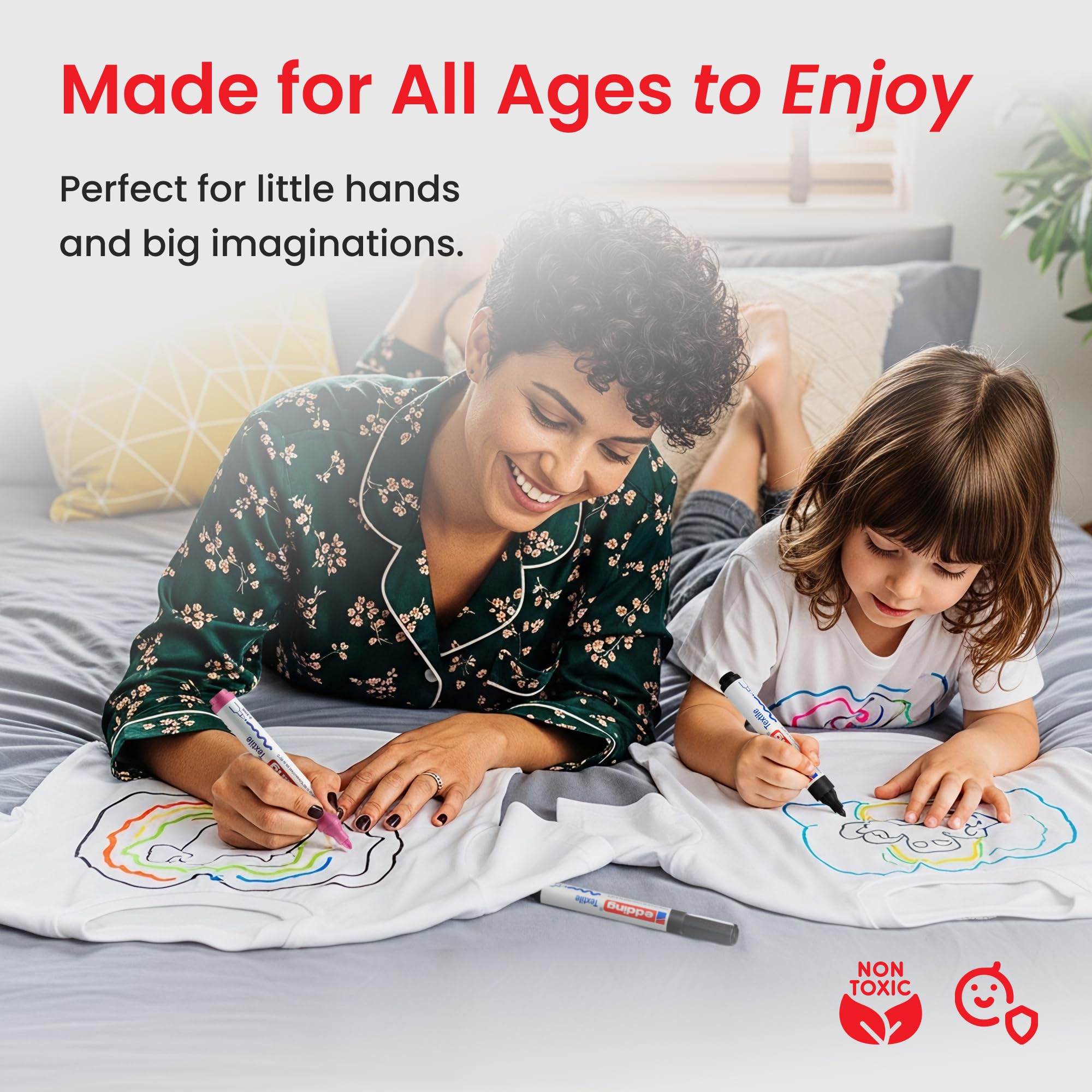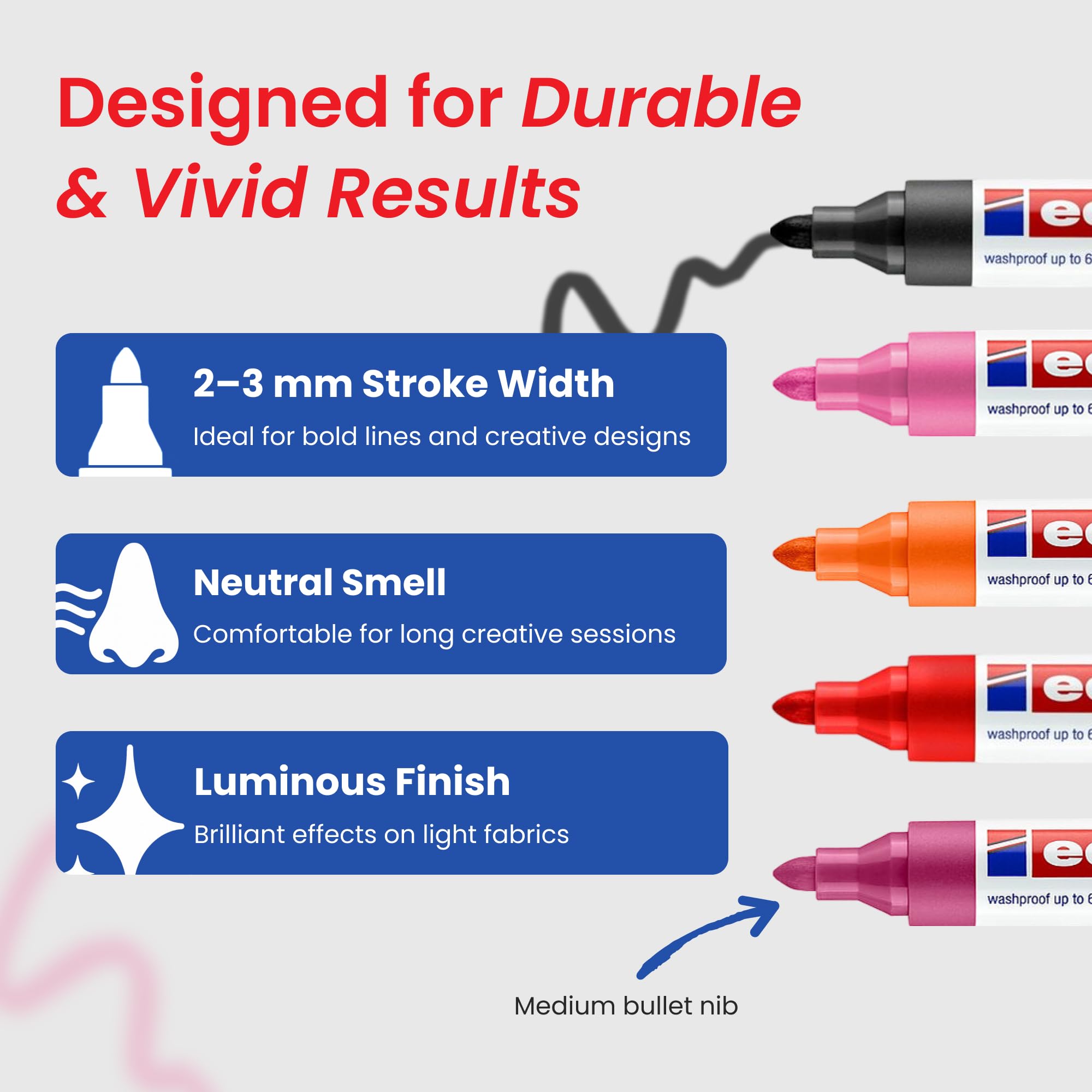 Kreieren Sie ihre eigenen Styles mit den edding 4500 Textilmarkern und edding 4600 Textilstiften. Schreiben, Logos kreieren, Muster und Dekorationen zeichnen oder Kinder-T-Shirts bemalen – mit den edding Textilmarkern sind Textildesigns kinderleicht möglich. Die leuchtenden Farben machen aus all dem einzigartige kleine Kunstwerke ohne zu verblassen. Vor dem Bemalen ein Stück Karton unter den Stoff legen, um sicherzustellen, dass die Tinte nicht durch das Material schlägt. Den Stoff mit doppelseitigem Klebeband befestigen, um auf einer rutschfesten und festen Oberfläche arbeiten zu können. Zuerst die Konturen zeichnent und nach dem Trocknen ausmalen. Nach der Gestaltung kann die aufgetragene Textilfarbe durch einmaliges Bügeln dauerhaft haltbar gemacht werden (ohne Dampf). Dann ist das Ergebnis waschfest bis 60 °C. Die Kappe kann am Ende des Schafts aufgesteckt werden. Marker waagerecht lagern. Hochwertiges Markenprodukt. Made in Germany.