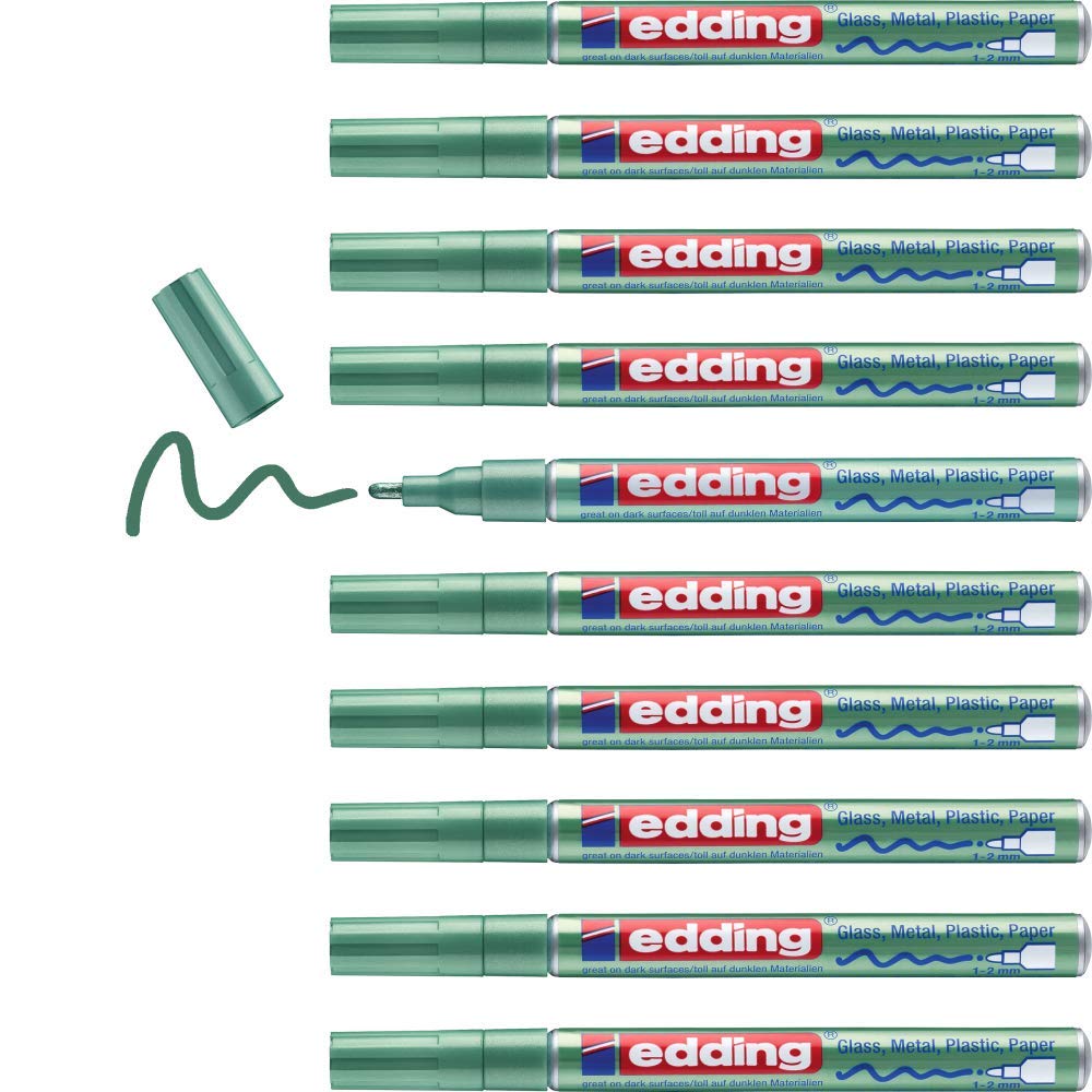 edding 751 Glanzlackmarker - grün-metallic - 10 Lackmarker - Rundspitze 1-2 mm - Lackstift für Glas, Stein, Holz, Kunststoff und Papier - wasserfest, stark deckend