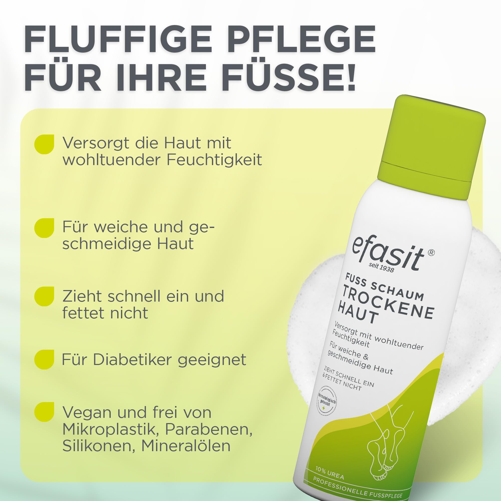 Der efasit Fussschaum wurde speziell entwickelt, um trockene Haut an den Füssen zu reduzieren und die Haut intensiv zu pflegen. Die praktische Schaumformel sorgt dafür, dass die Haut sofort mit Feuchtigkeit versorgt wird, ohne die Poren zu verstopfen. Durch die regelmässige Anwendung wird die Haut weicher, glatter und geschmeidiger, wodurch Sie ein rundum gepflegtes Gefühl erleben.