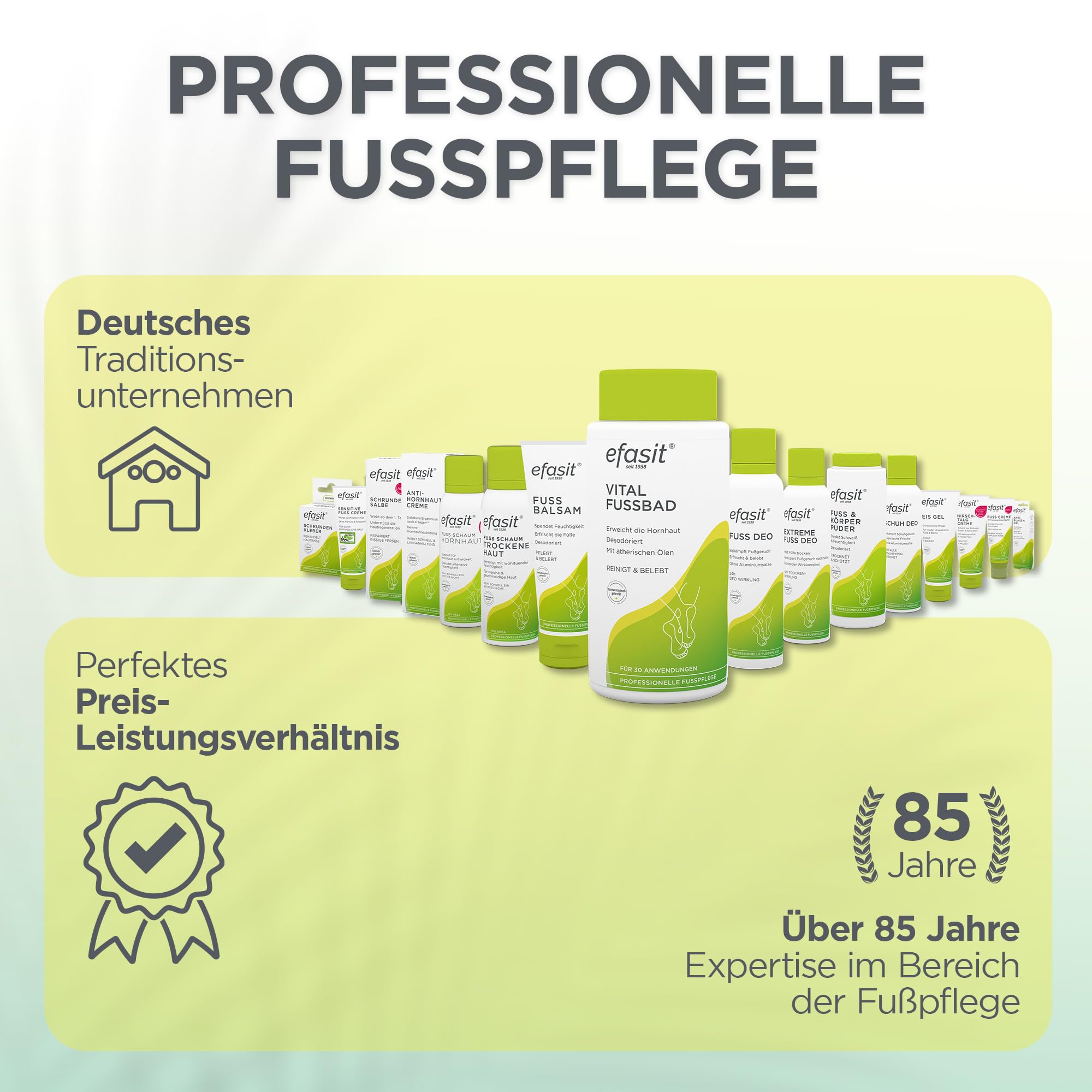 Unsere Füsse leisten täglich Schwerstarbeit. Seit über 85 Jahren bietet efasit hochwertige und professionelle Fusspflegeprodukte für Zuhause an. Mit innovativen und wirksamen Pflegeprodukten decken wir die unterschiedlichen Bedürfnisse der Fusspflege und Hauttypen ab. Vertrauen Sie auf unsere Erfahrung und Expertise für die optimale Pflege Ihrer Füsse.