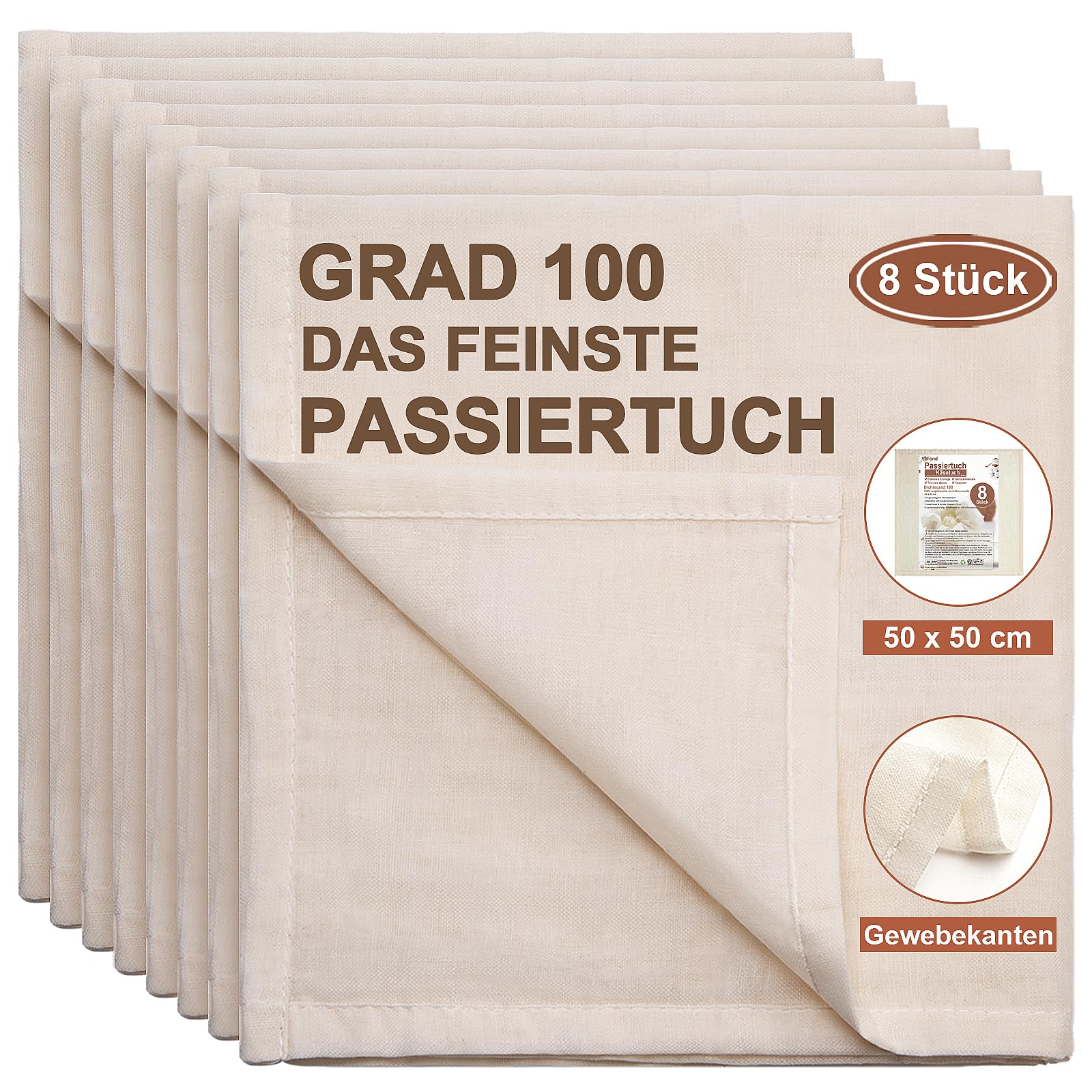eFond Passiertuch, 8 Stück 50x50cm Käsetuch Feingewebt Dichtegrad 100 Cheesecloth Ungebleichte Reine Baumwolle mulltuch mit Sauber Umgeschlagene Saum, Seihtuch Waschbar und Wiederverwendbar