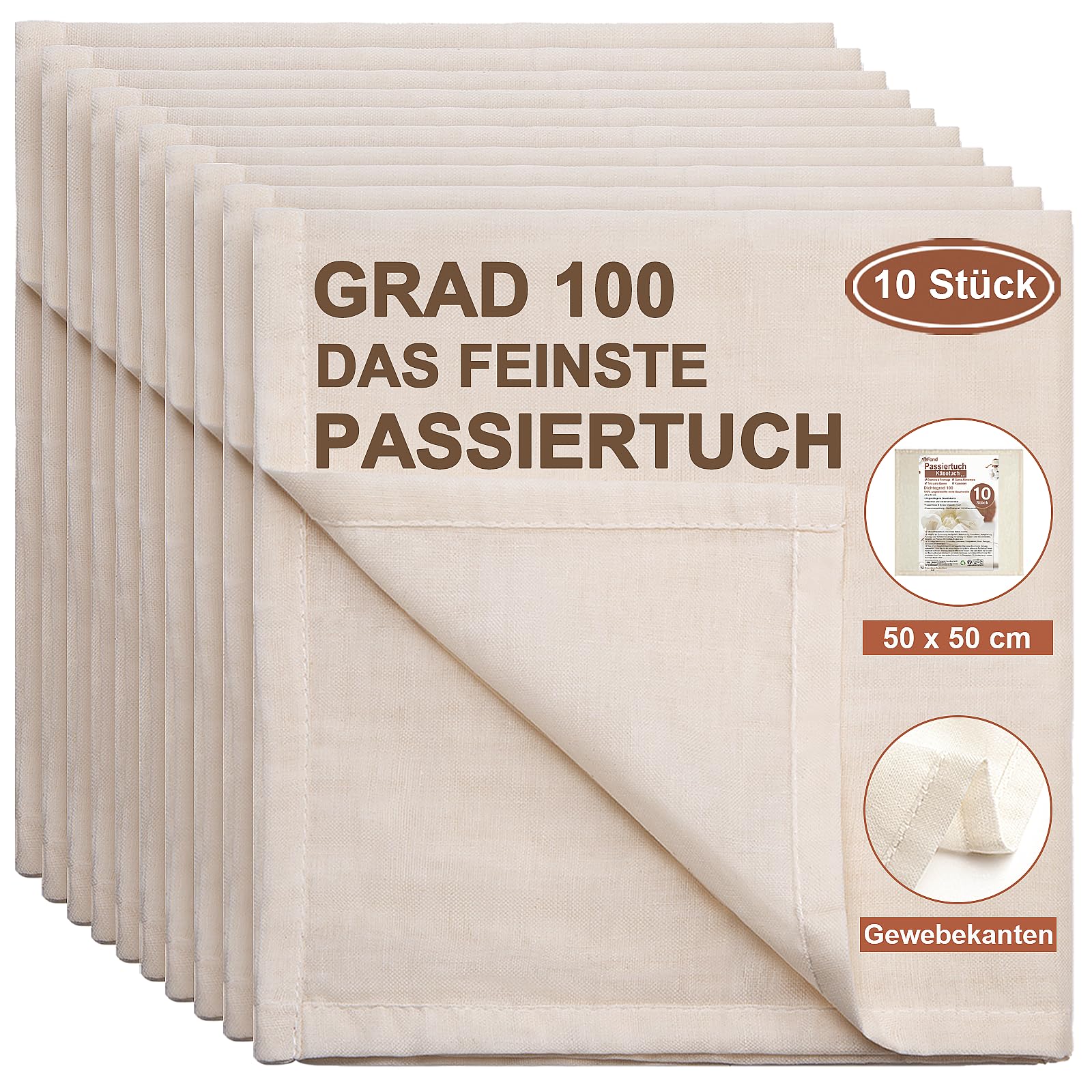 eFond Passiertuch, 10 Stück 50x50cm Käsetuch Feingewebt Dichtegrad 100 Cheesecloth Ungebleichte Reine Baumwolle mulltuch mit Sauber Umgeschlagene Saum, Seihtuch Waschbar und Wiederverwendbar