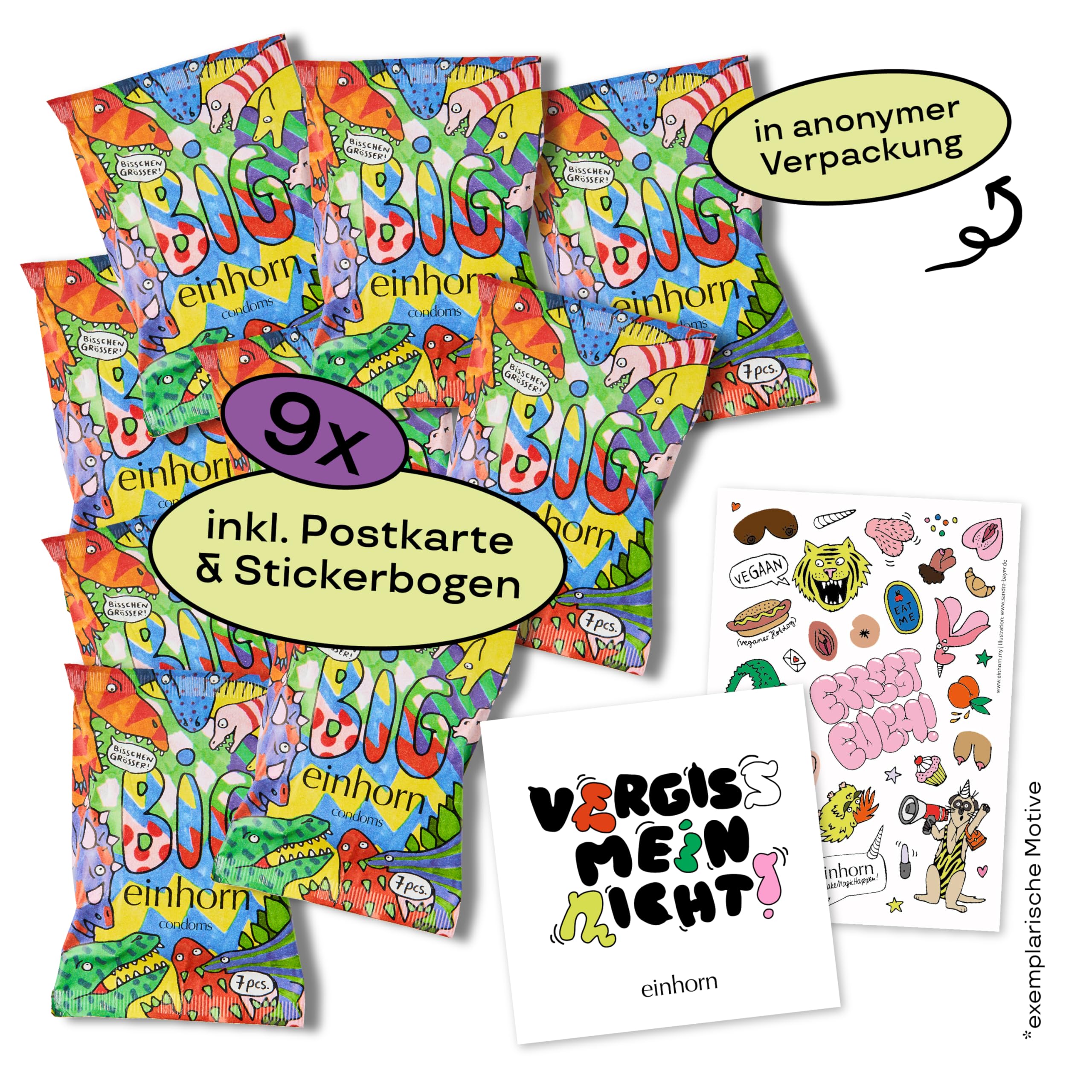 einhorn Kondome - 63 Kondome BIG Geschenk Special - Super Tyrannosaurus - XL-Grösse 57 mm - vegane, hormonfreie Verhütung - natürlicher Gleitfilm - nachhaltig und sicher