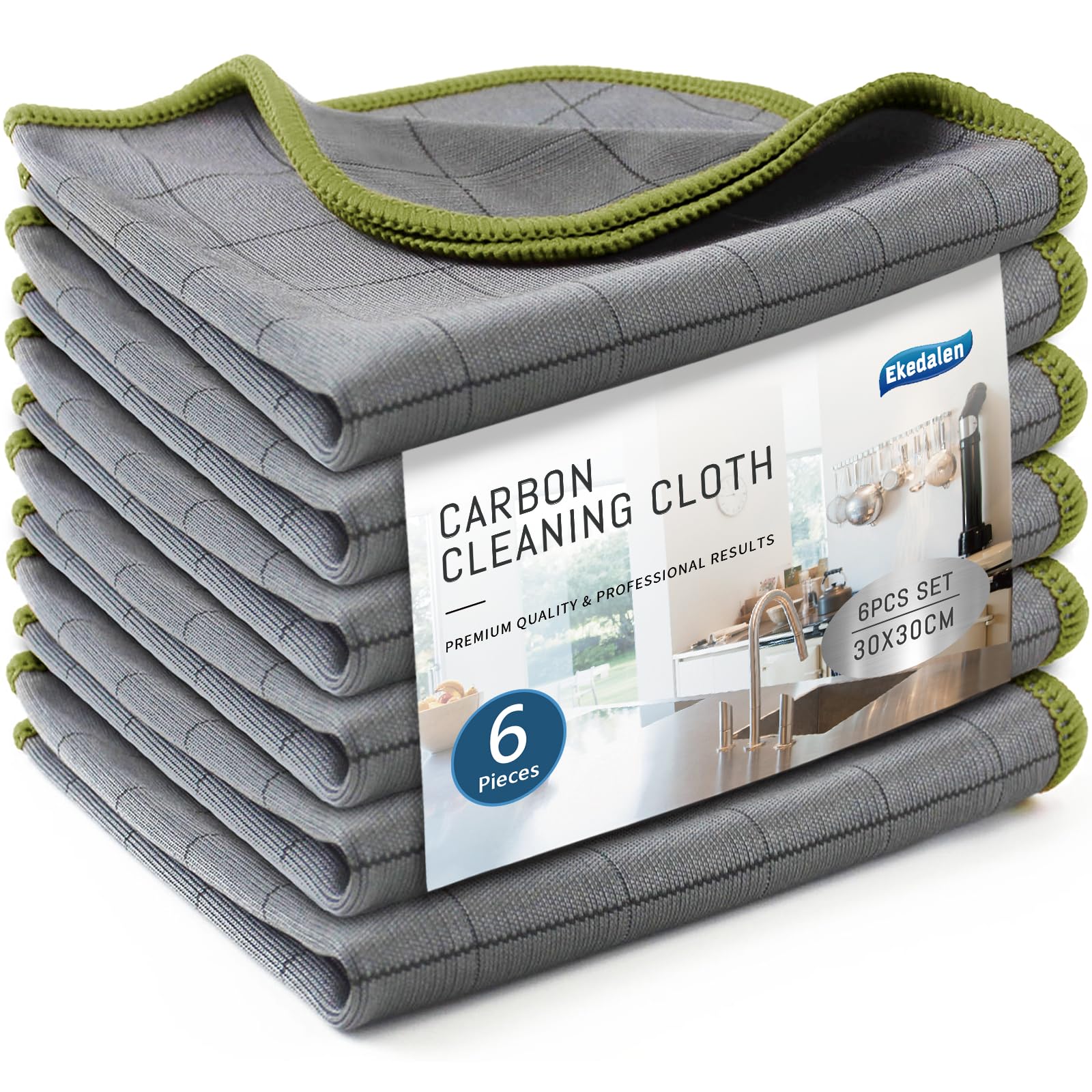 Ekedalen 6X Fensterputztücher Carbon Tücher, Reinigungstücher für Kristallklare & Streifenfreie Scheiben, Mikrofaser Putztücher, Fusselfreies Poliertuch, 30x30 cm Glastücher, Grün