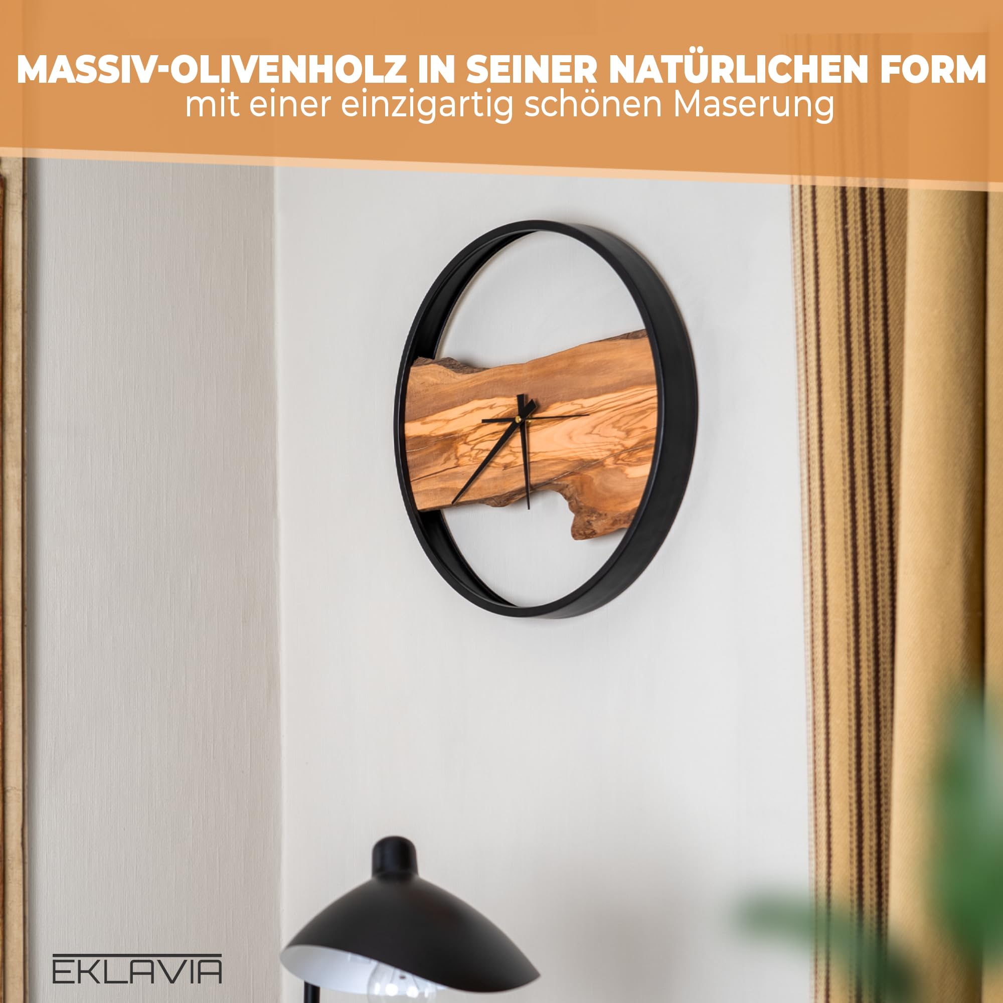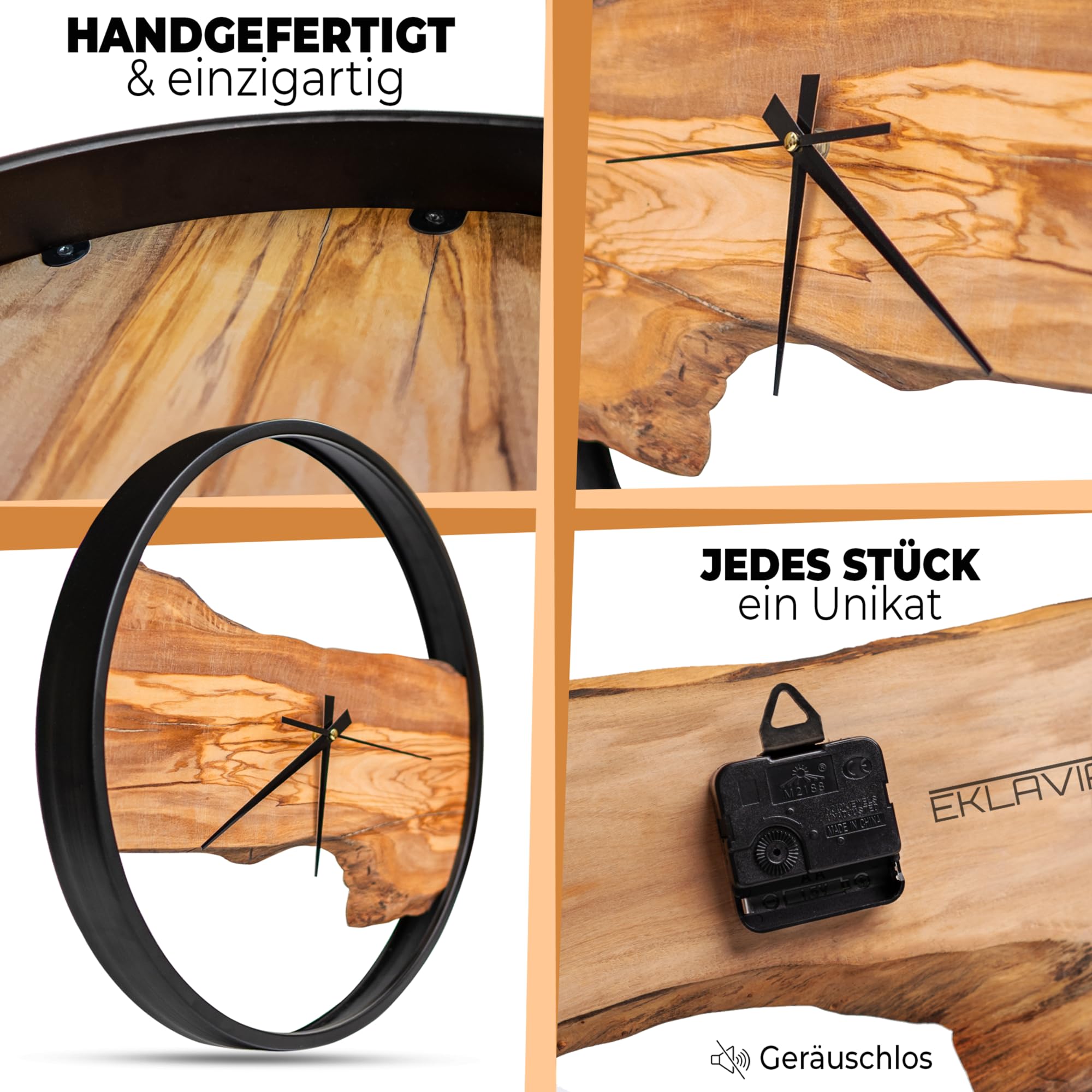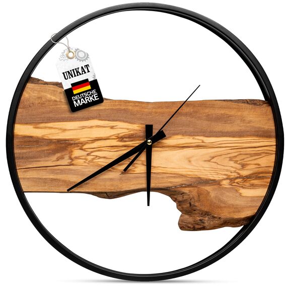 Eklavia Wanduhr Holz – Olivenholz, geräuschlos ohne Tickgeräusche, gross (Ø 42 cm) – 1× Holzeinlage (Mitte) – Modern – Handgefertigtes Unikat