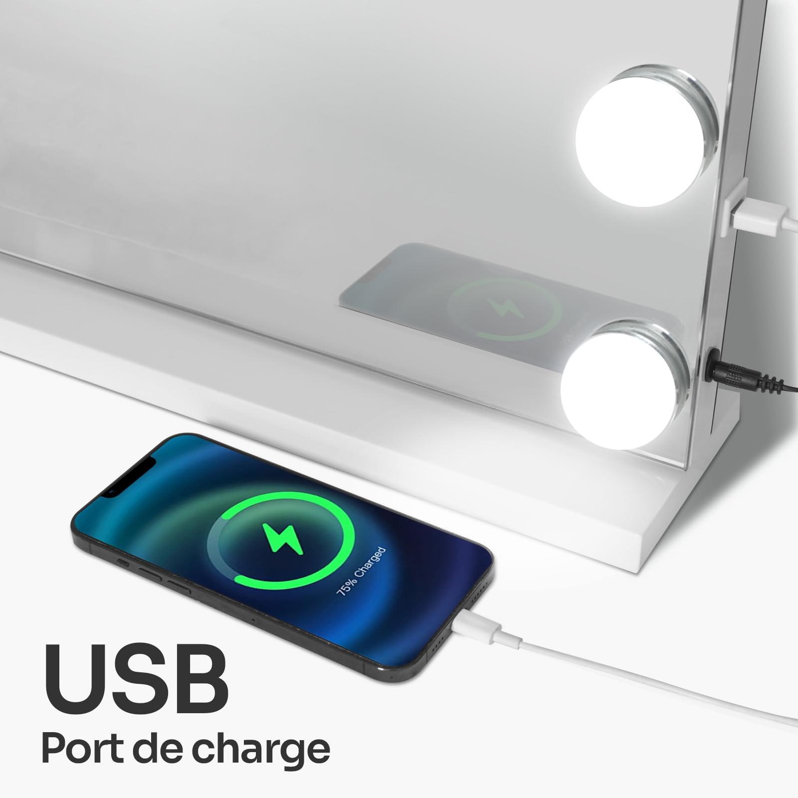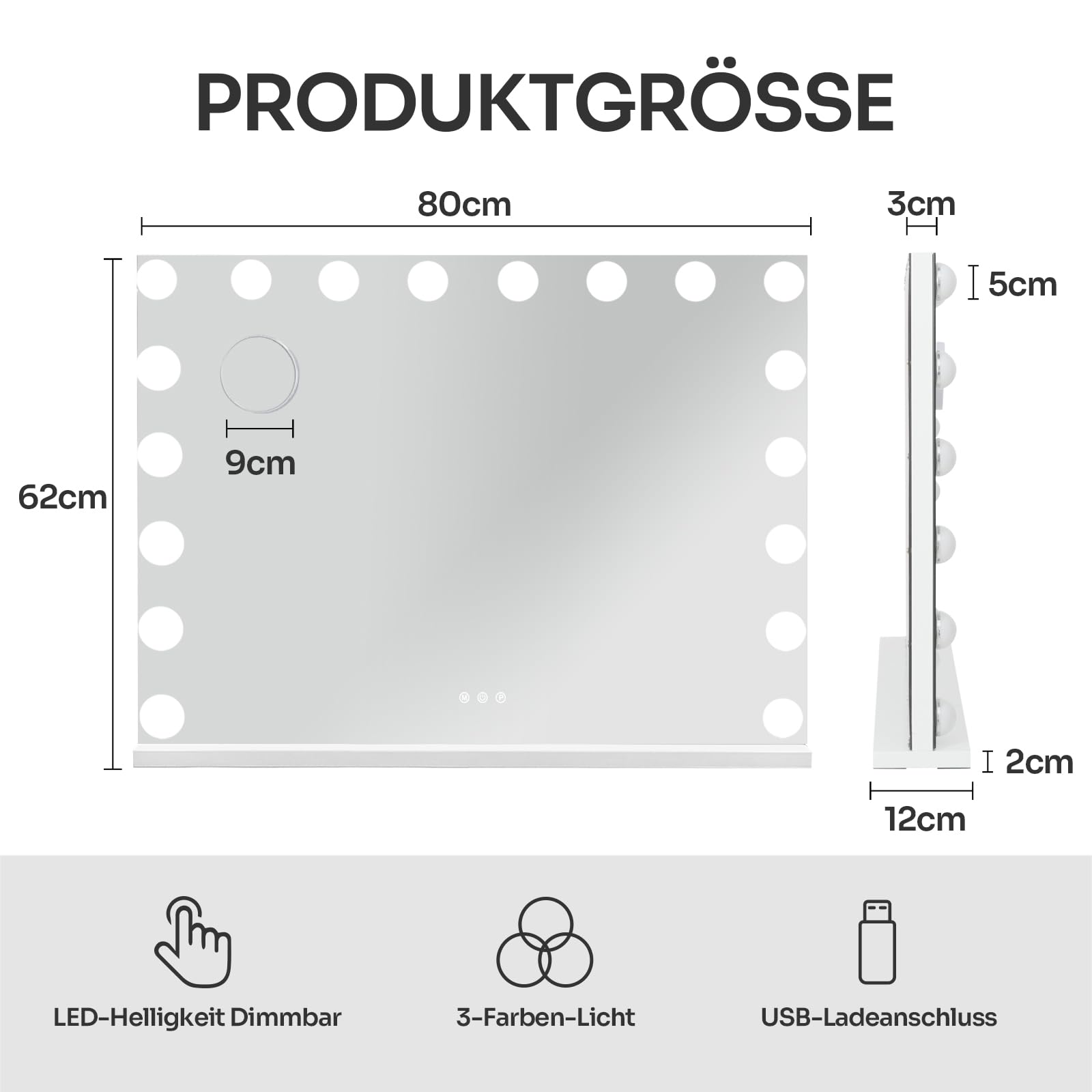 eklipt Schminkspiegel mit Beleuchtung 80x60cm Hollywood Spiegel mit Beleuchtung Kosmetikspiegel 18 LED Licht 3 Lichtfarben mit USB 10X Vergrösserung Touch Control Tischplatte (18LED-Weiss)